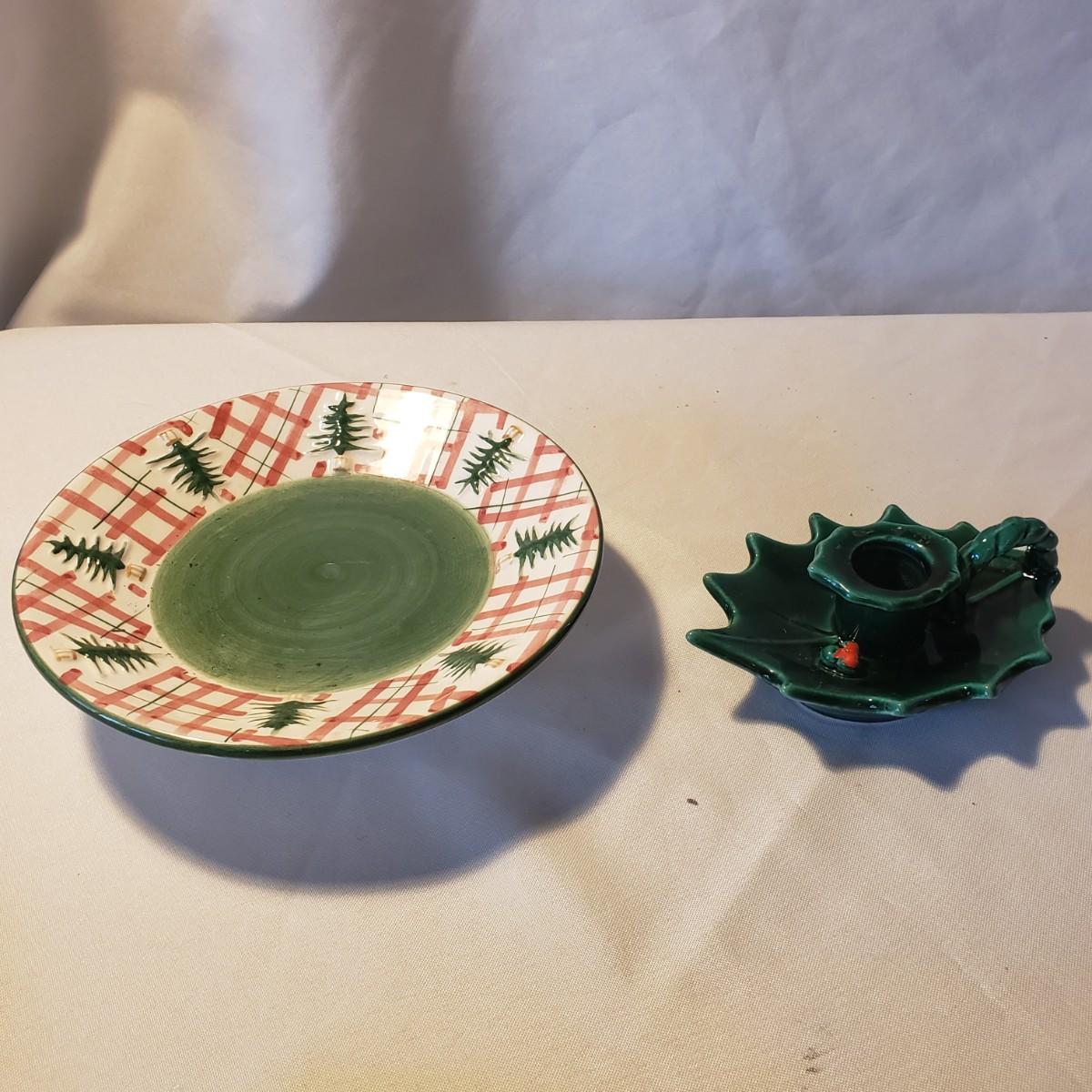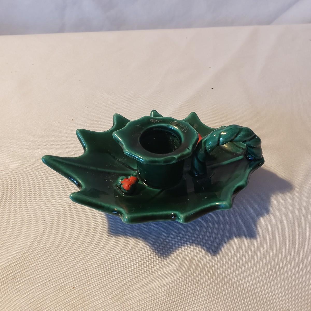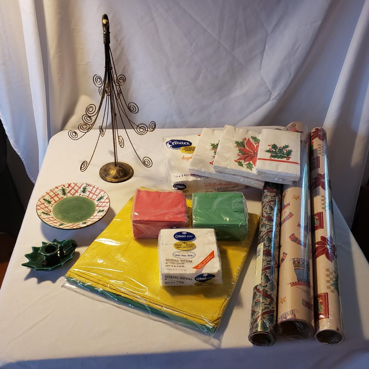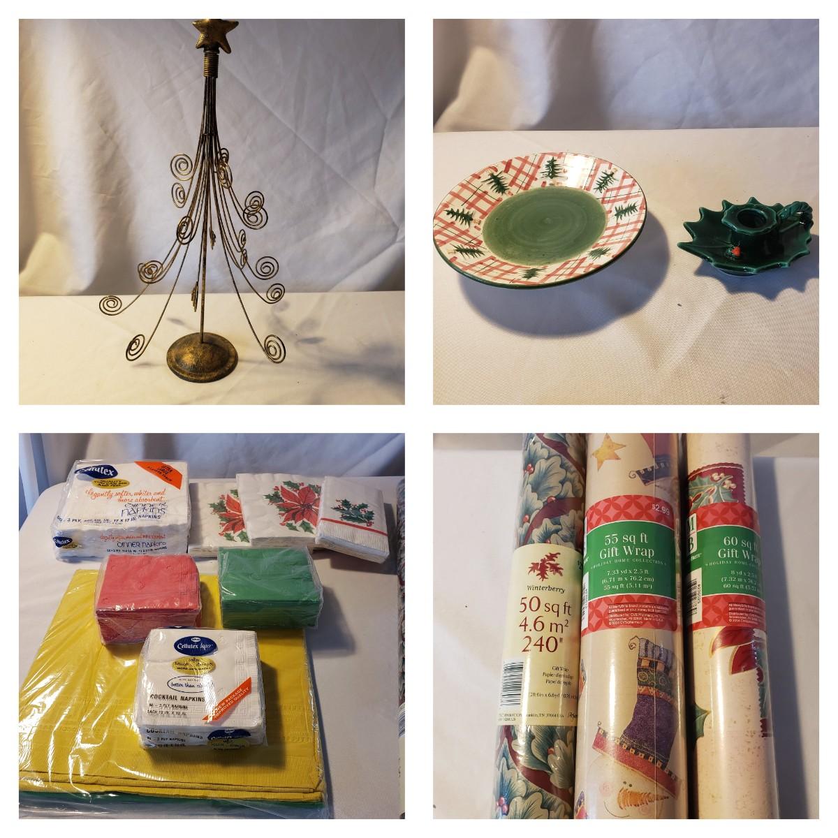 This holiday lot contains NIB paper products, two ceramic candle holders and a metal tree that can hold cards or pictures. The metal tree measures 4" x 18"H. The bottom base is weighted. The ceramic dish measures approximately 7" x 2"H. The holly leaf candlestick is made by Lefton from Japan.