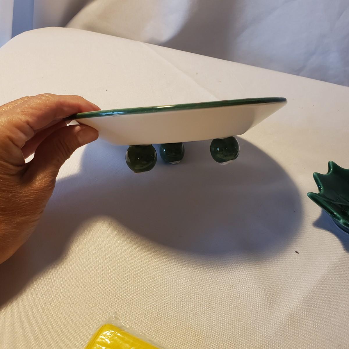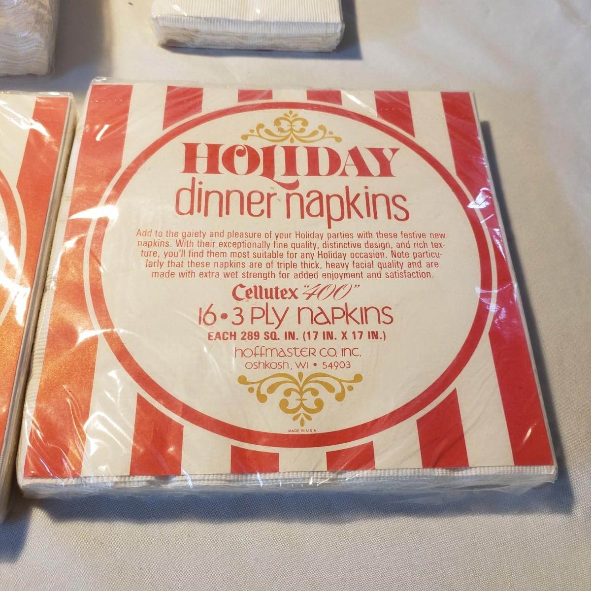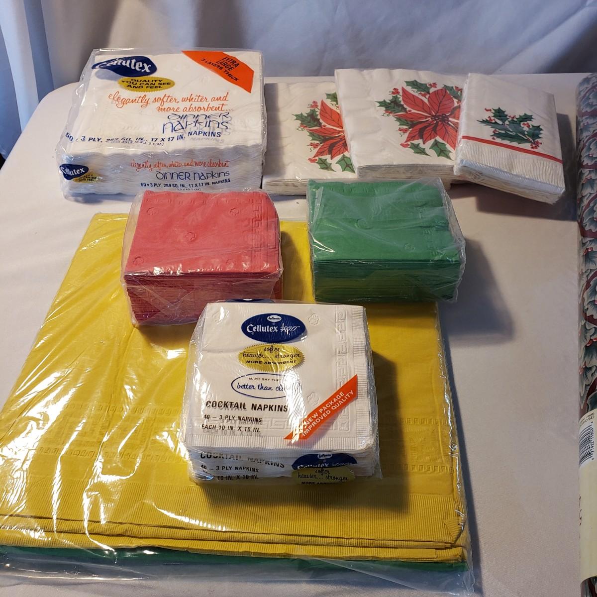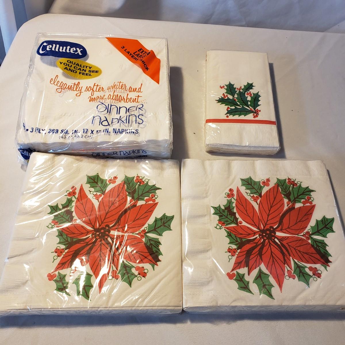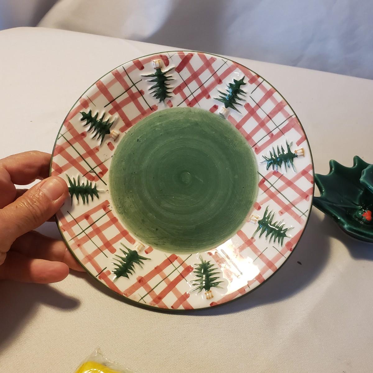 This holiday lot contains NIB paper products, two ceramic candle holders and a metal tree that can hold cards or pictures. The metal tree measures 4" x 18"H. The bottom base is weighted. The ceramic dish measures approximately 7" x 2"H. The holly leaf candlestick is made by Lefton from Japan.