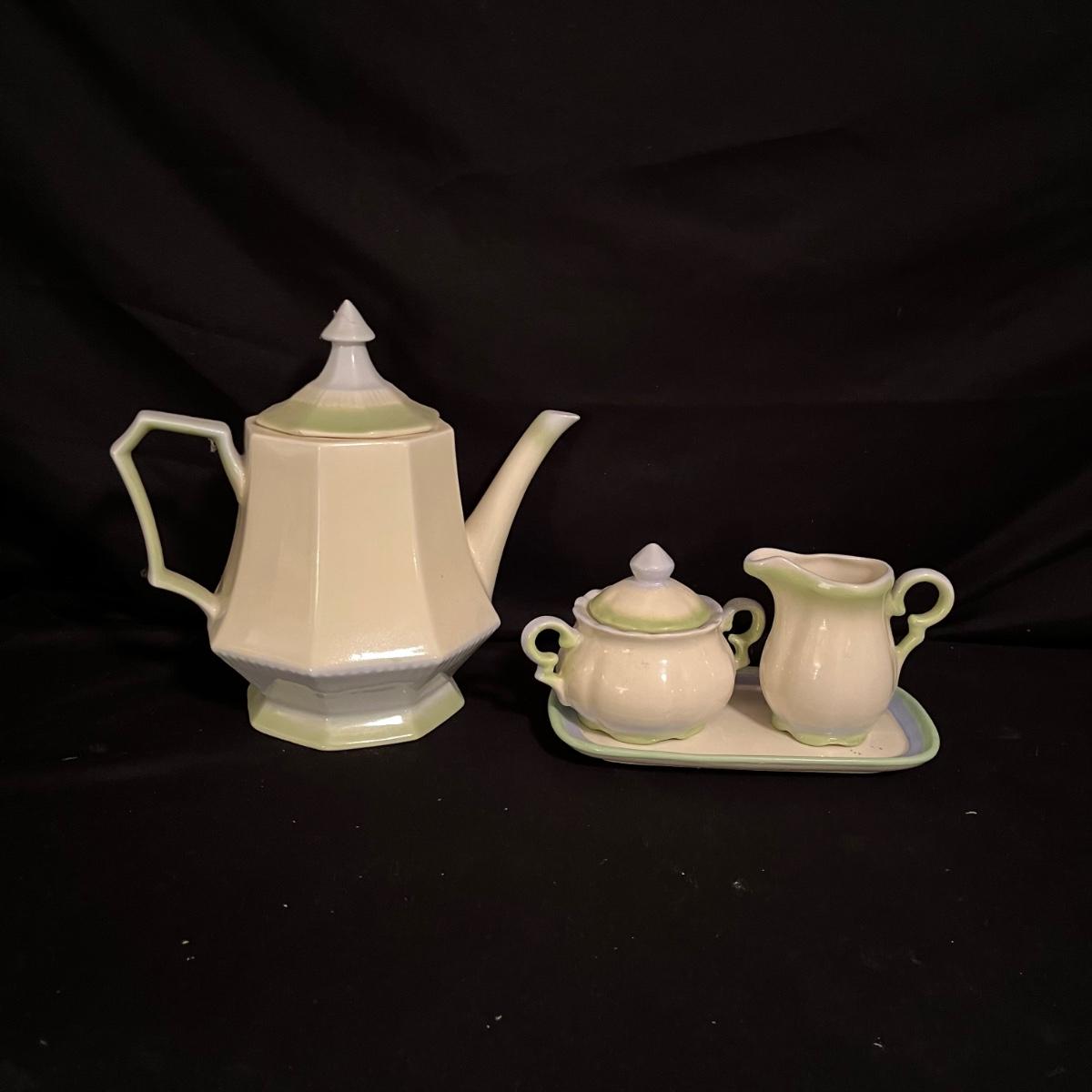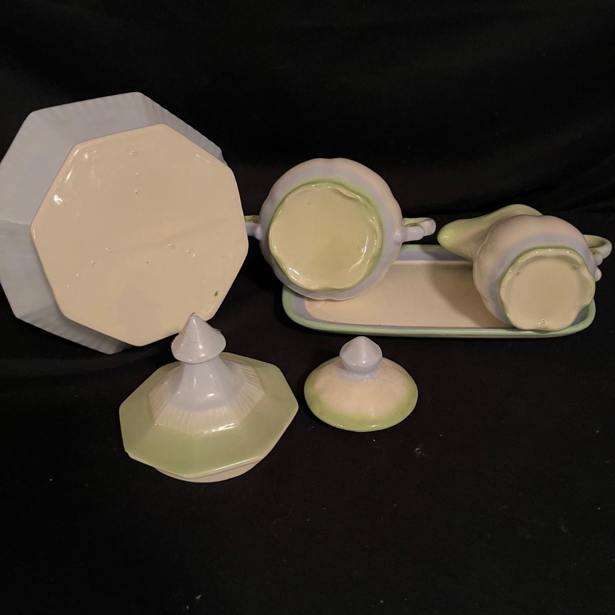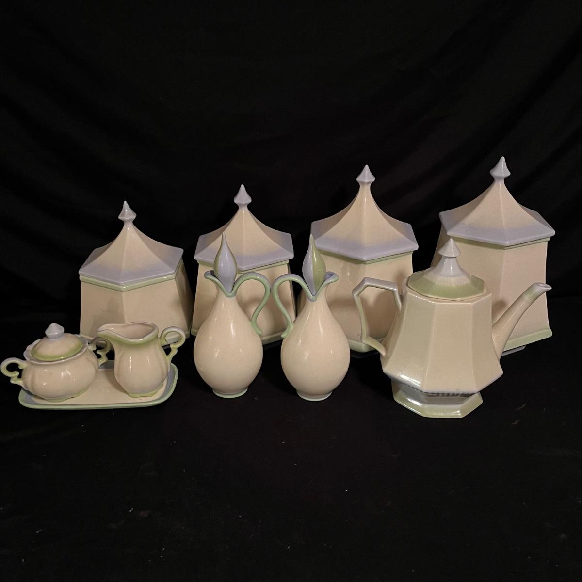 Lot includes four canisters, teapot, sugar bowl, creamer and tray and two salad dressing bottles. Largest canister measures 7.5”D x 12” tall.
