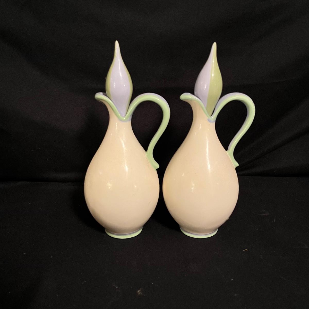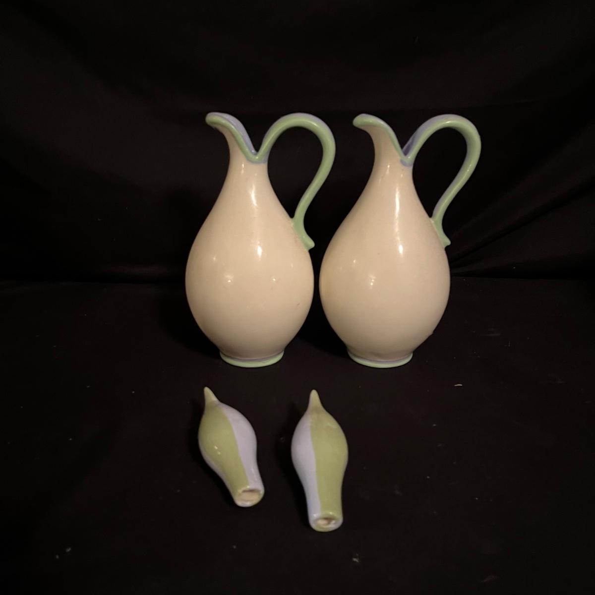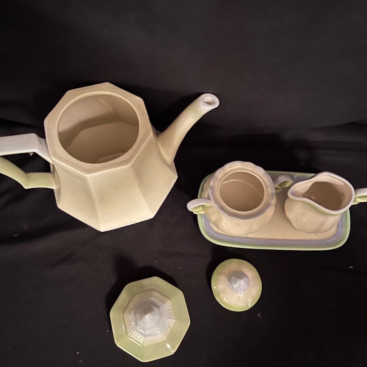 Lot includes four canisters, teapot, sugar bowl, creamer and tray and two salad dressing bottles. Largest canister measures 7.5”D x 12” tall.