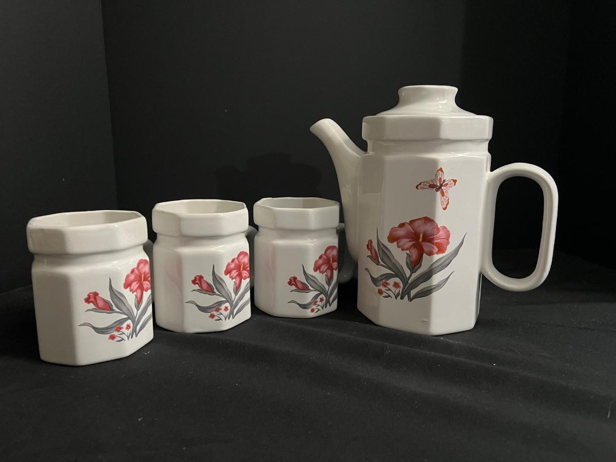 Floral and butterfly design. 3 cups and 1 carafe
