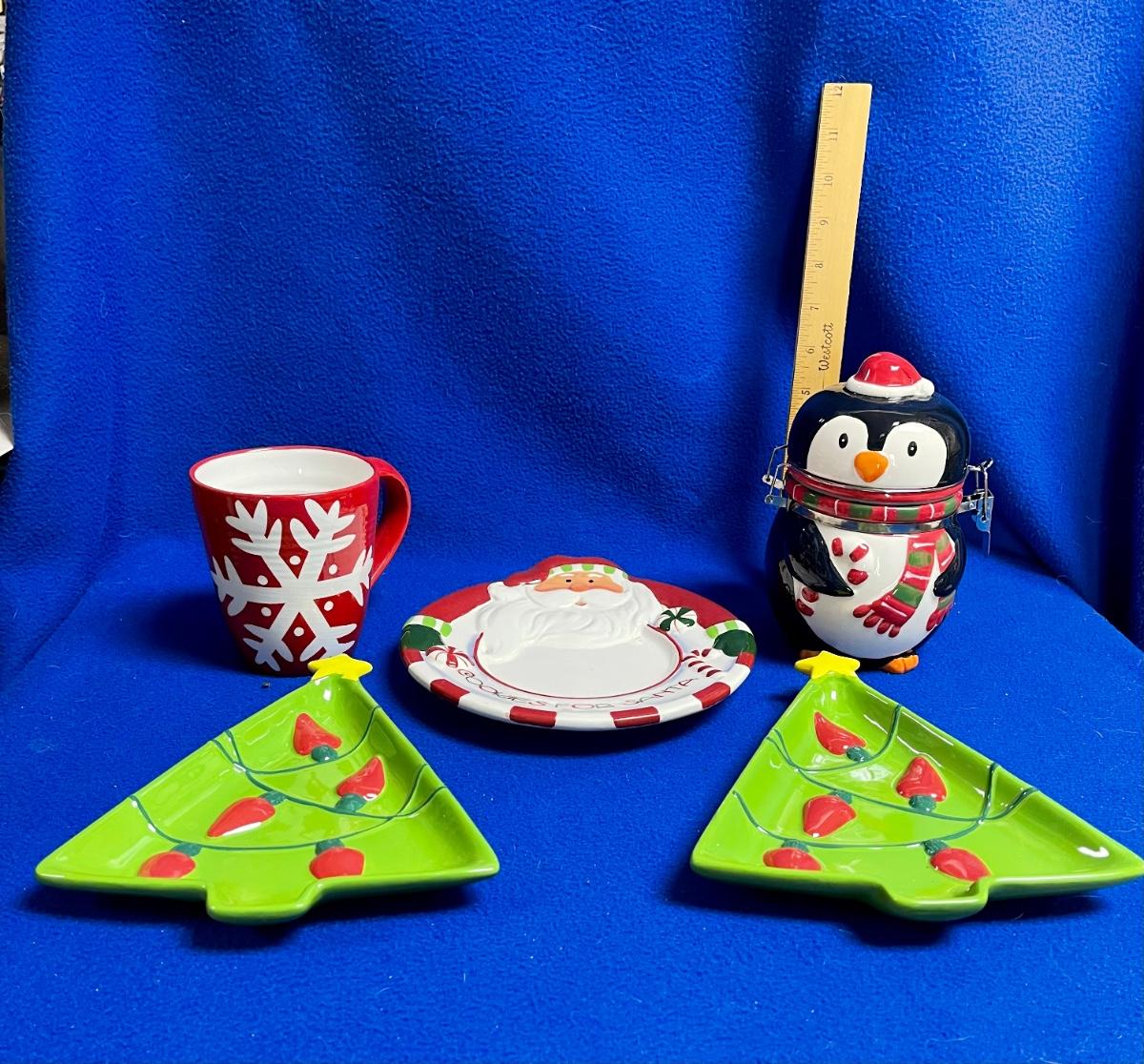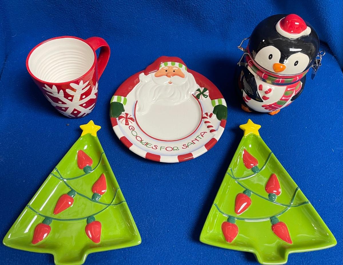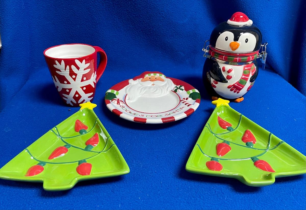 Ceramic Christmas Decor Lot - serving dishes, canister, cup - snowflakes, trees, penguin, Santa