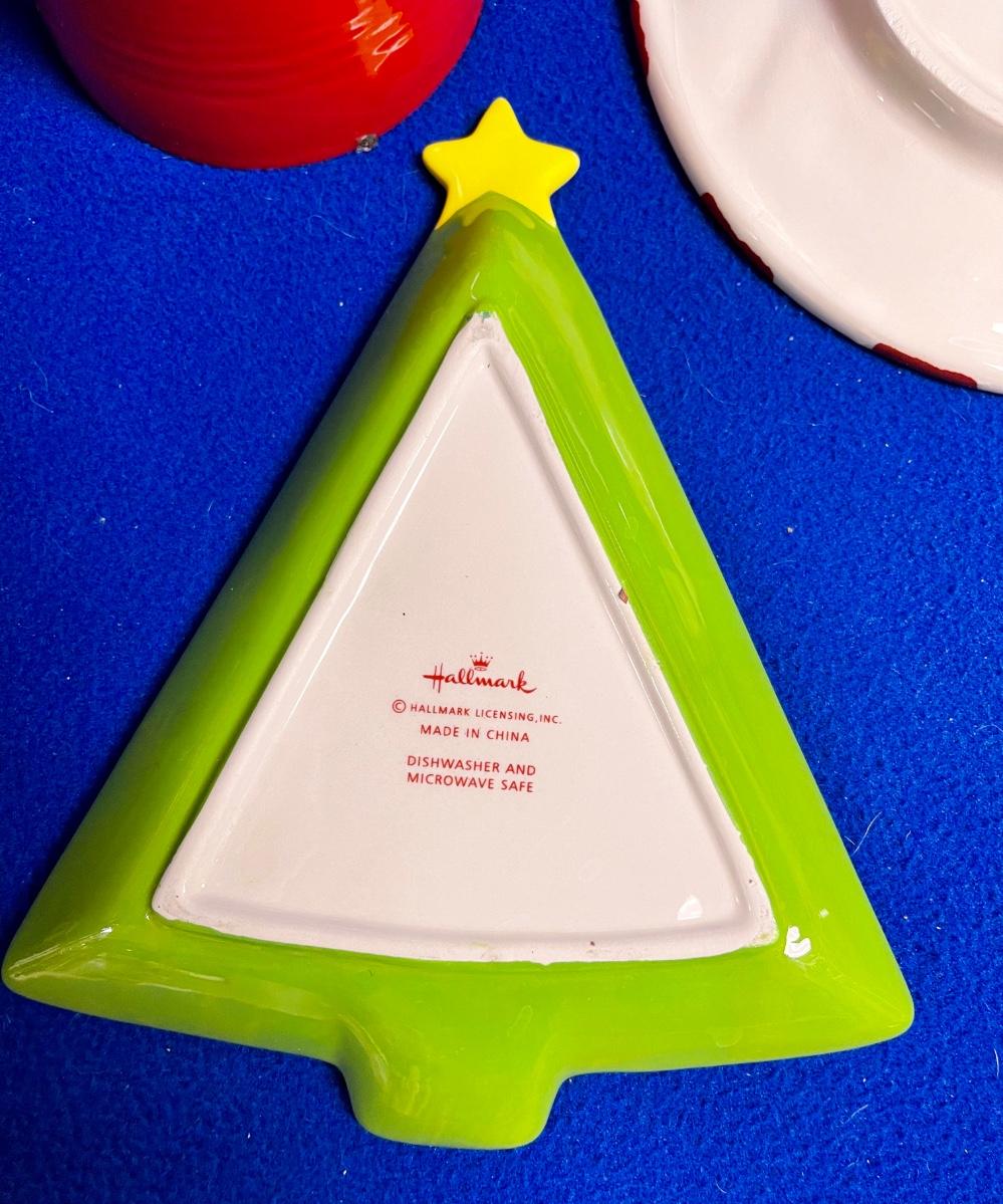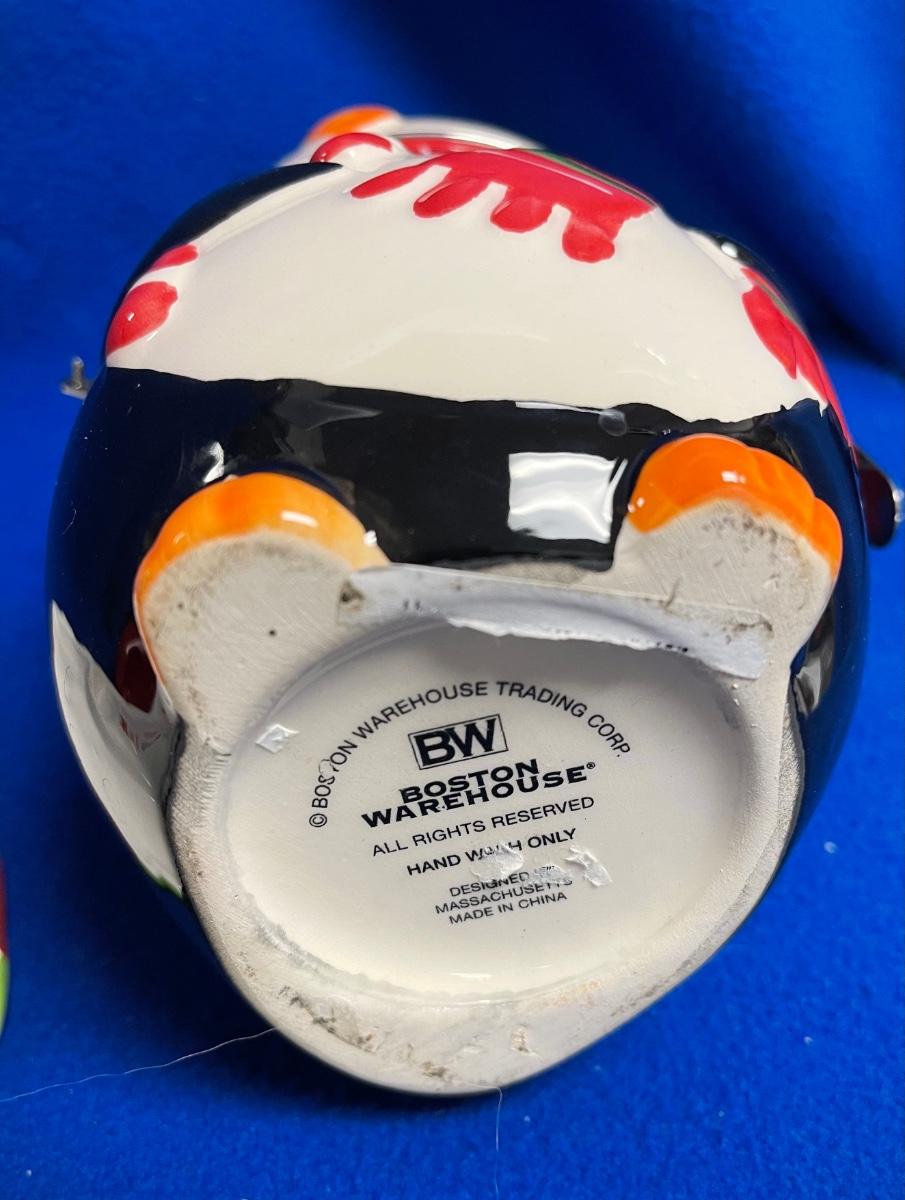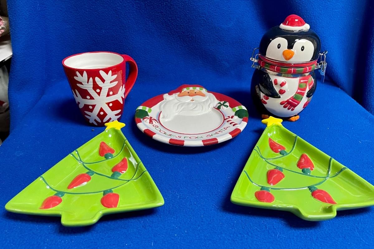 Ceramic Christmas Decor Lot - serving dishes, canister, cup - snowflakes, trees, penguin, Santa