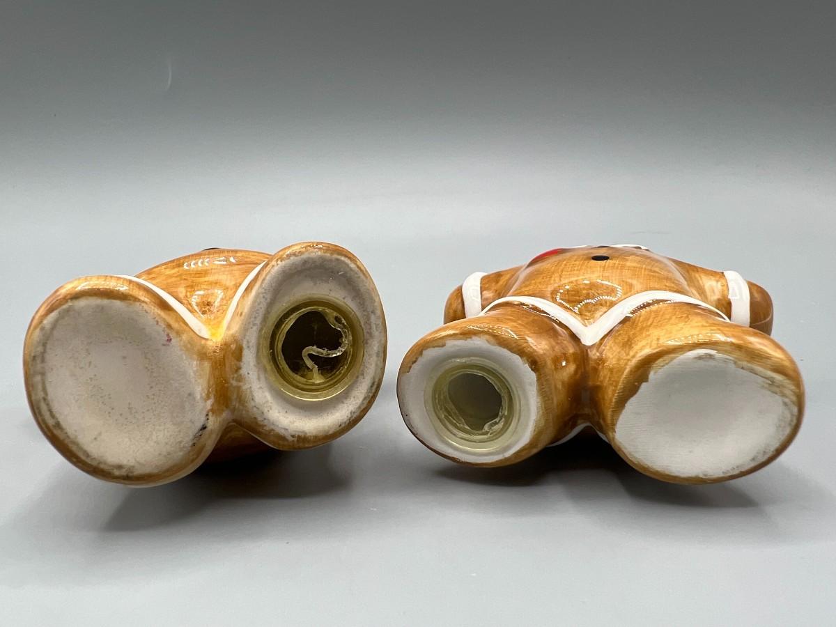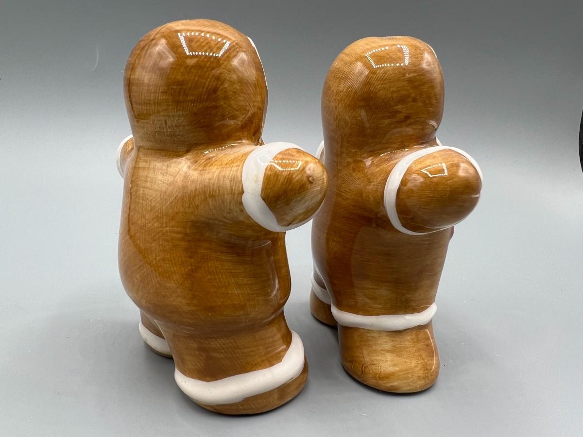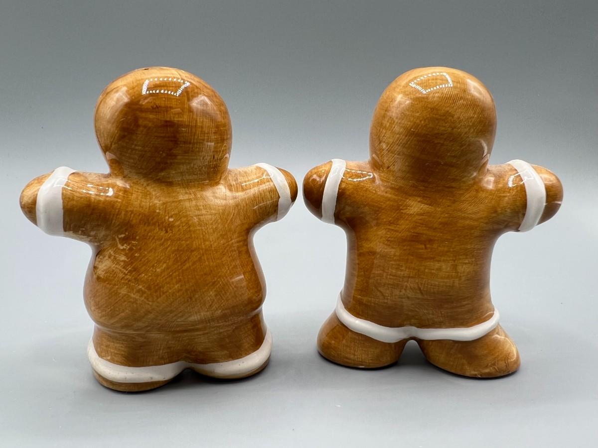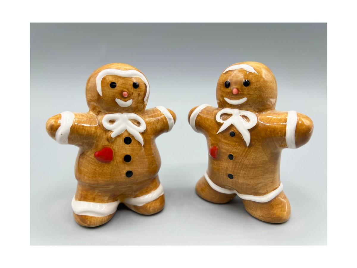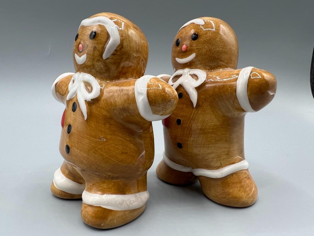 Ceramic Christmas Holiday Gingerbread Man Salt & Pepper Shaker Set. Looks like a gingerbread man and woman. Both have stoppers in the bottom. 3.5" size.