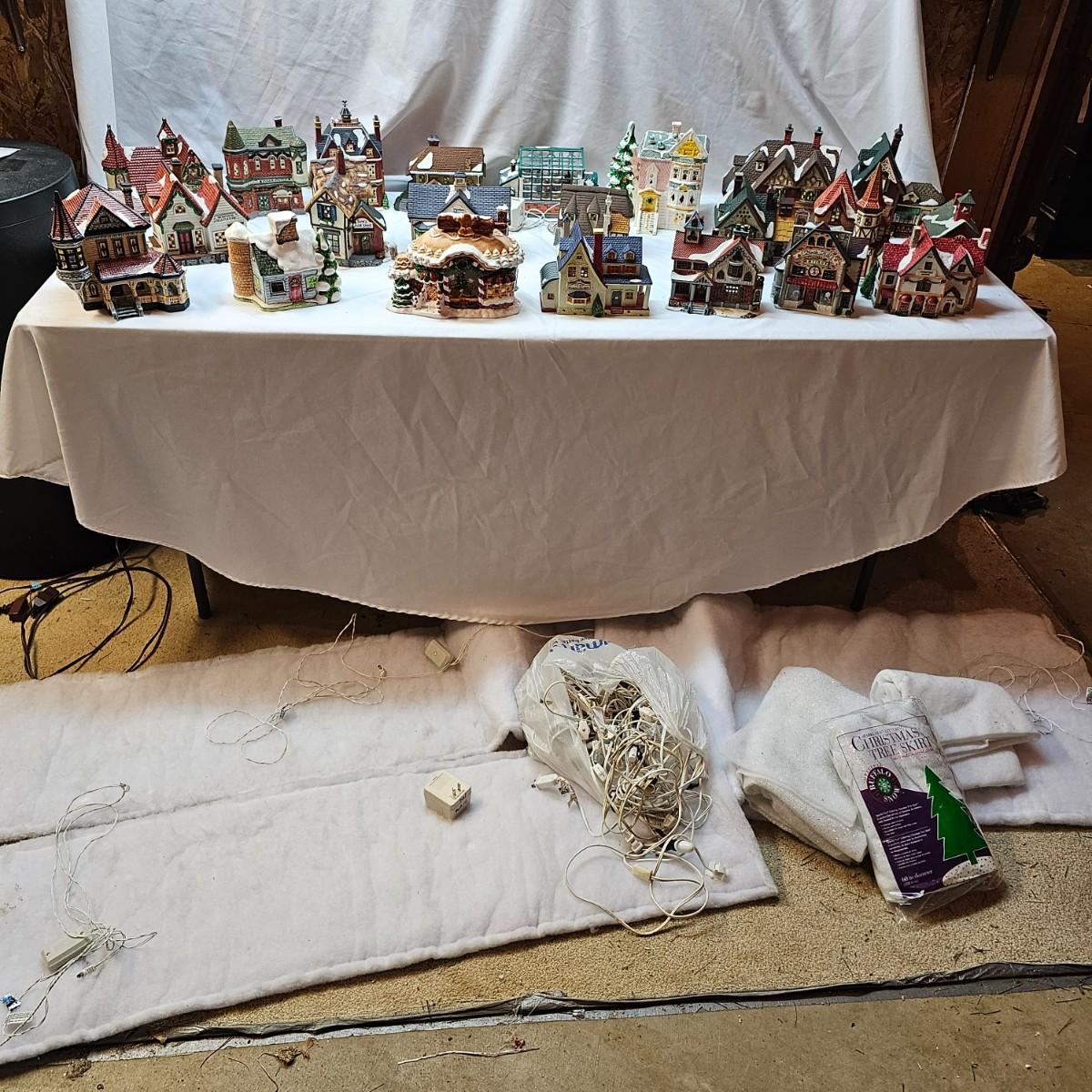 An entire village worth of Christmas themed houses, 22 total pieces. Shops, schools, homes, etc. Items by Department 56, Lemax, O'Well others. As an example, the Police Station measures 6.25” x 3.5” x 8”H. Also includes light cords for each, not all have bulbs. Three lighted snow mats for display, but part of each mat not working. Only one transformer. Some other regular sparkle mats as well. One bakery house missing end of rolling pin on top. Storage containers included. See photos for details. Local pickup only.