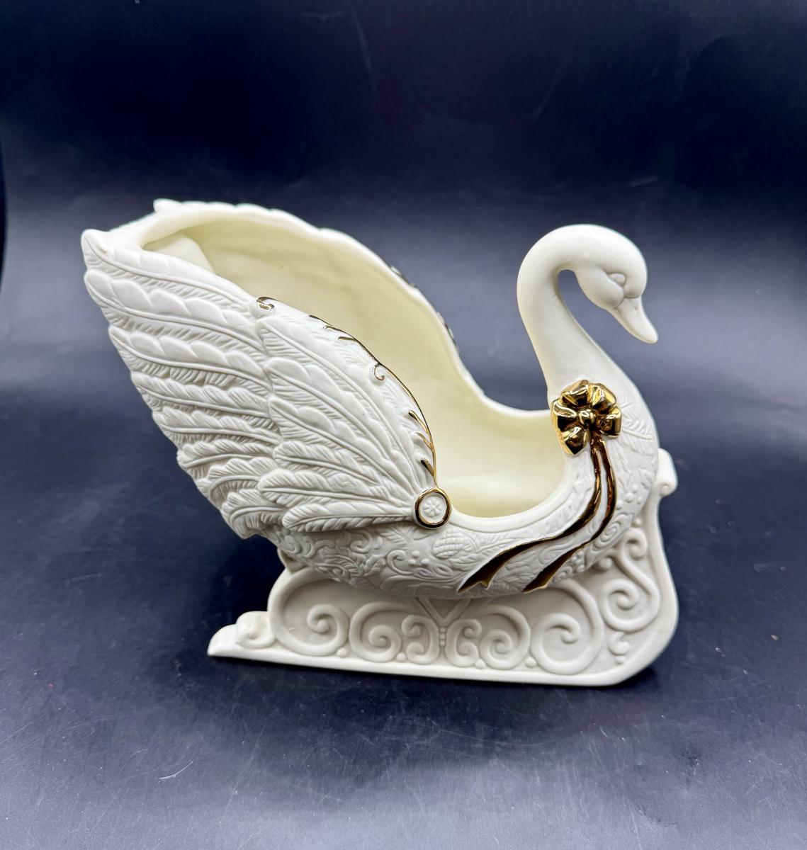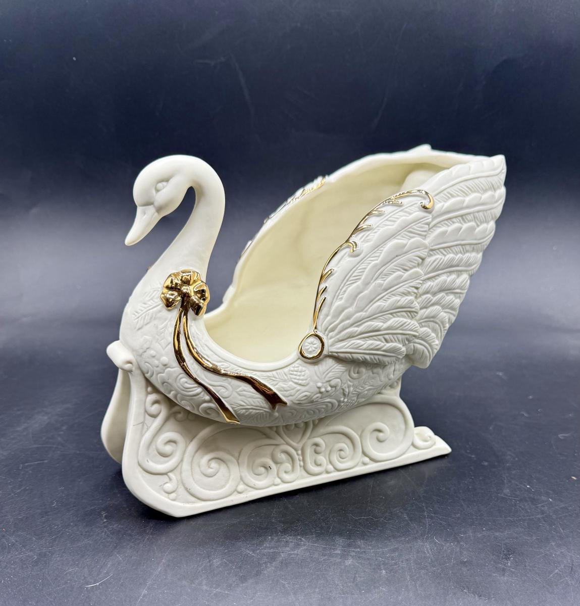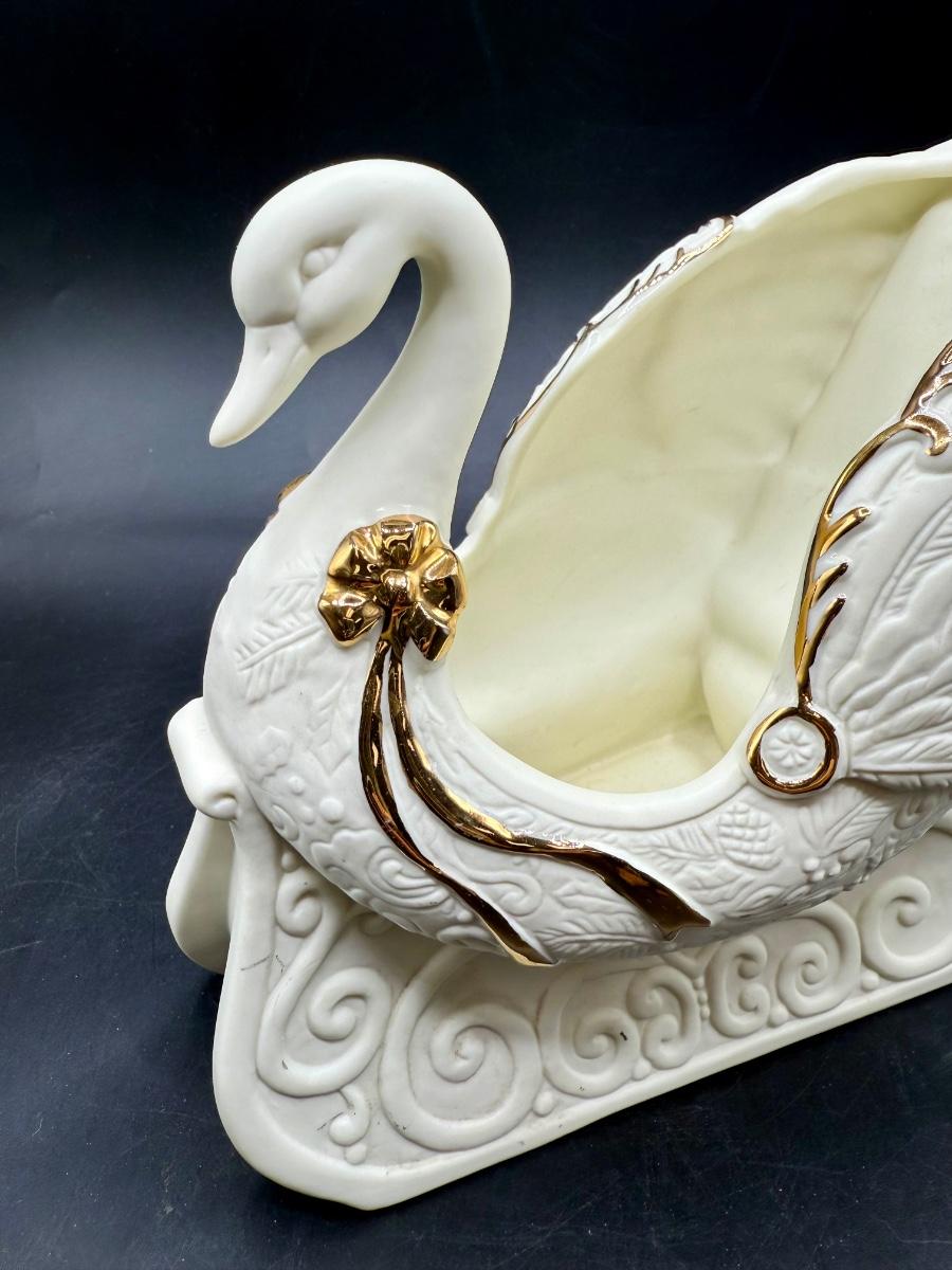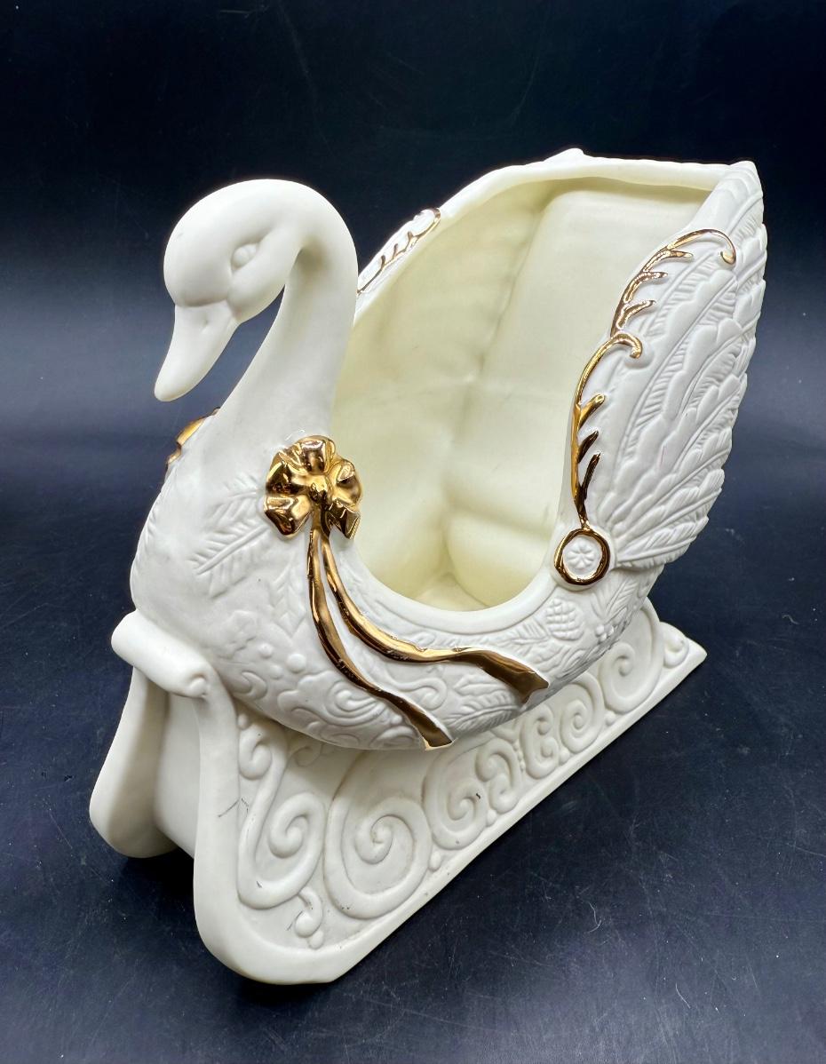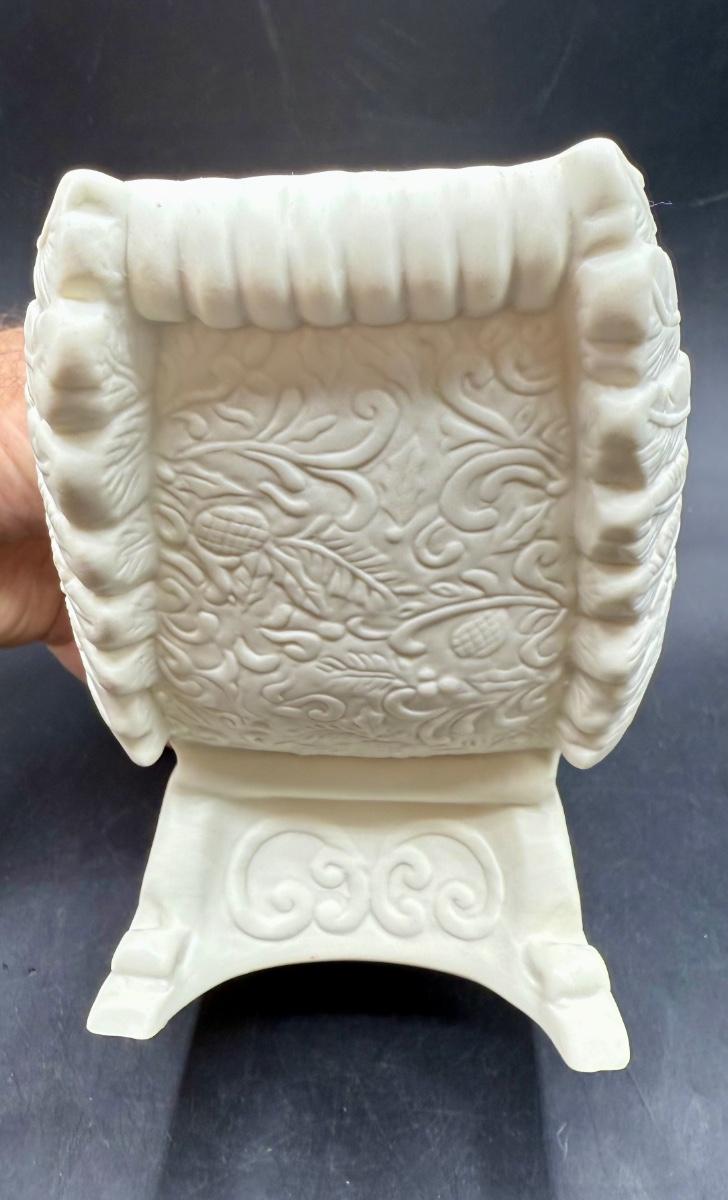 Bisque ceramic with golden accent, can be used a planter or to hold other Christmas-themed items or even small Christmas cards. Like-new condition, approx. 6.5" tall.