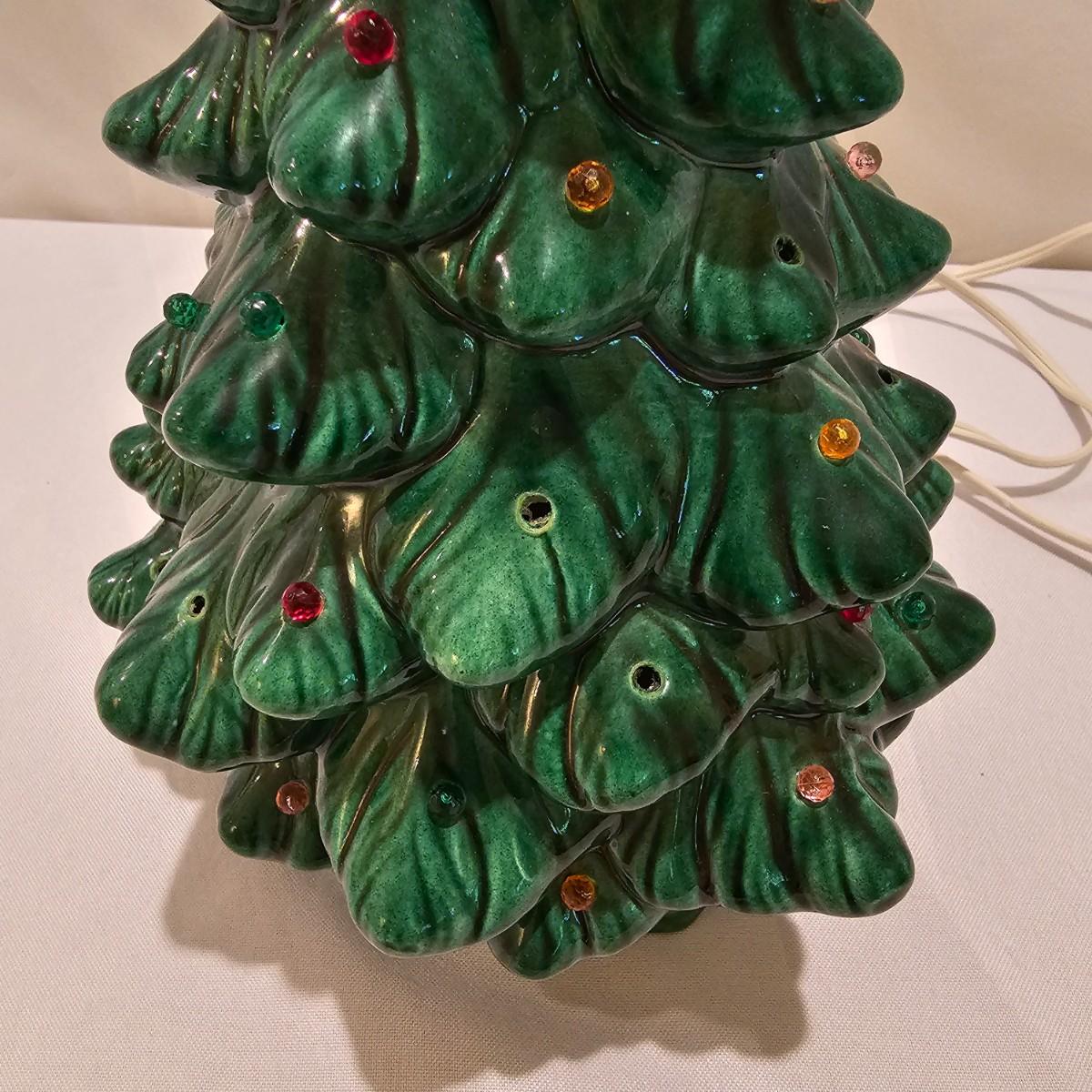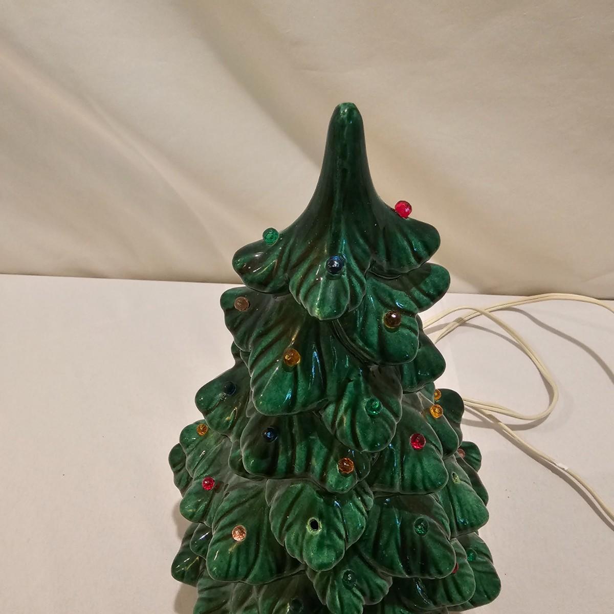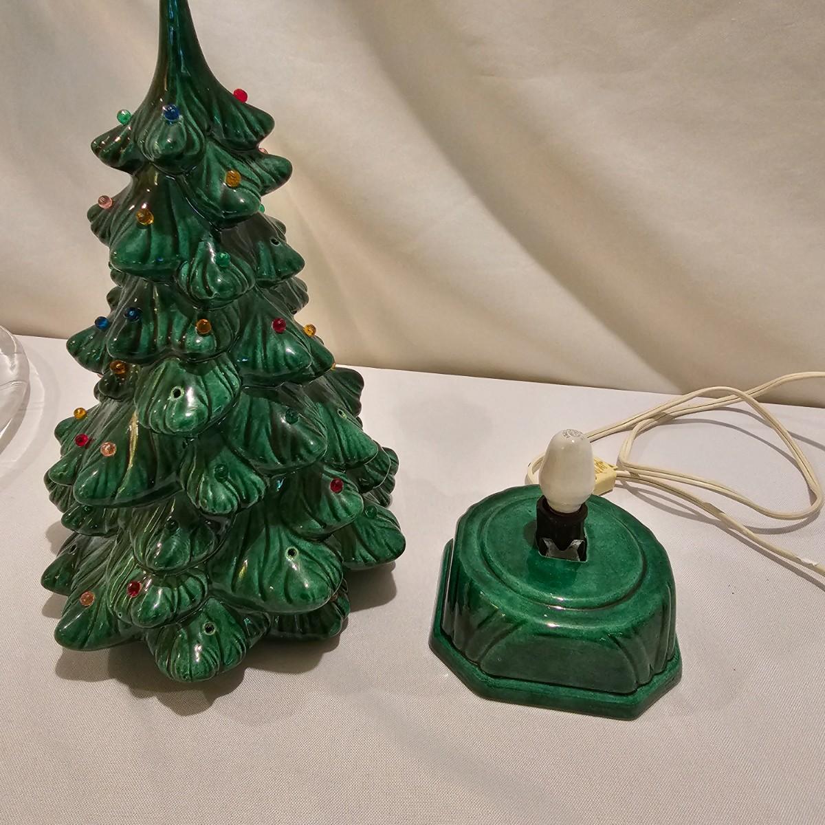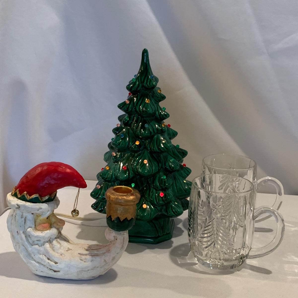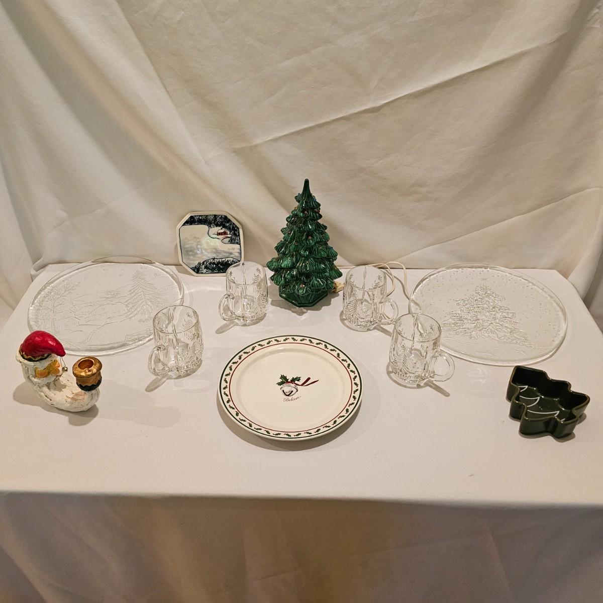One green ceramic lighted Christmas tree and base. Tree is 6.5"D x 11"H. Also included are several holiday serving plates, two clear items are 12.5"D and the smaller bell plate is 10"D. Includes a Santa themed candle holder, a small tree serving dish and four clear glass handled mugs. Note that ceramic tree is missing some jewels. Tree lit up when plugged in. See photos for details. Shipping available.