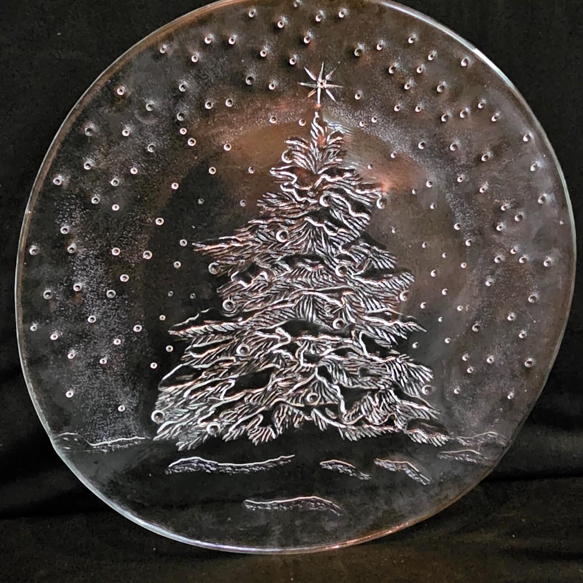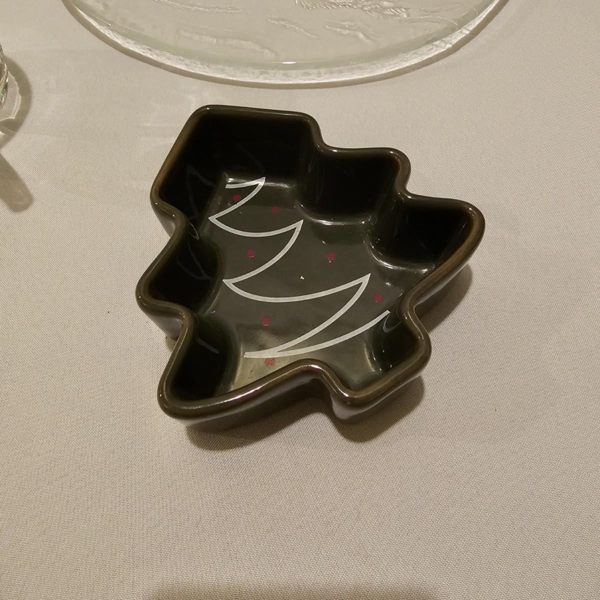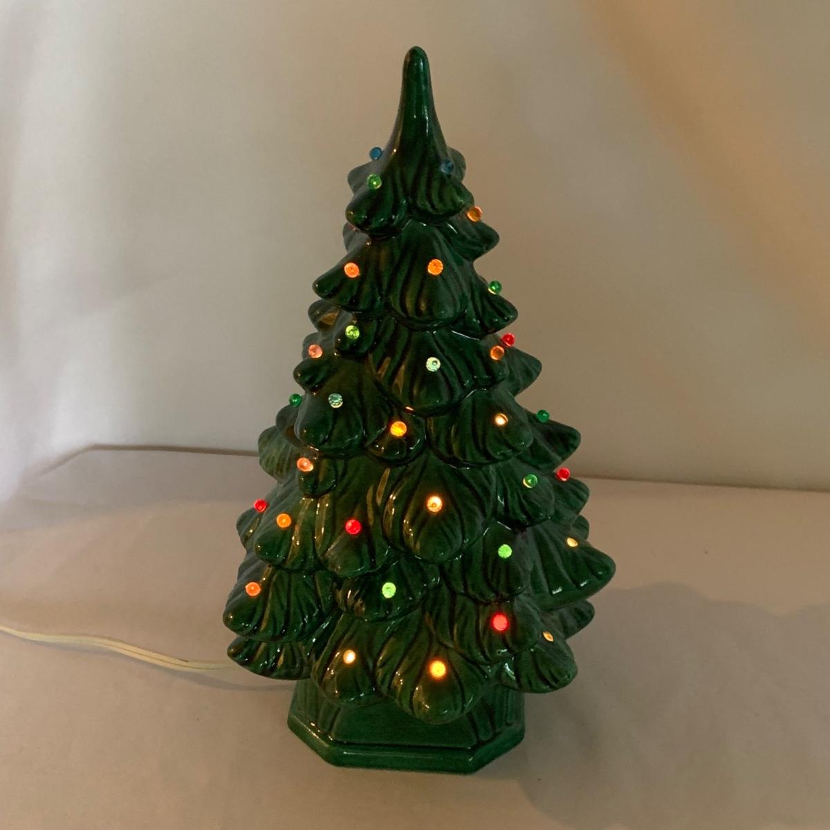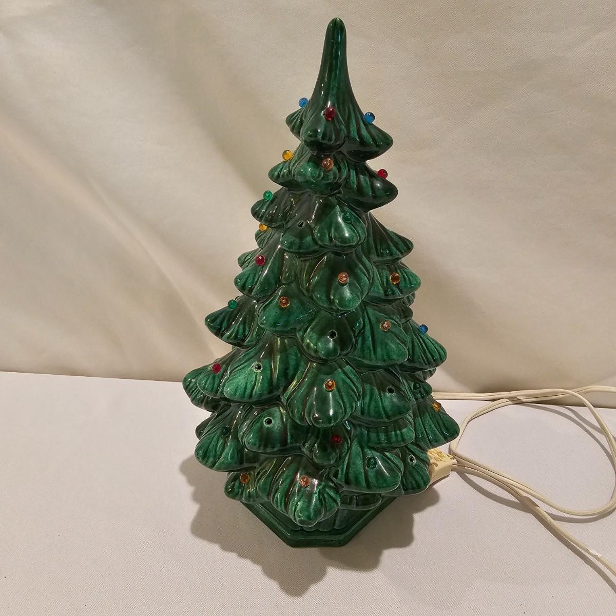 One green ceramic lighted Christmas tree and base. Tree is 6.5"D x 11"H. Also included are several holiday serving plates, two clear items are 12.5"D and the smaller bell plate is 10"D. Includes a Santa themed candle holder, a small tree serving dish and four clear glass handled mugs. Note that ceramic tree is missing some jewels. Tree lit up when plugged in. See photos for details. Shipping available.