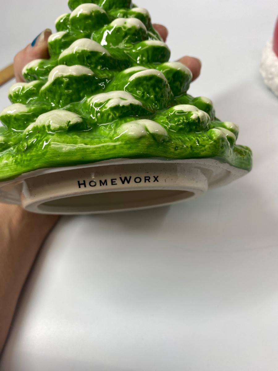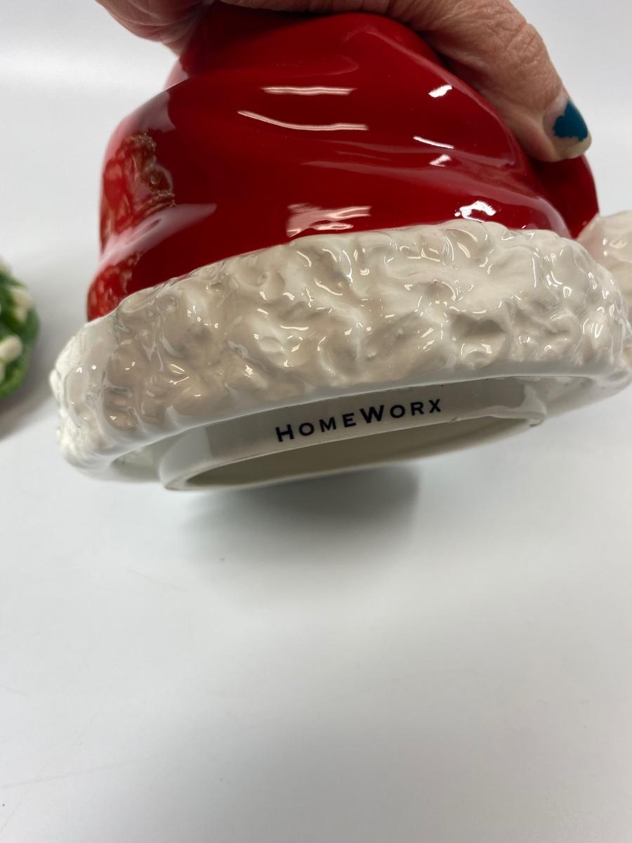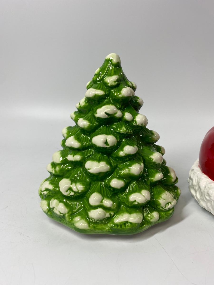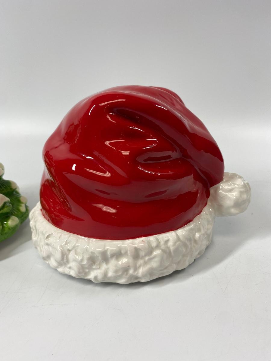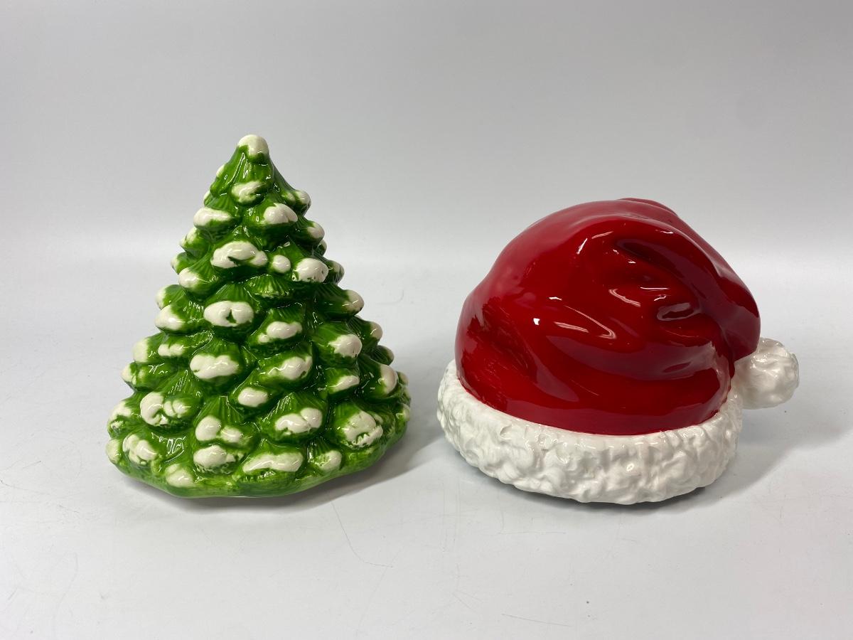Pair of seasonal ceramic figurines from Homeworx. A snow tipped Christmas tree and a Santa hat. They kind of look like they may have been tops to something but display nicely as they are. Both are in good condition, no chips.