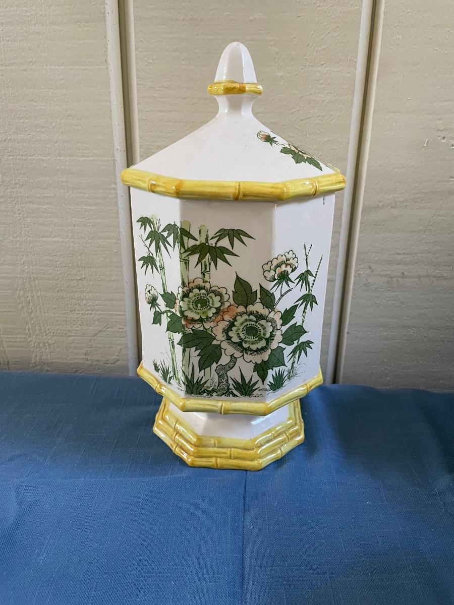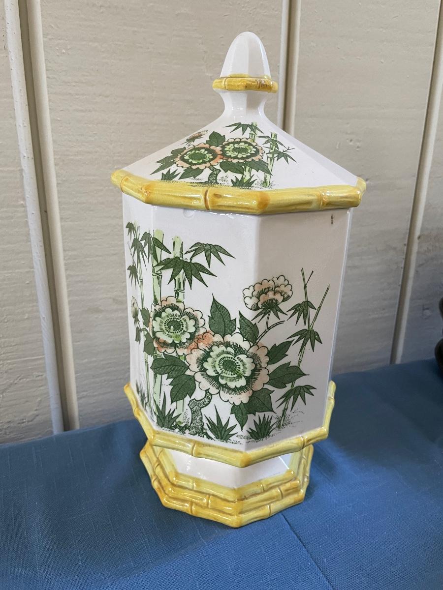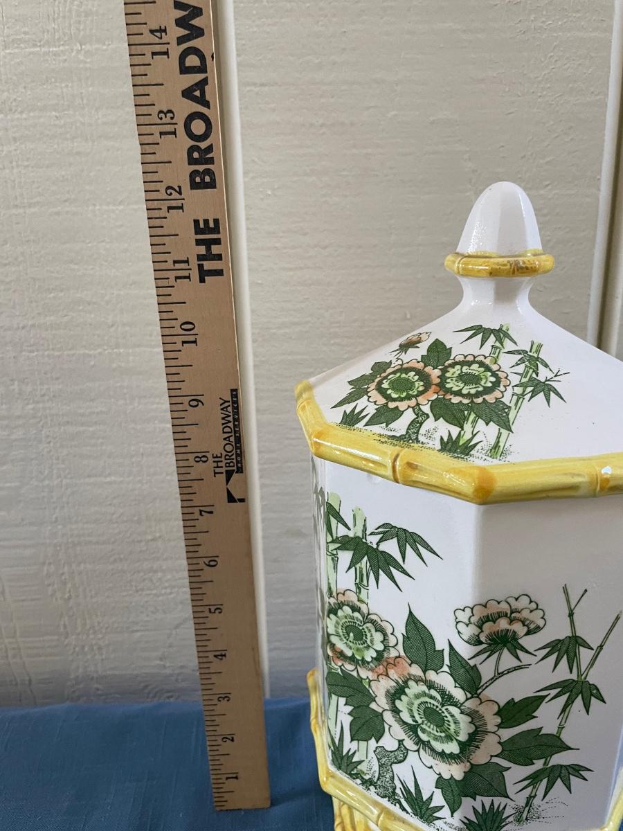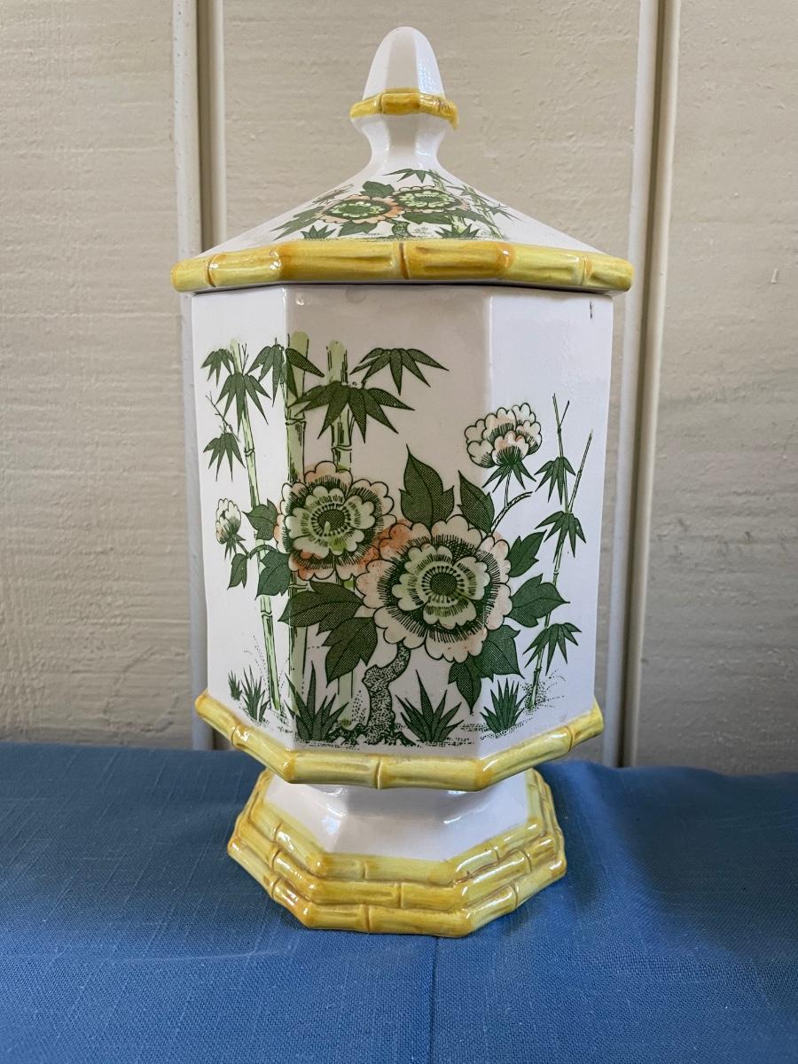 Ceramic Cookie Jar, Ming Theme with Bamboo Plant Design.