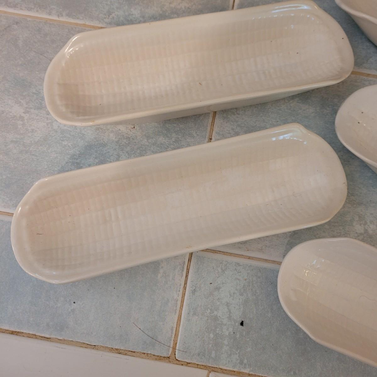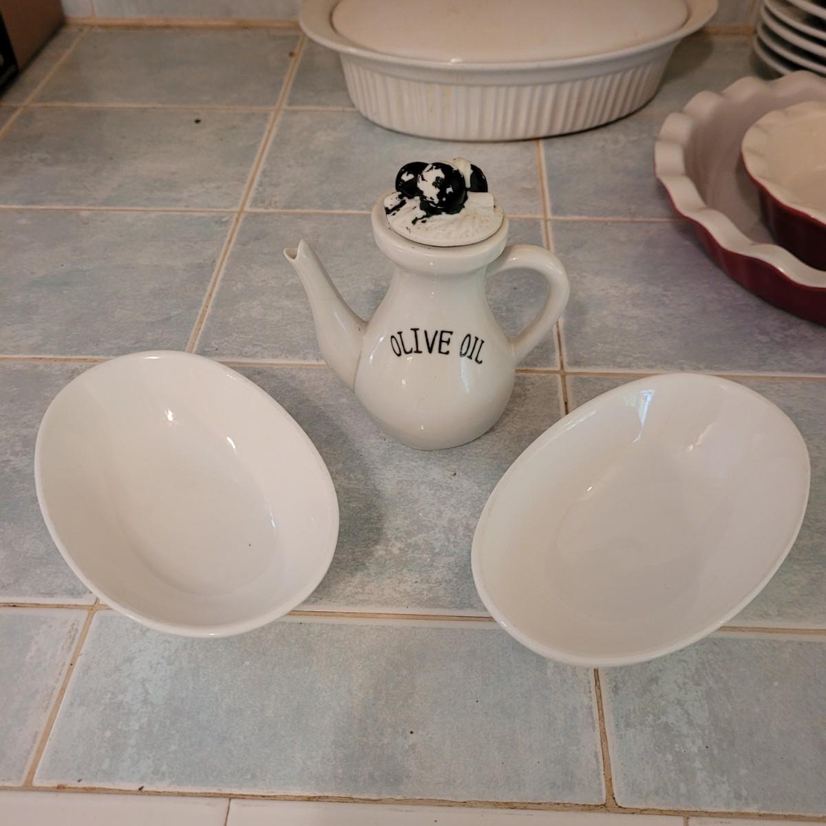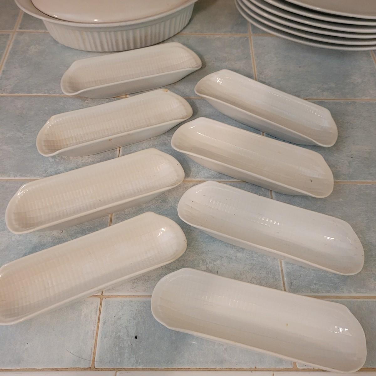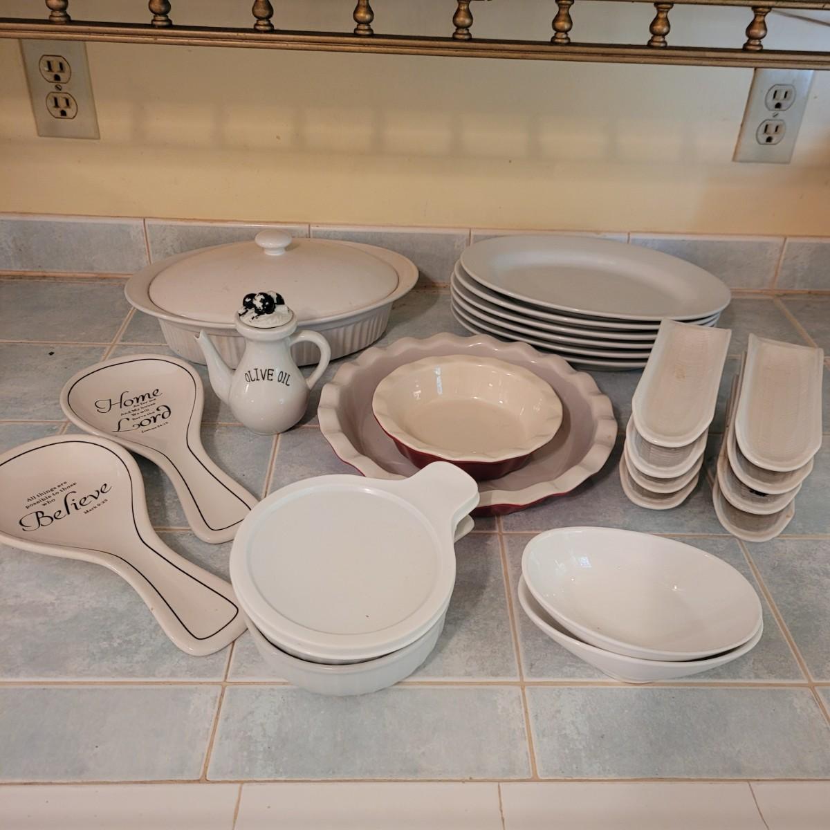 Large assortment of ceramic cookware and serve ware, including six long oval plates, a casserole dish, eight corncob holders, a large and small pie baking dish, two cooking spoon rests with Biblical verses, two small serving bowls, two small baking dishes (one lid), and an olive oil pourer. One corn holder dish and one plate have chips, see photos. Large pie dish measures approximately 11"DIA. Shipping available.