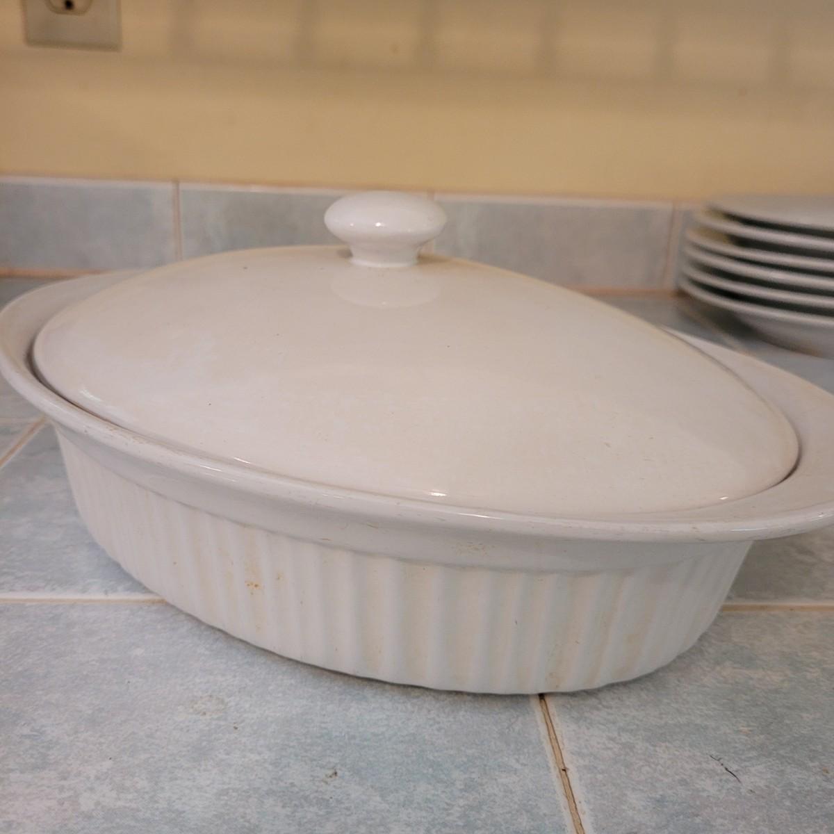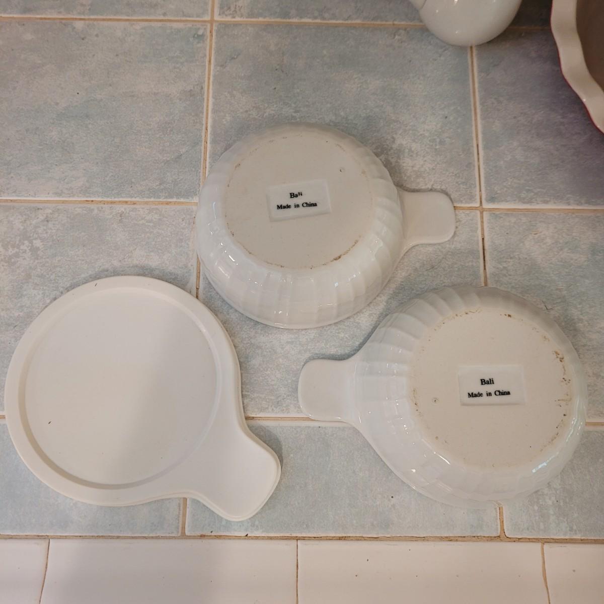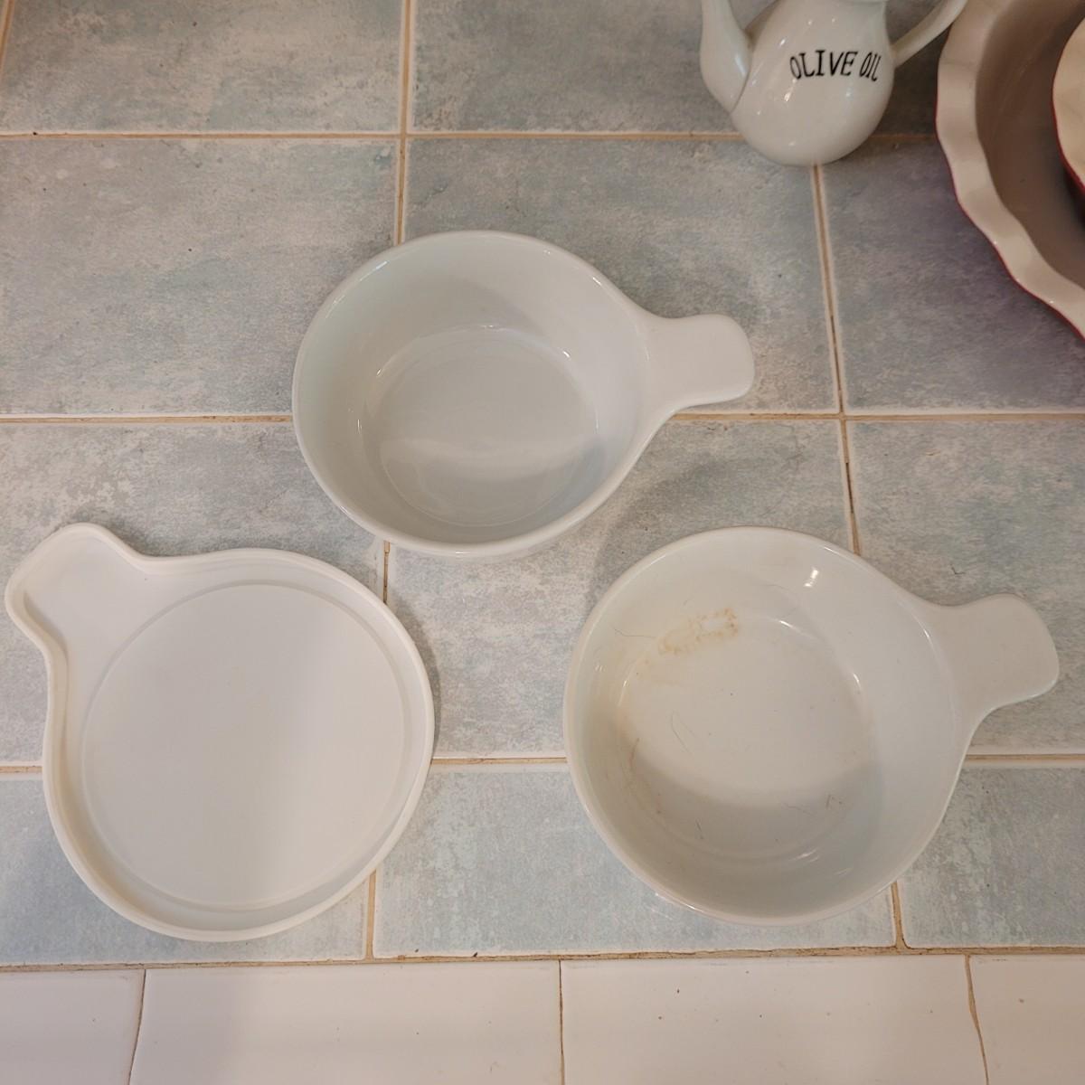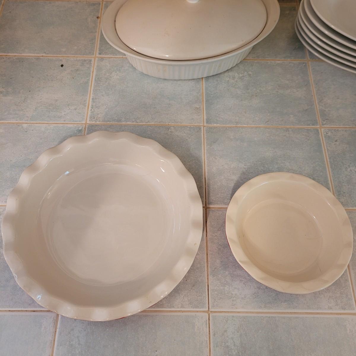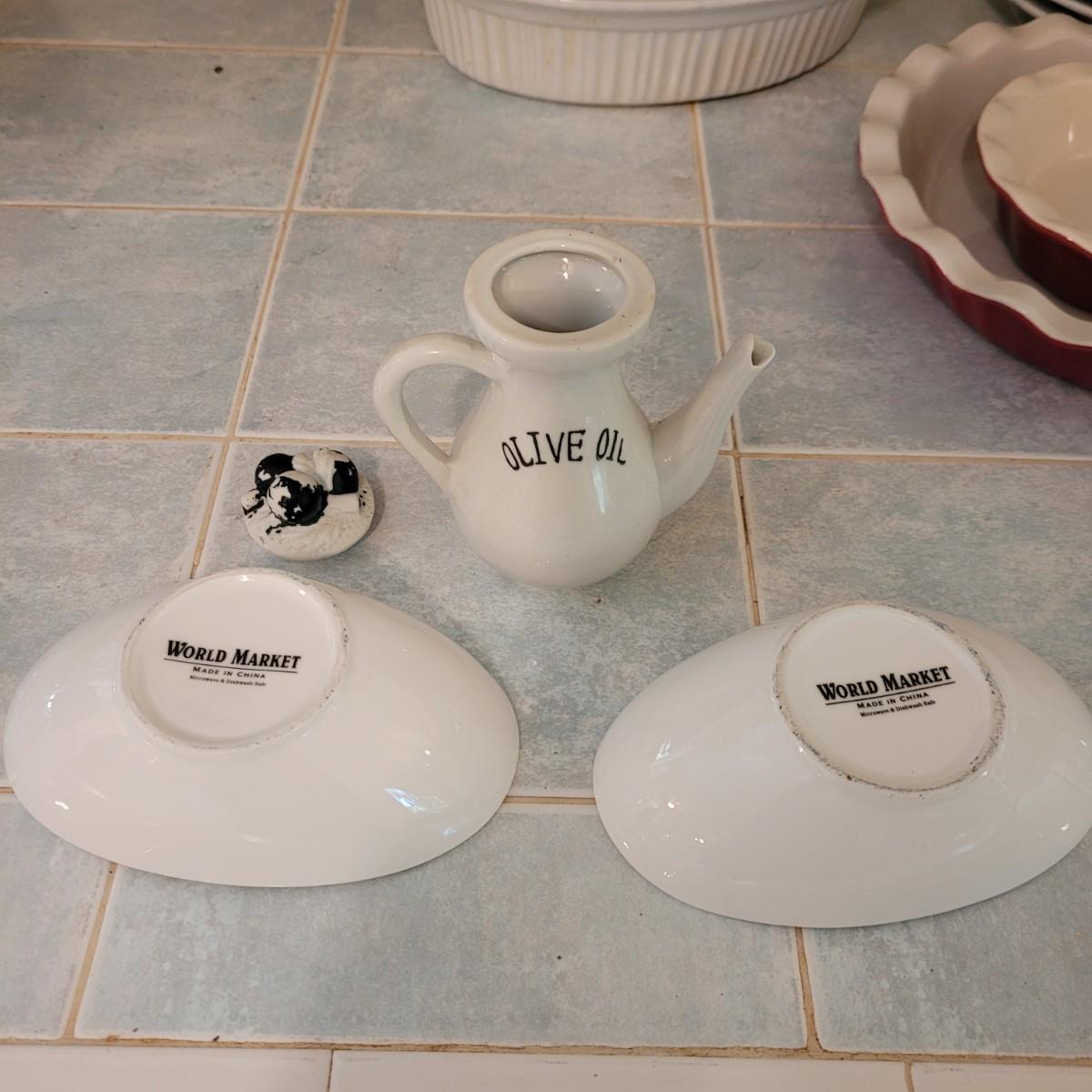 Large assortment of ceramic cookware and serve ware, including six long oval plates, a casserole dish, eight corncob holders, a large and small pie baking dish, two cooking spoon rests with Biblical verses, two small serving bowls, two small baking dishes (one lid), and an olive oil pourer. One corn holder dish and one plate have chips, see photos. Large pie dish measures approximately 11"DIA. Shipping available.