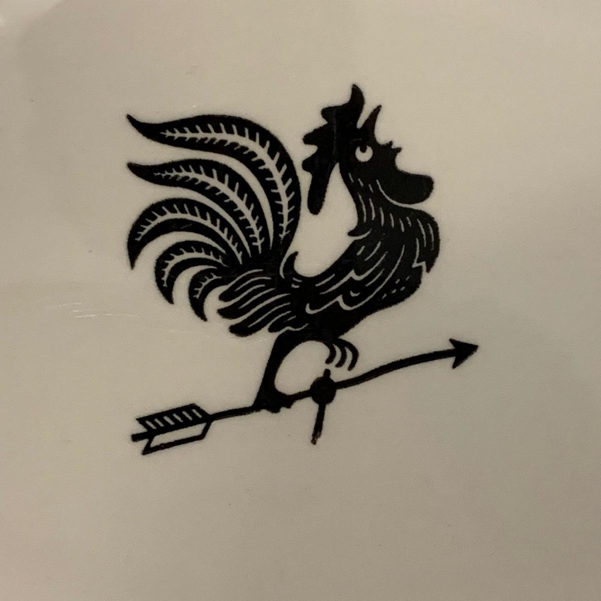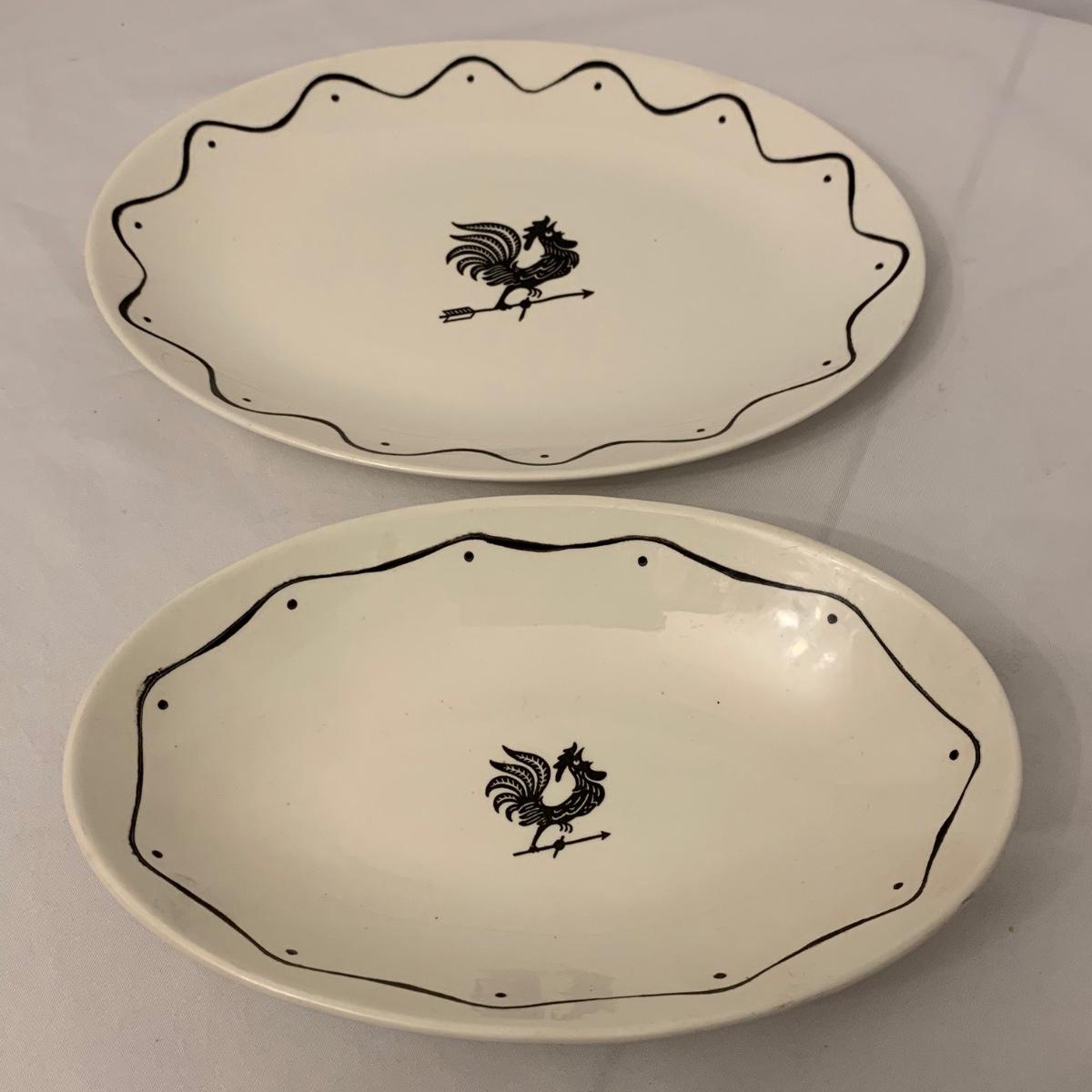 Four items total in this lot, including two rooster themed platters, a ceramic crock, and a ceramic mixing bowl. No items have a makers mark, but the ceramic bowl is marked “USA 9 In.” on the bottom. Items are in good condition. The crock has one blemish (see photos) that is possibly cleanable. The larger rooster plate measures 13” x 10”. Shipping available.