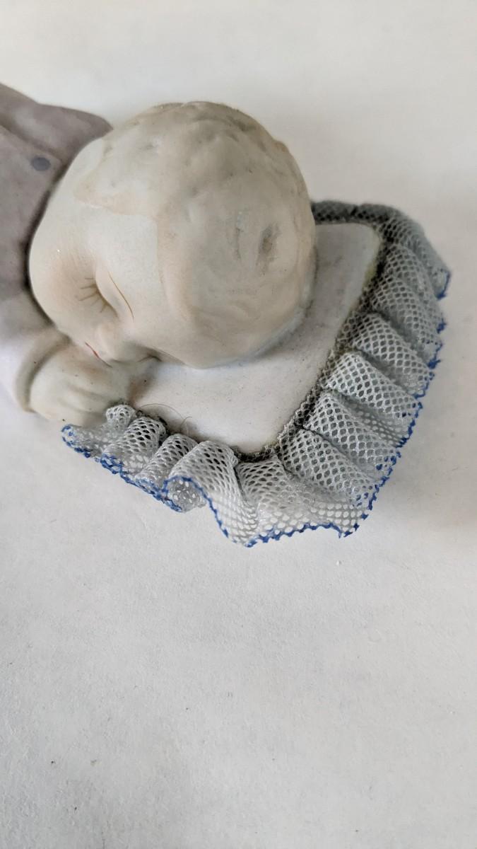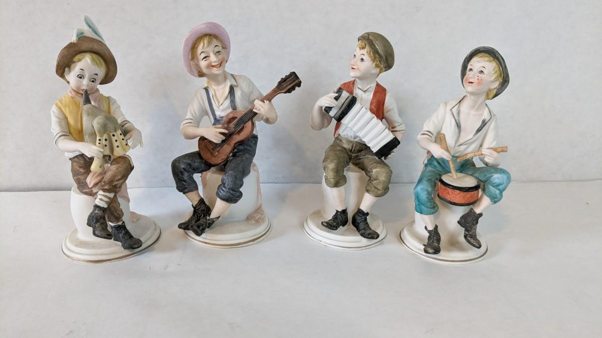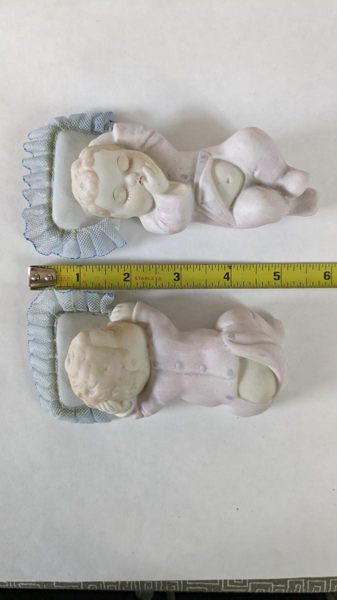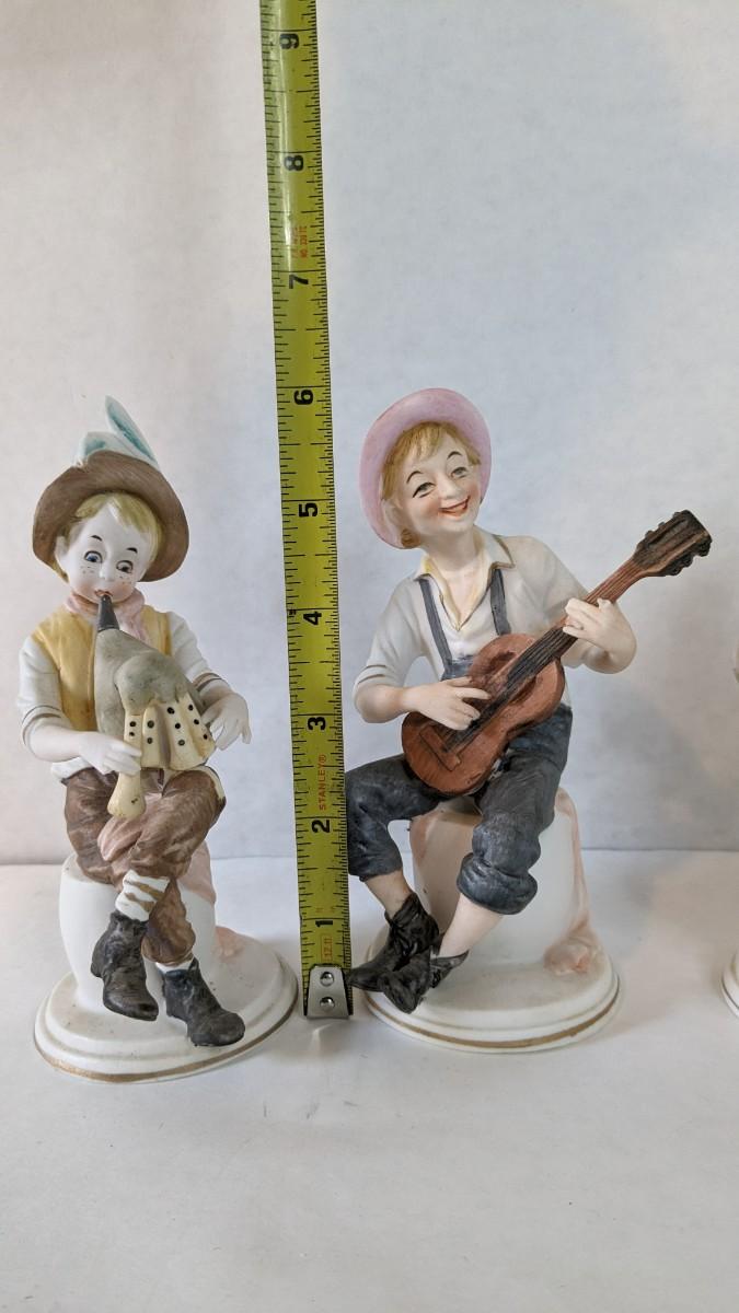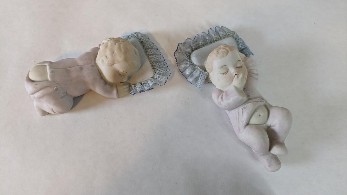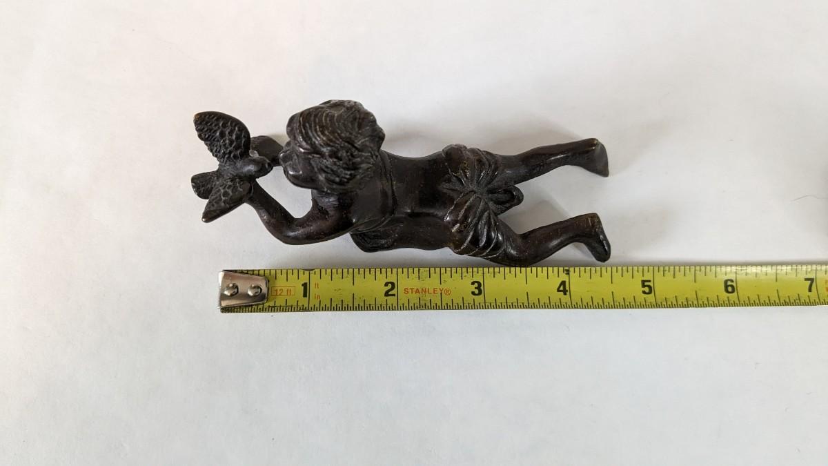 (4) Wales brand music makers. Note one has a missing pinky, no other flaws noted. (2) Japan made baby wall hangers with amazing detail to pillow edges, no damage noted to these. Finally a beautiful bronze cast cherub with AOD on side. Appears to have had an attached piece at one point, displays beautifully.