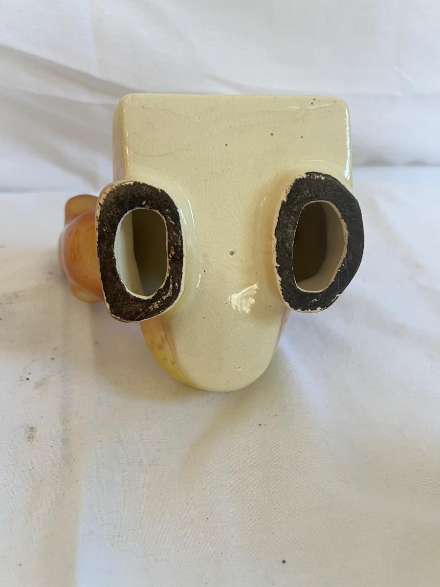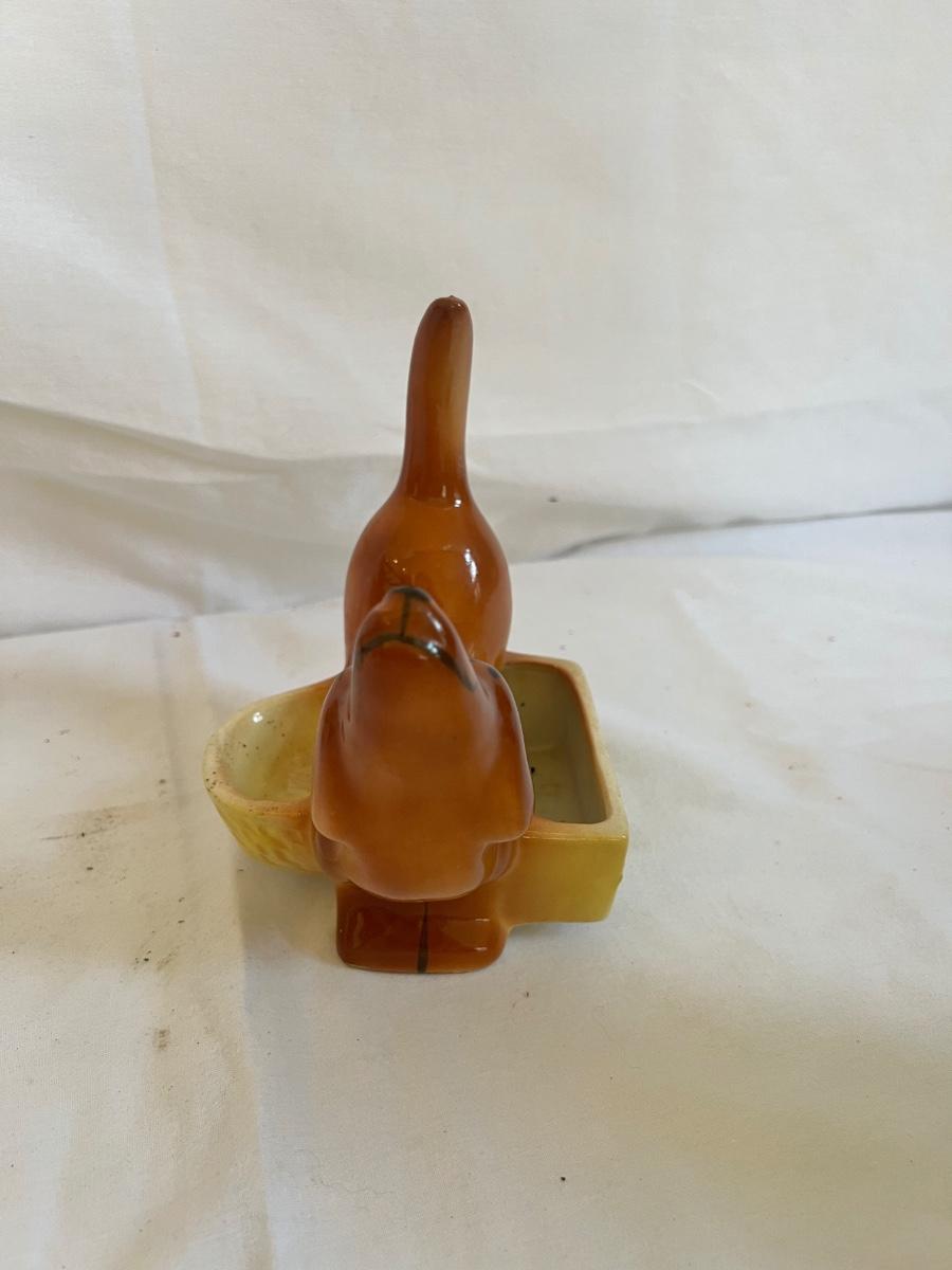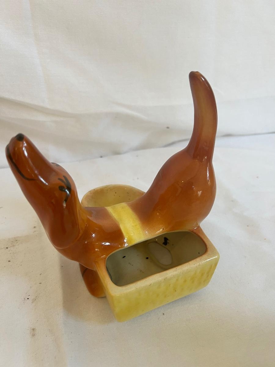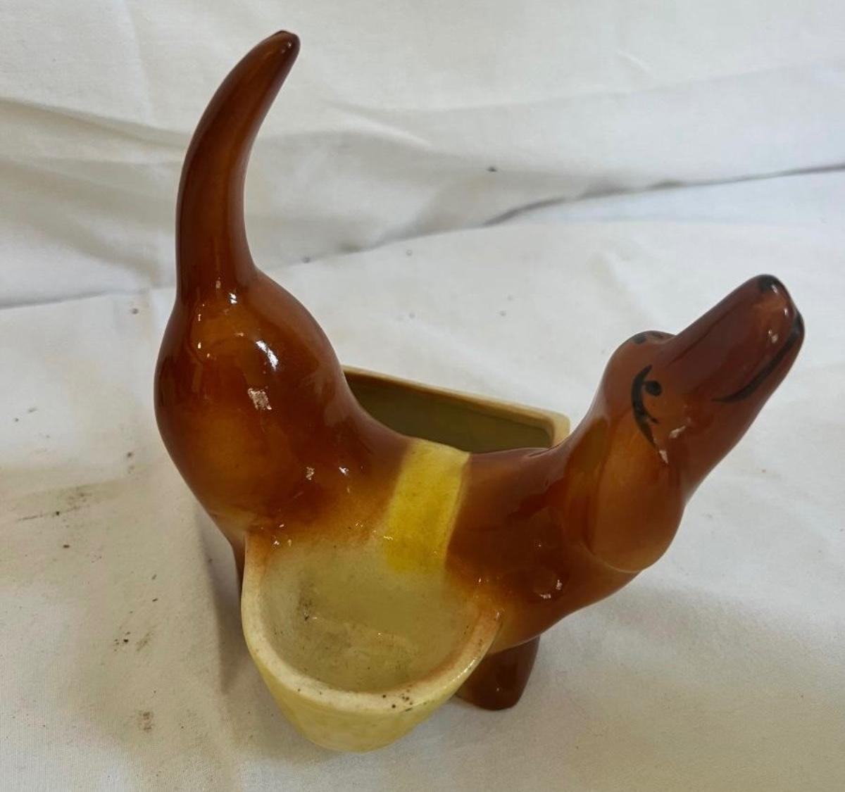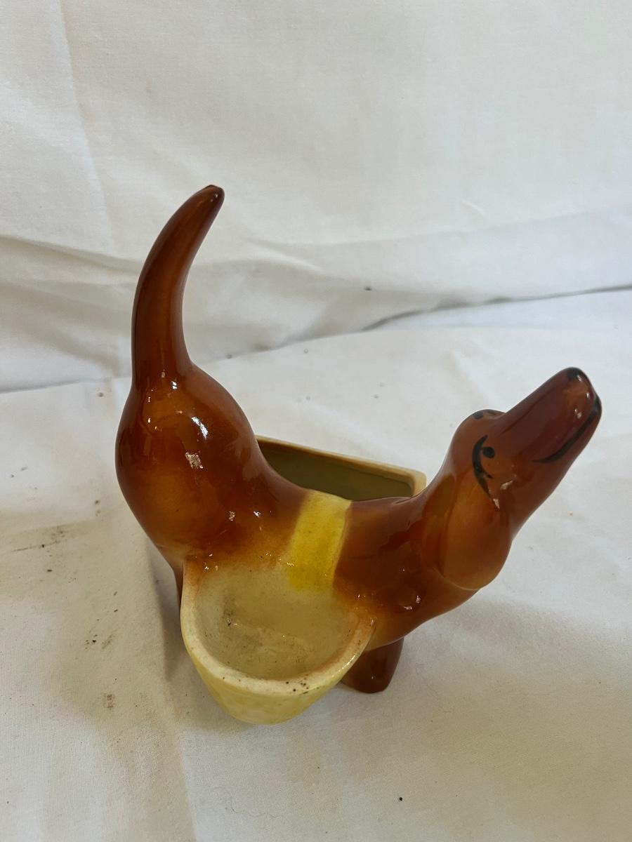 An adorable ceramic retro dachshund with a basket is a perfect dresser valet to store your rings, watch, wallet, keys and more. Could also be used as a small planter as it has drainage holes. also could be used for shave, cream, and brush or perfect for succulents or other small plants.