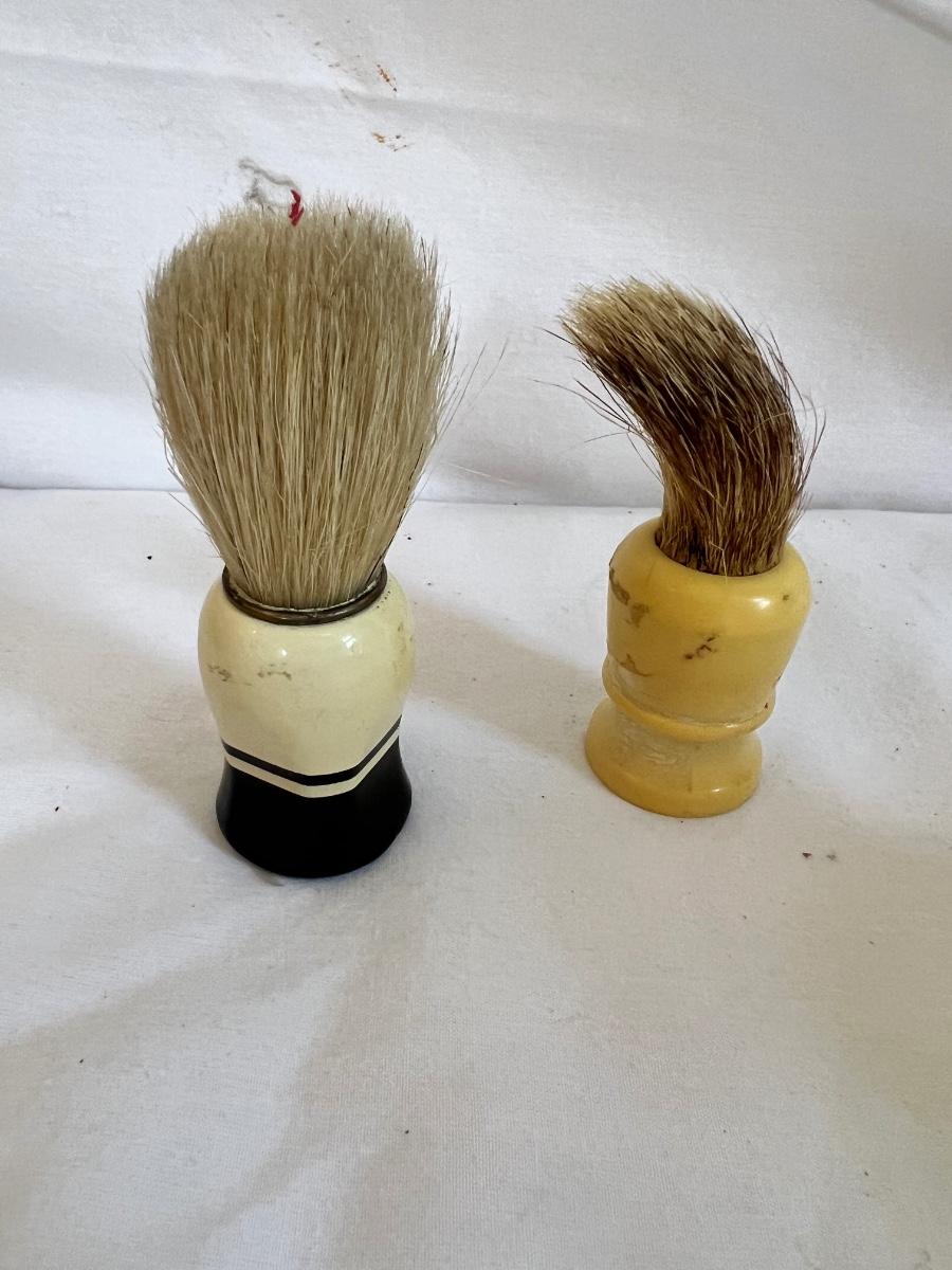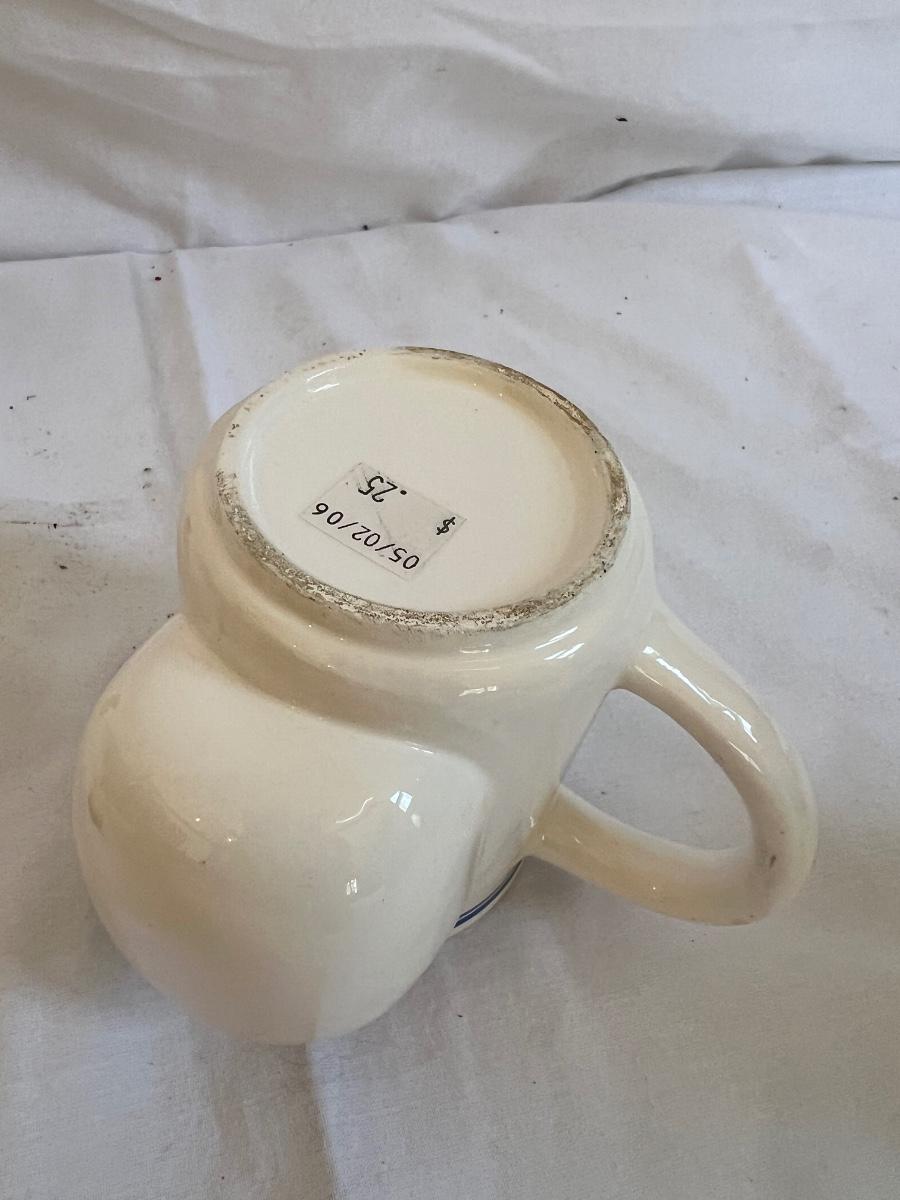 The cream and blue striped shave mug measures 3”D x 4”H.