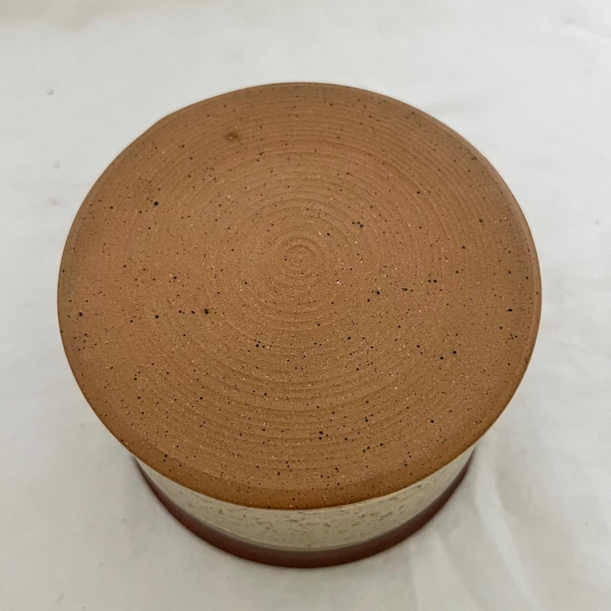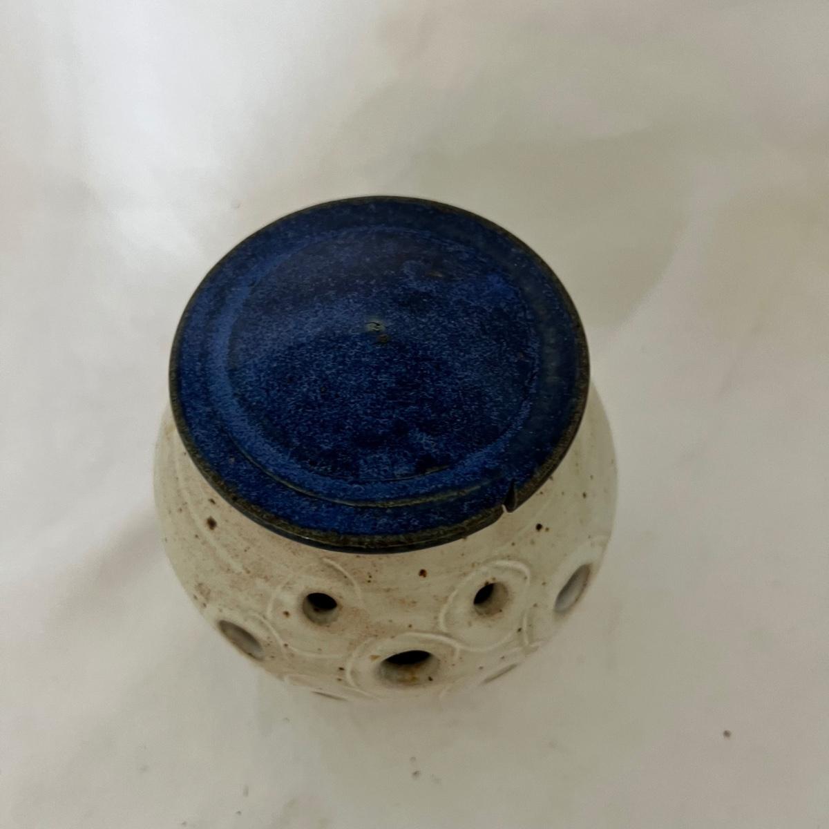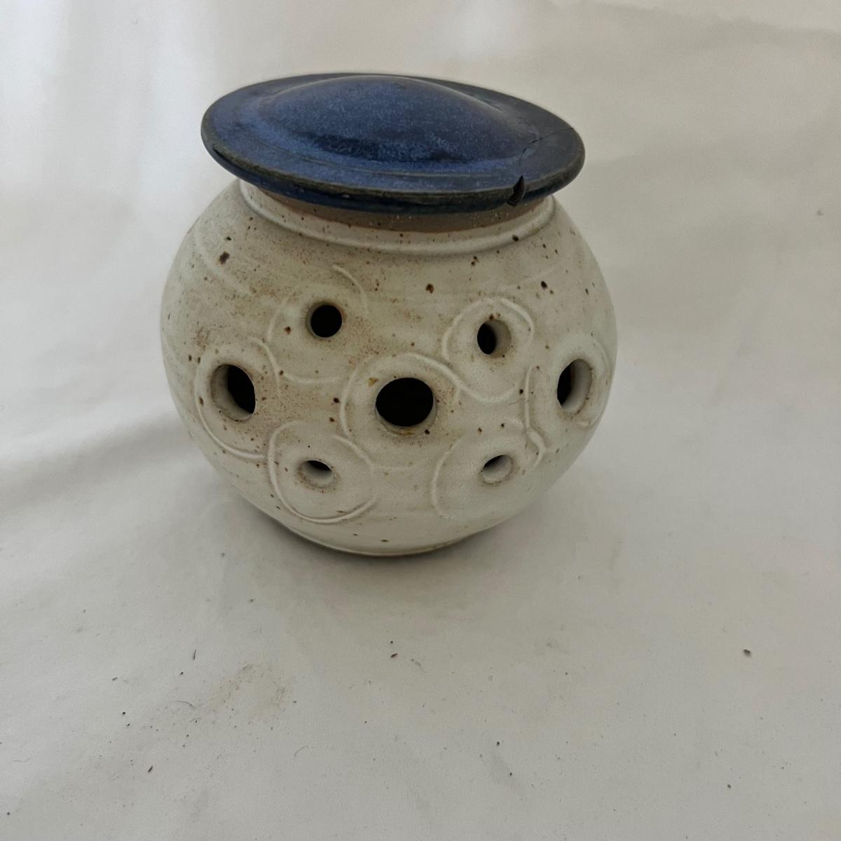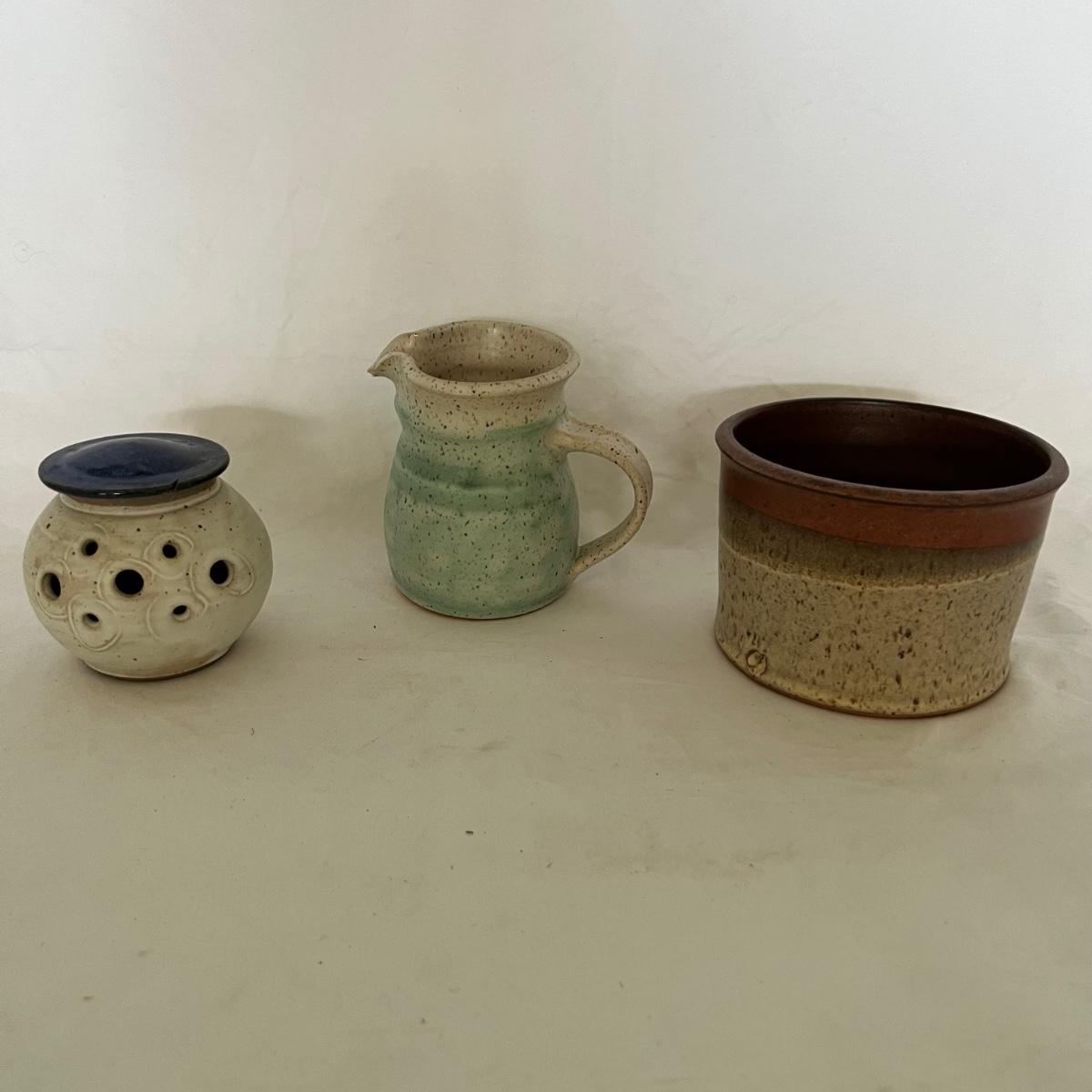 Three pottery pieces made from speckled clay. The Brown bowl measures 5.25”D x 4”H. the blue tinged pitcher measures approximately 3.5”D x 5”H and the covered container with holes in it, could be used for a garlic storage container, measures approximately 4”D x 3”H.