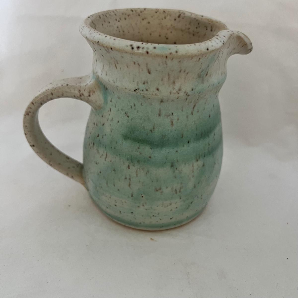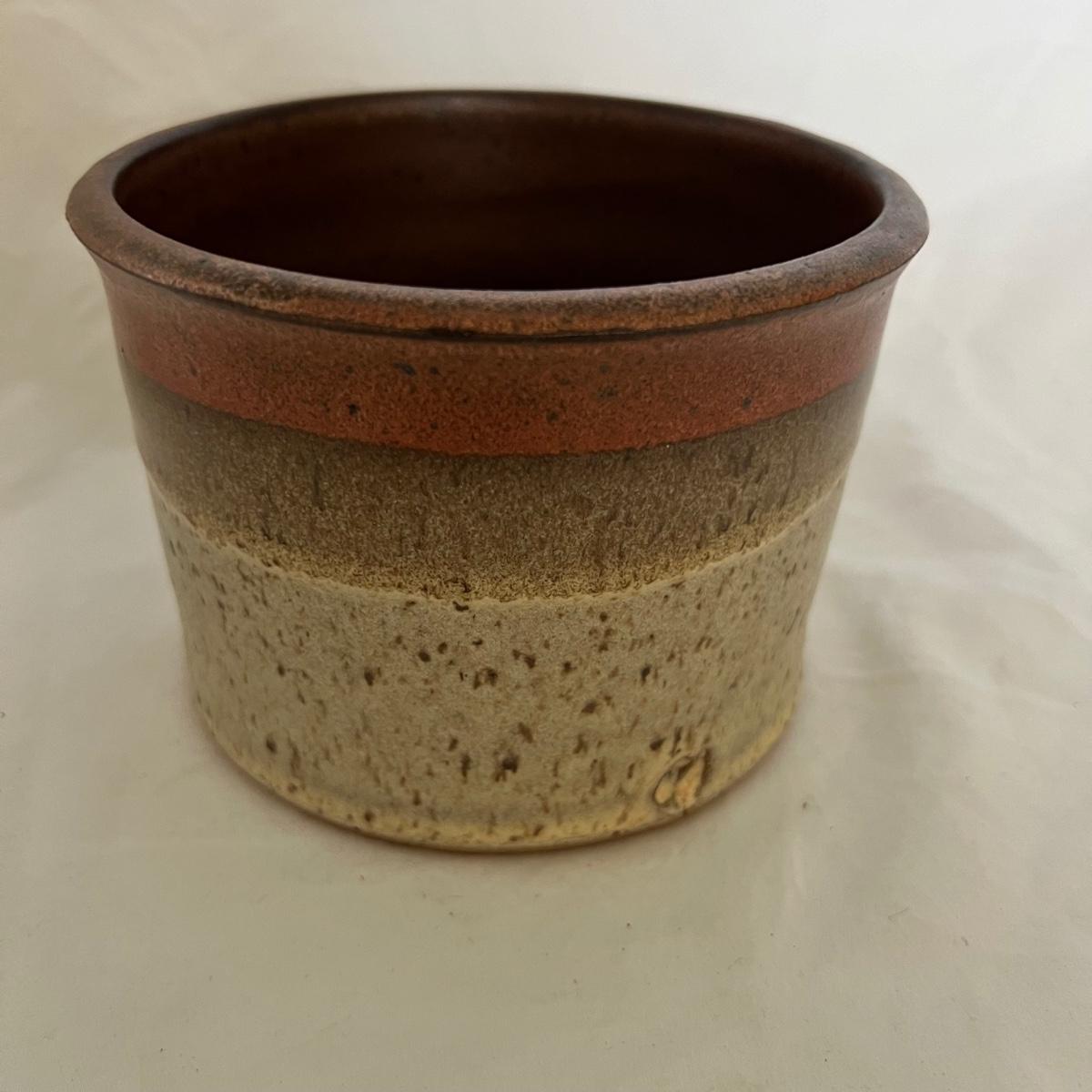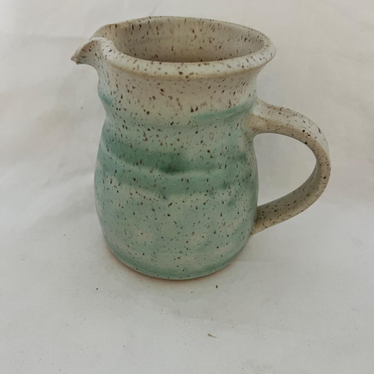 Three pottery pieces made from speckled clay. The Brown bowl measures 5.25”D x 4”H. the blue tinged pitcher measures approximately 3.5”D x 5”H and the covered container with holes in it, could be used for a garlic storage container, measures approximately 4”D x 3”H.