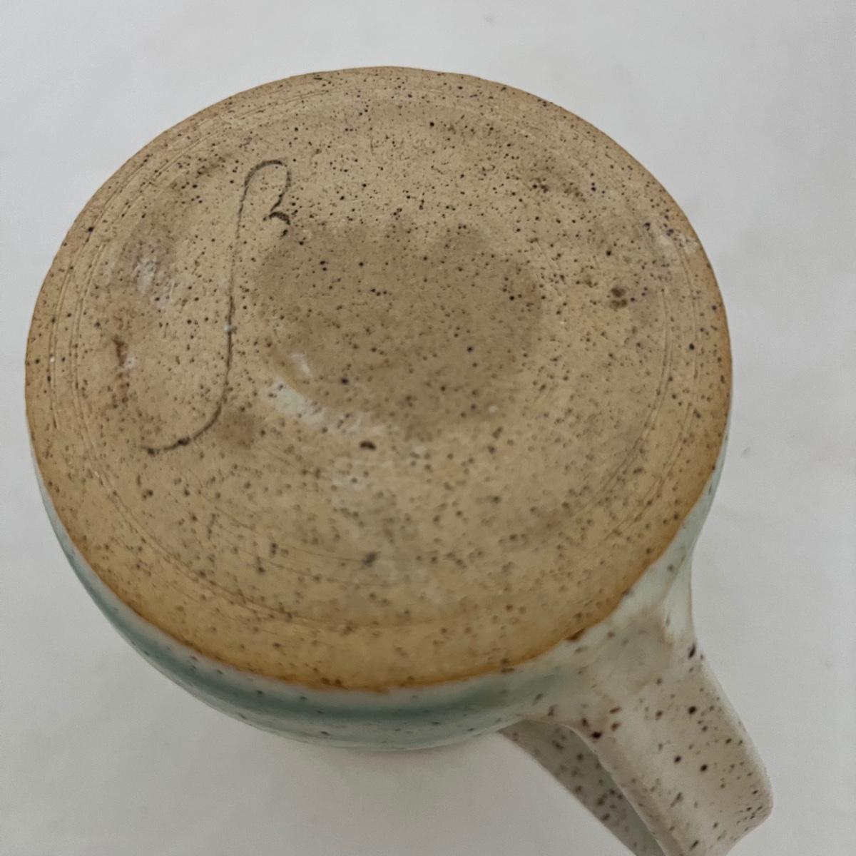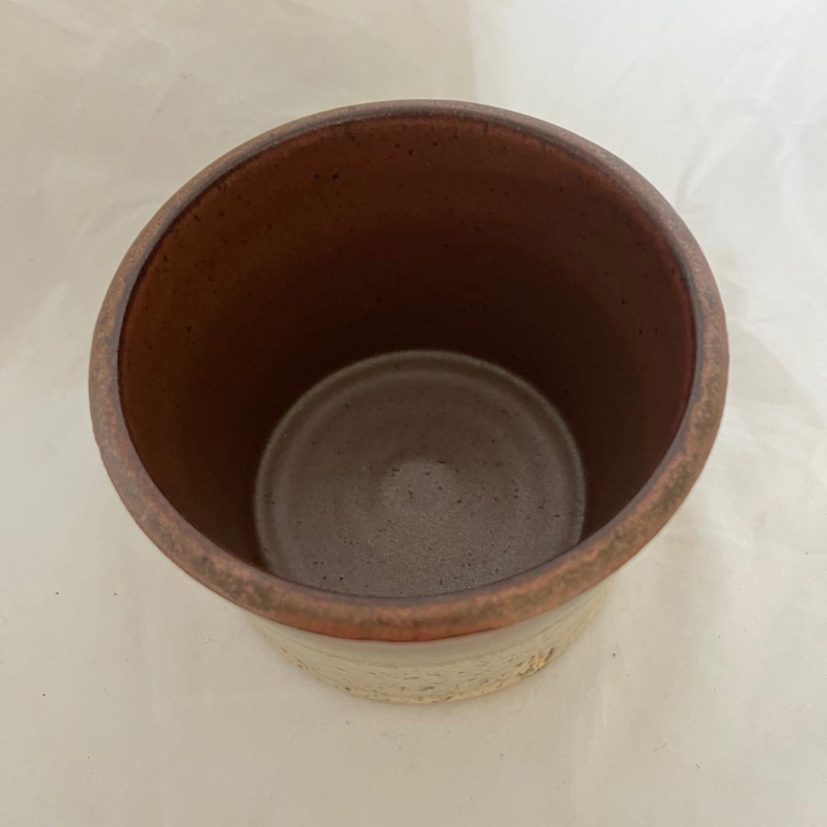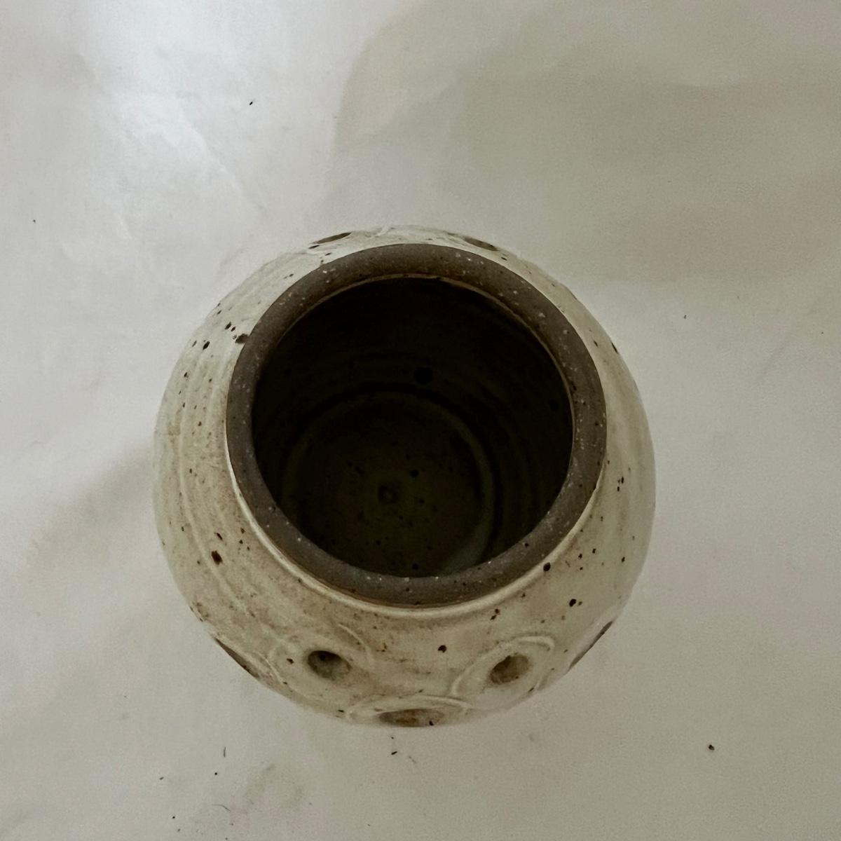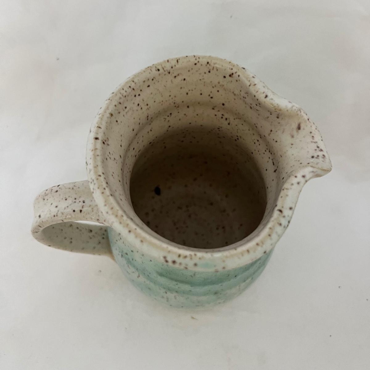 Three pottery pieces made from speckled clay. The Brown bowl measures 5.25”D x 4”H. the blue tinged pitcher measures approximately 3.5”D x 5”H and the covered container with holes in it, could be used for a garlic storage container, measures approximately 4”D x 3”H.