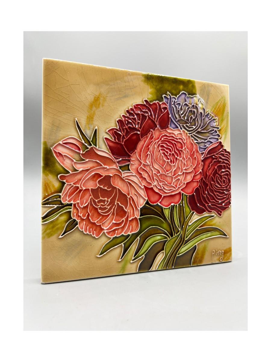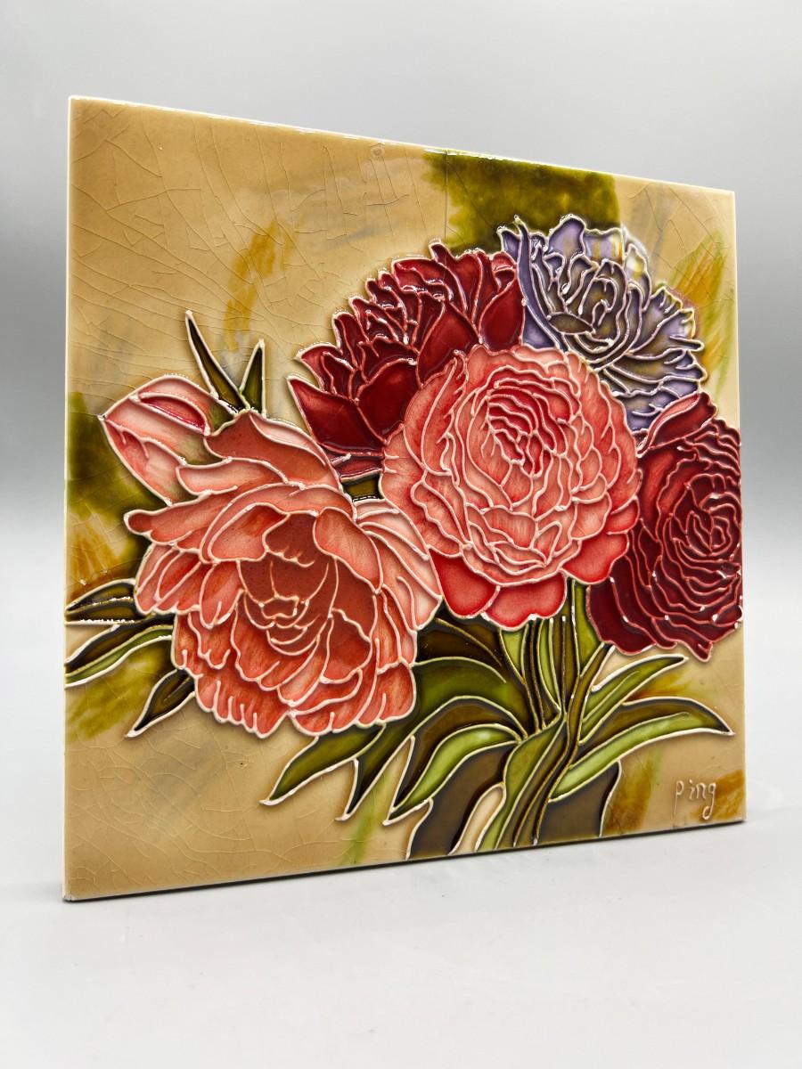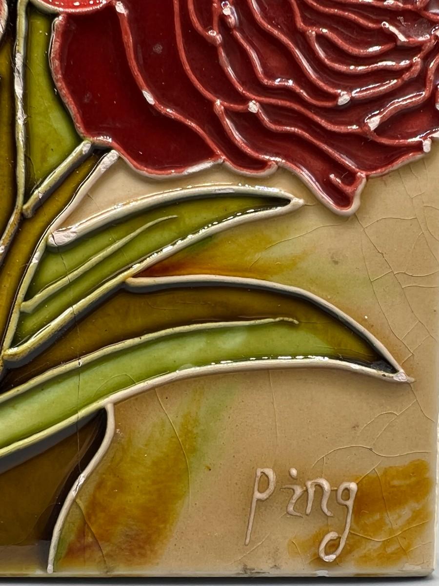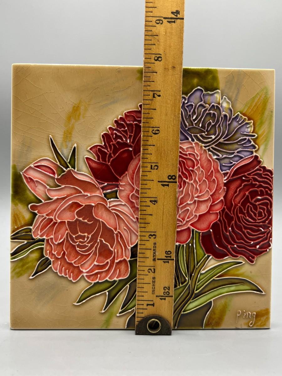 Ceramic Decorative Artist Signed Ping Collectible Flower Tile