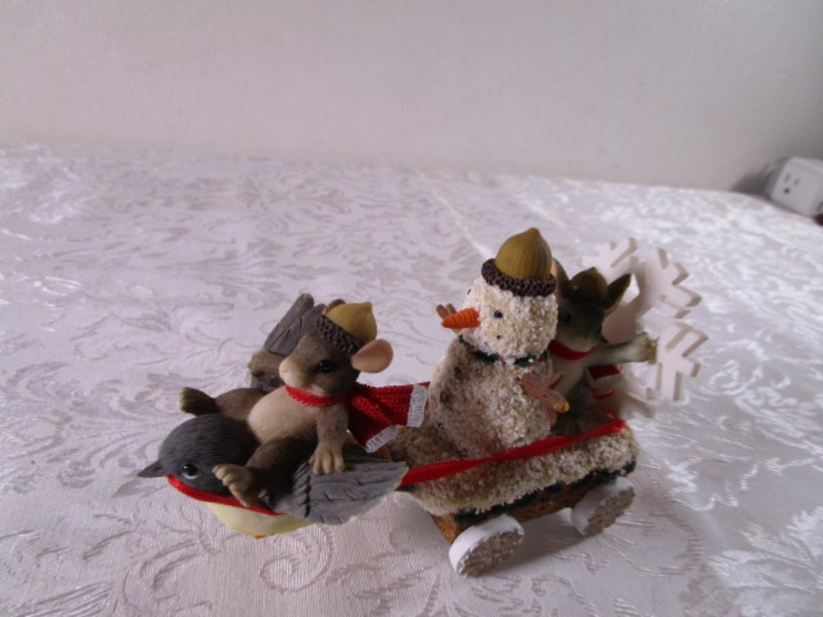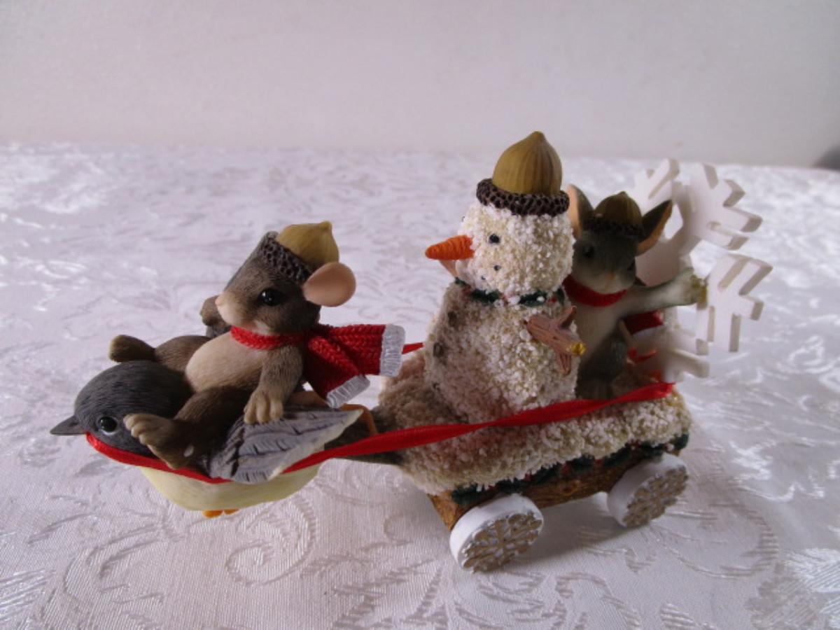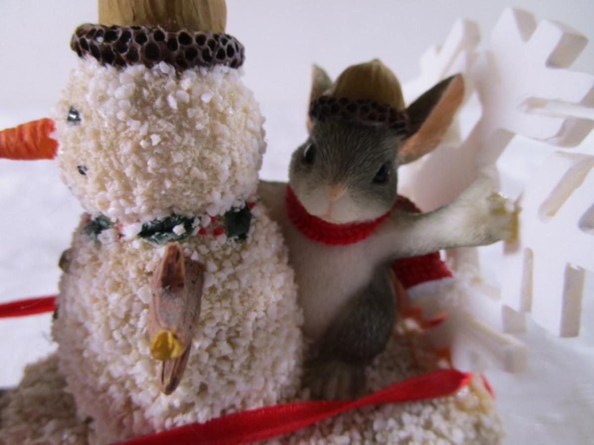 Bird is pulling, mouse on bird, Snowman and bunny riding, snowflake at back, 4" tall x 6" long