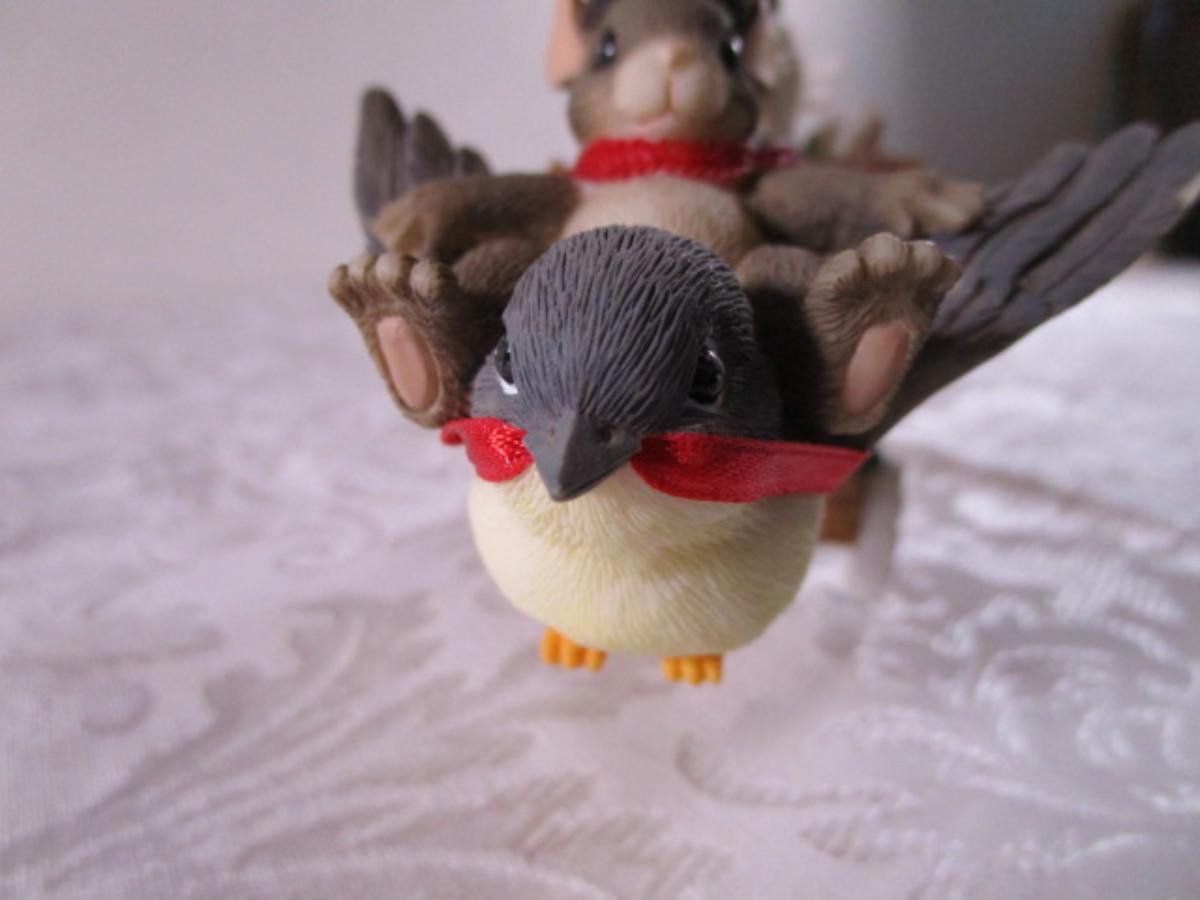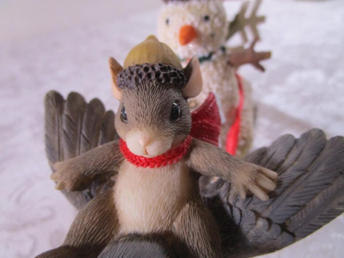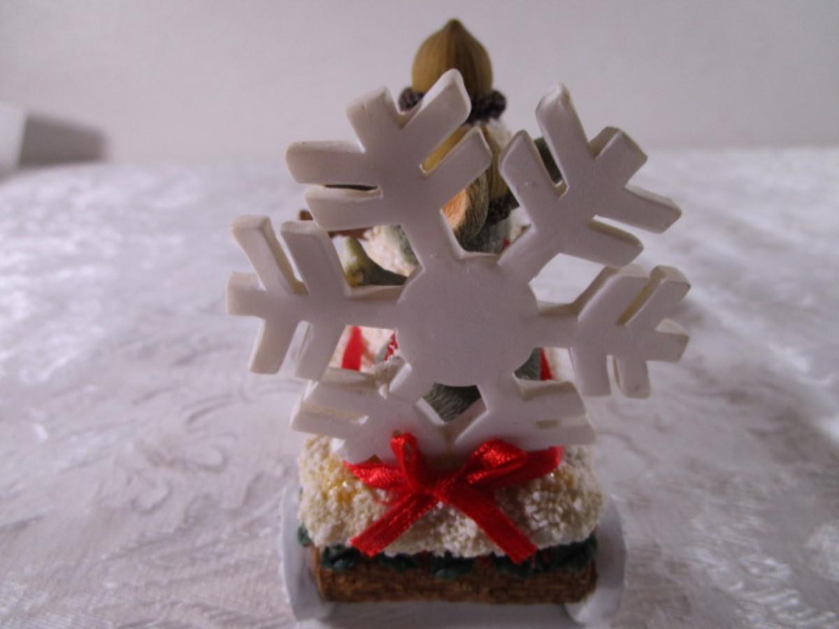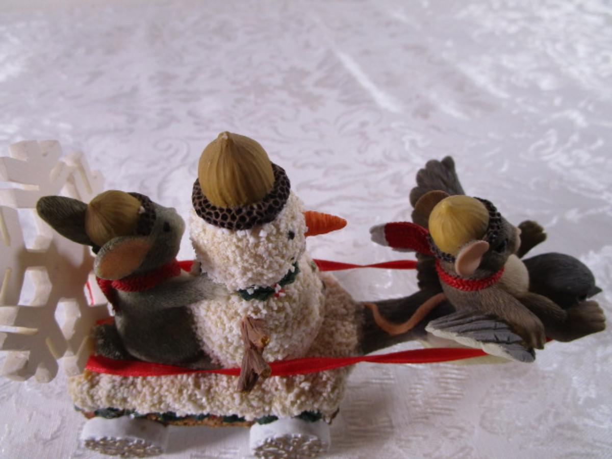 Bird is pulling, mouse on bird, Snowman and bunny riding, snowflake at back, 4" tall x 6" long