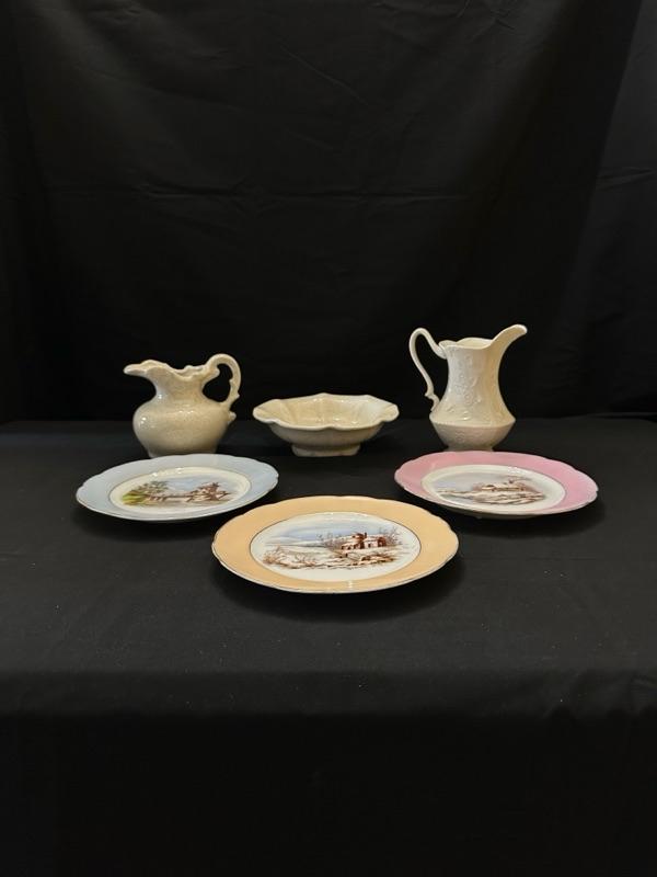 Lenox & McCoy Pitchers and Bowl with 3 Picturesque Plates. The are believed to be hand painted.