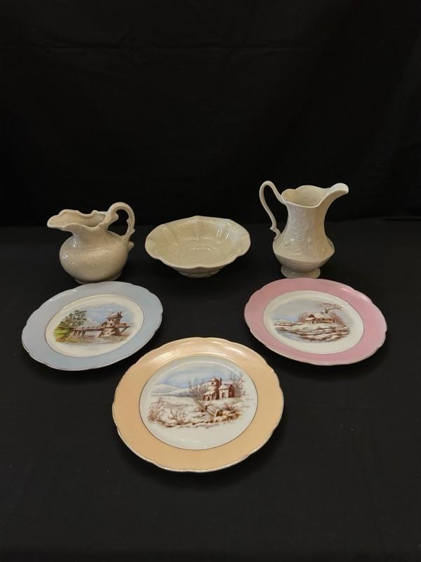 Lenox & McCoy Pitchers and Bowl with 3 Picturesque Plates