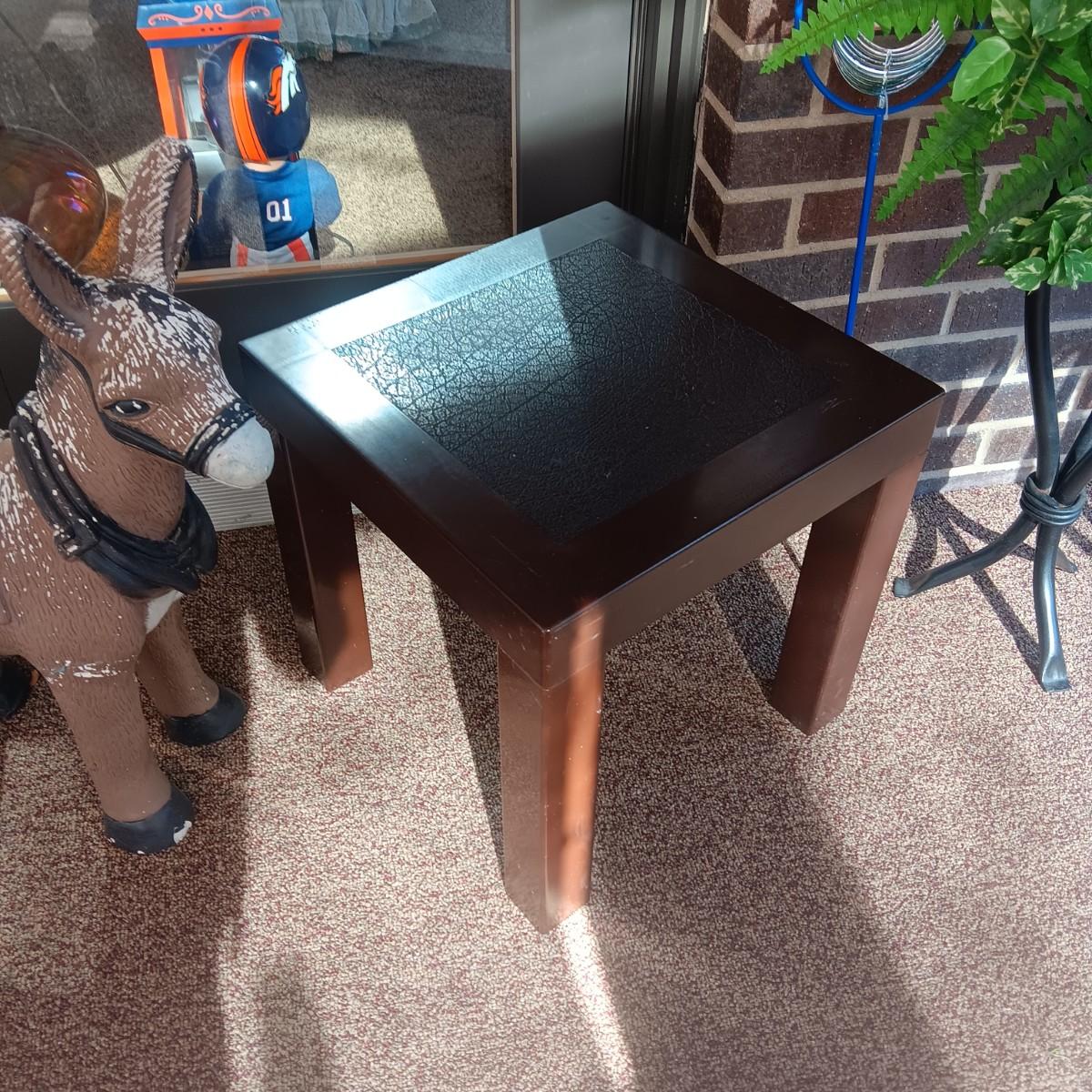 CERAMIC DONKEY YARD ART, 2 IRON PLANT STANDS AND A PLASTIC PATIO TABLE