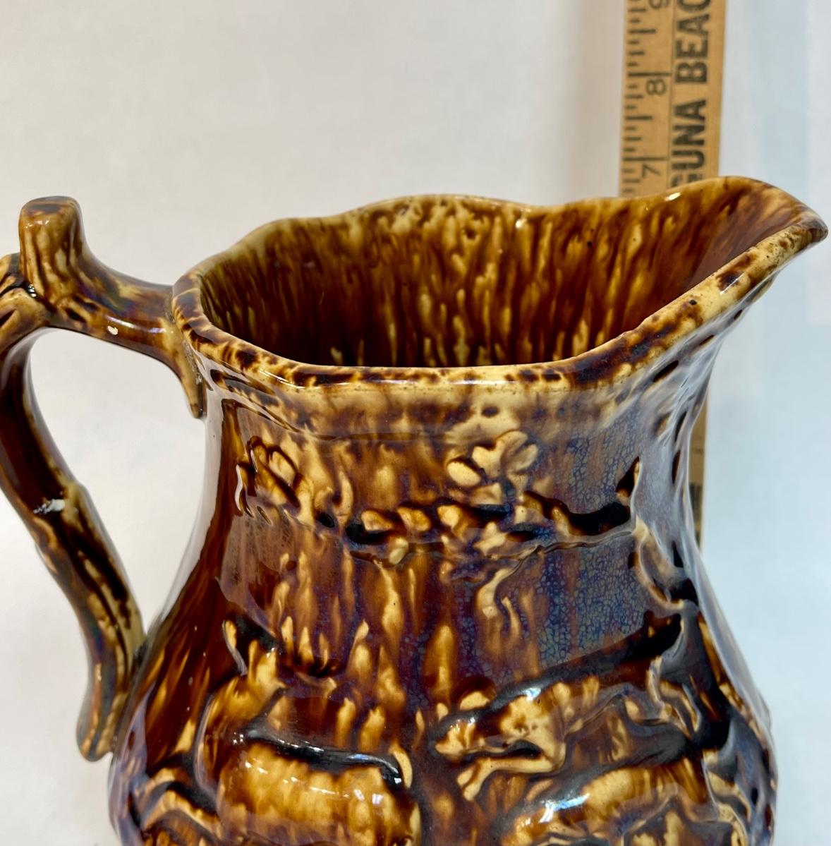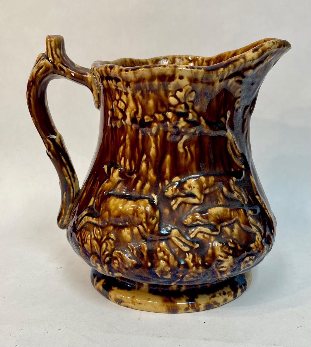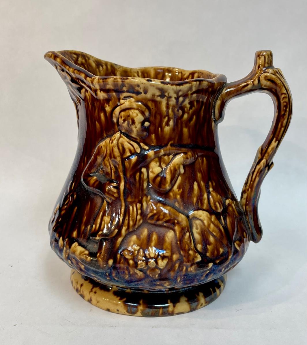 Vintage Brown Ceramic Dripware Pitcher Embossed Man with Gun Hunting Deer