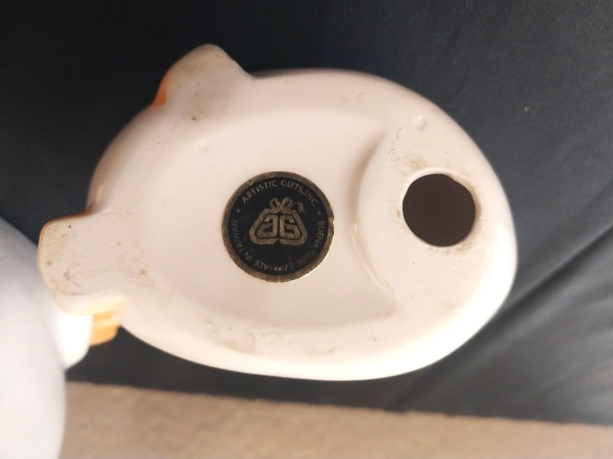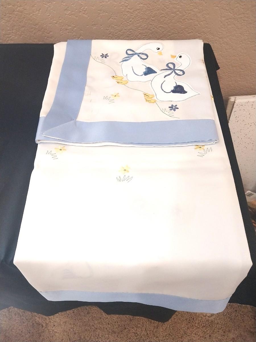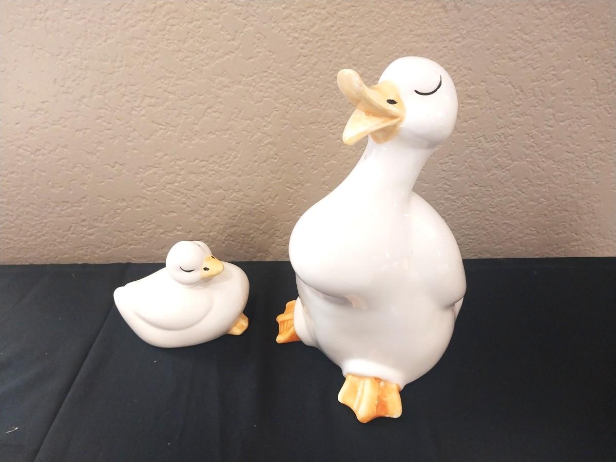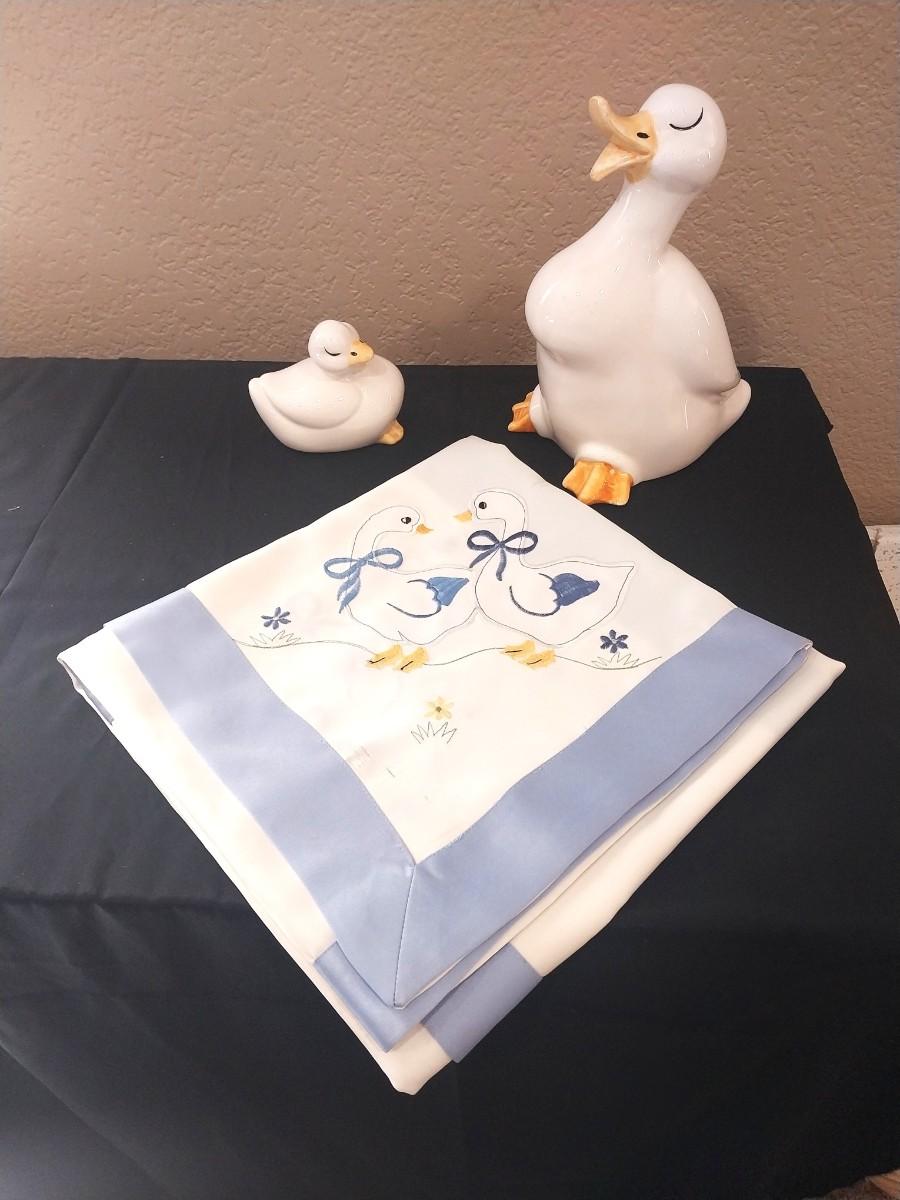 CERAMIC DUCKS AND SMALL TABLE COVER