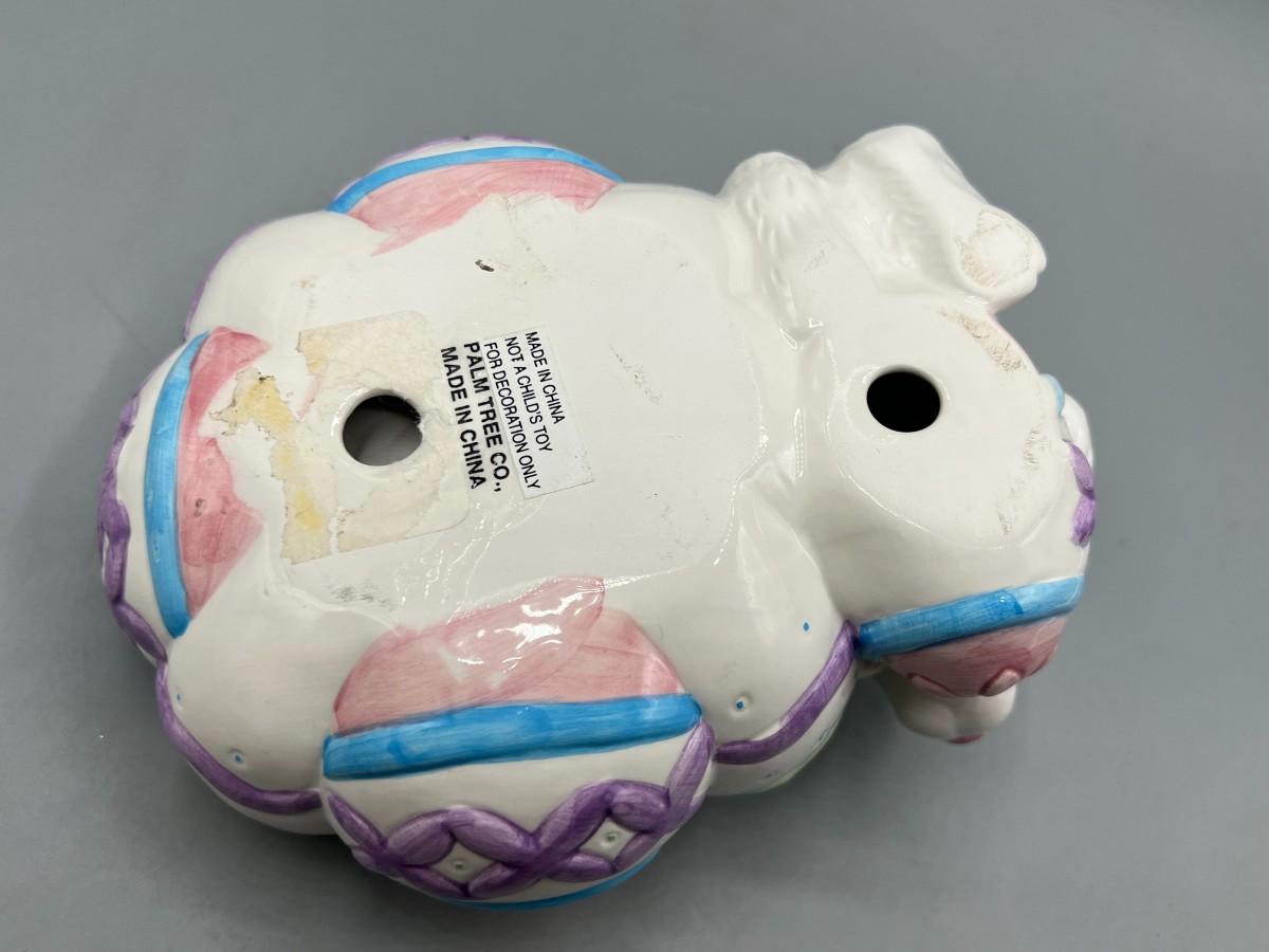 Ceramic Easter Bunny Colorful Egg Candy Trinket Dish. Good condition. About 5" size.