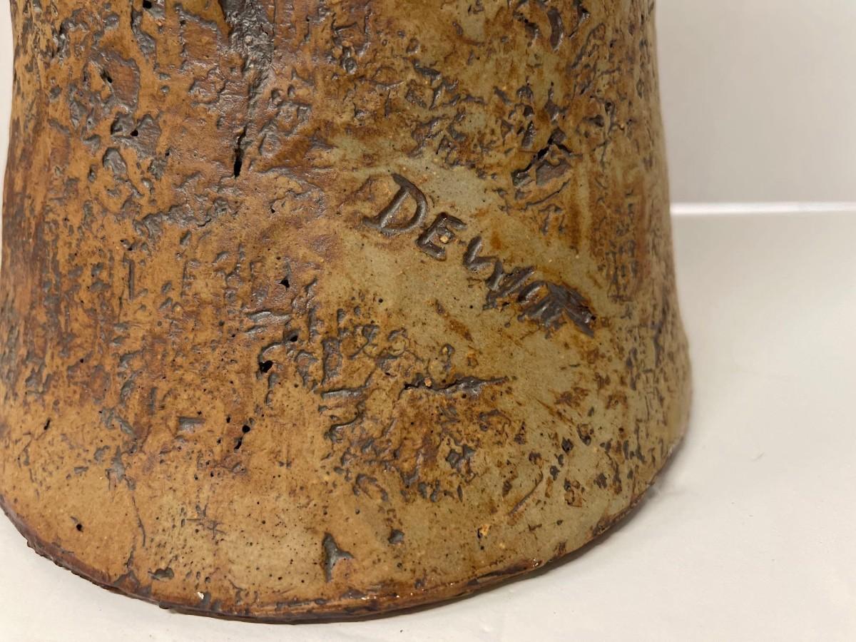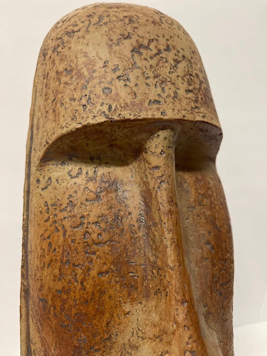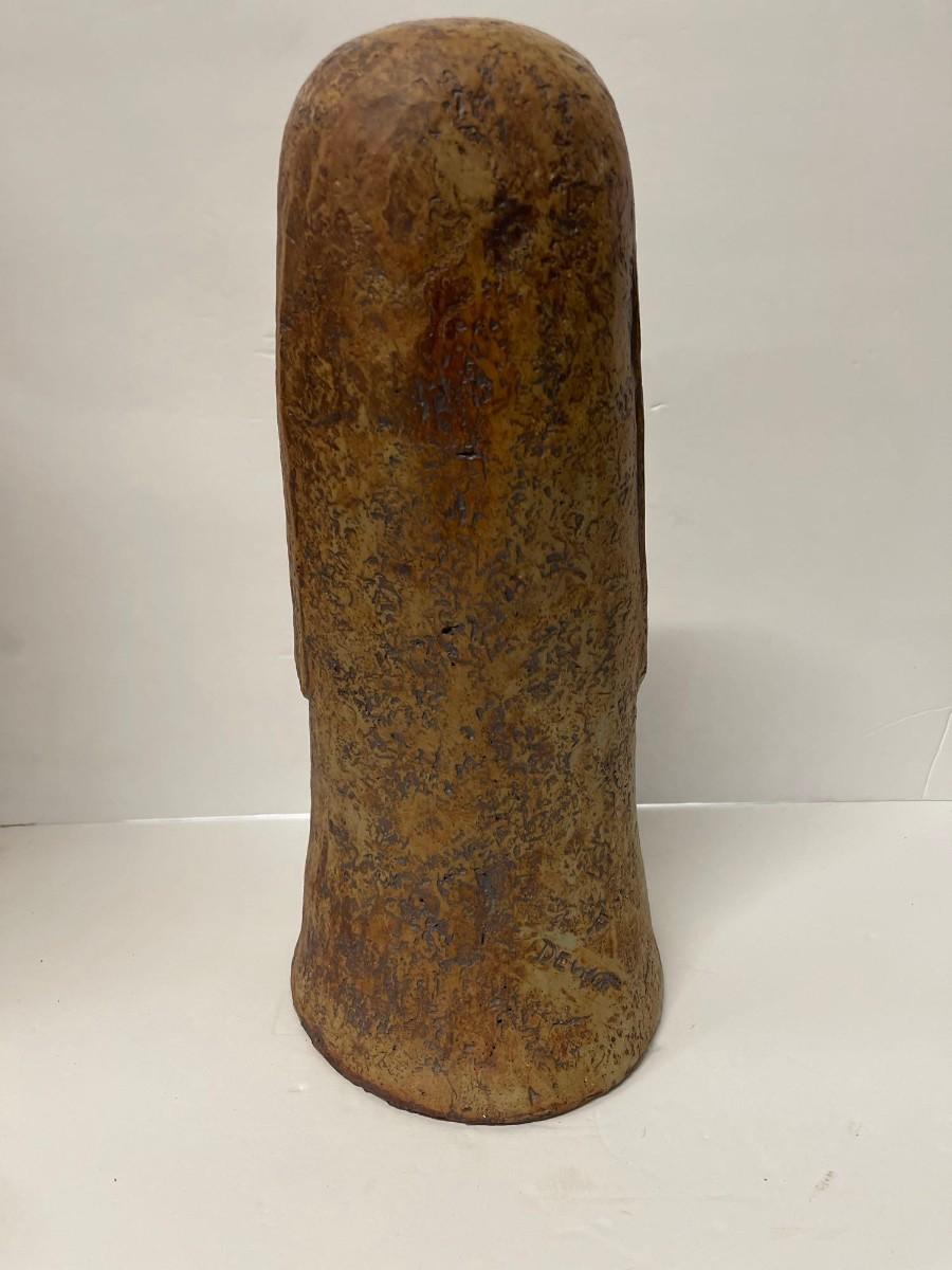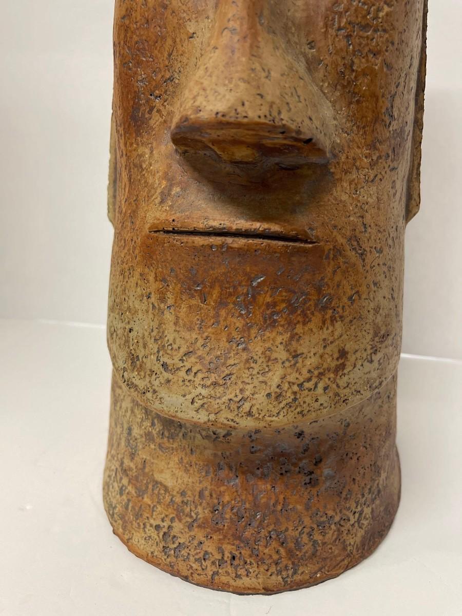 Ceramic Easter Island Head by Dewitt. The real Easter Island heads, referred to as Moai (meaning statue) in their native language, are monolithic sculptures. They depict human figures, said to be representations of the island inhabitants' ancestors. This depiction of an Easter Island head is 16 1/2” and signed by the artist