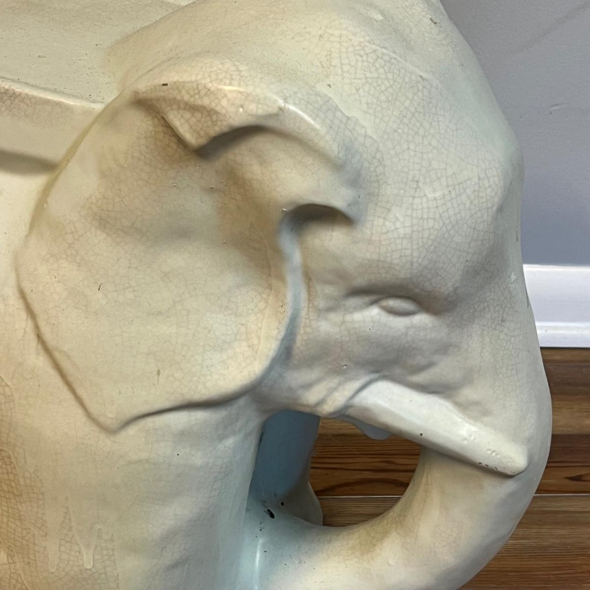 This ceramic elephant has a pale blue glaze and is hollow. It has a few nicks and blemishes shown in images.