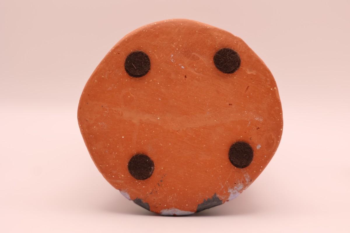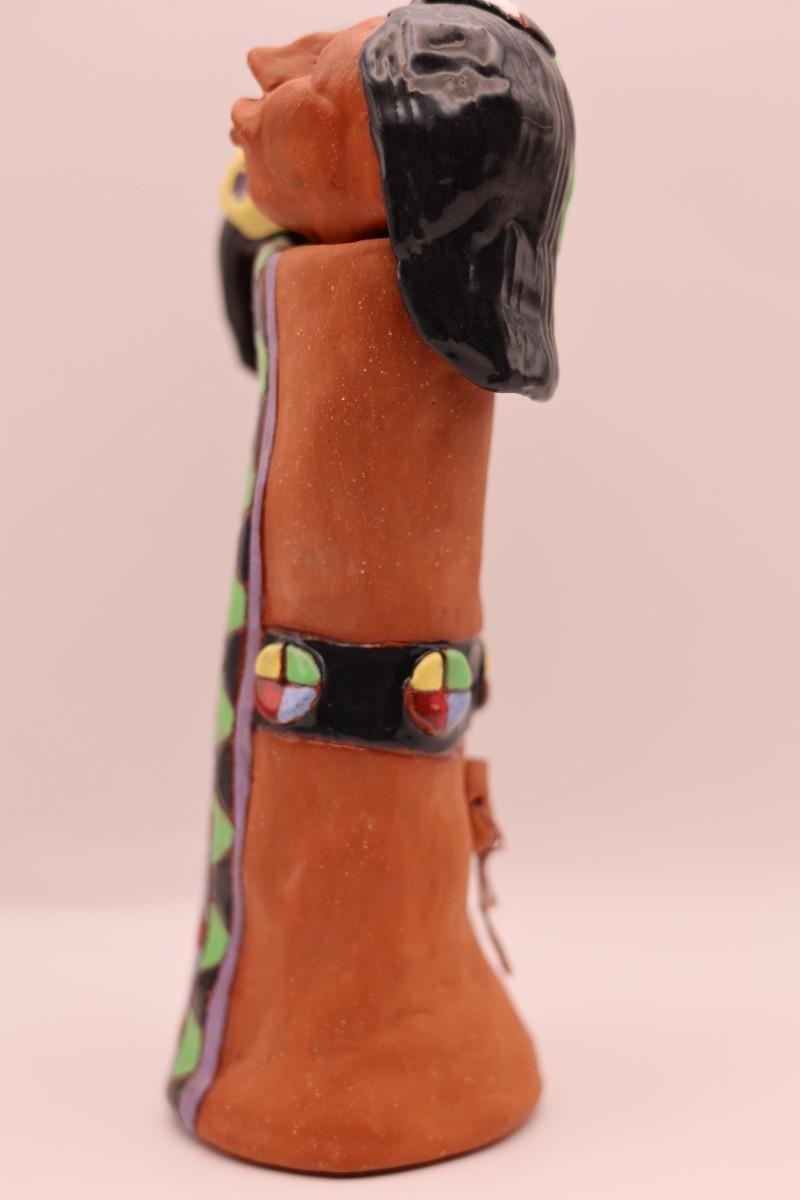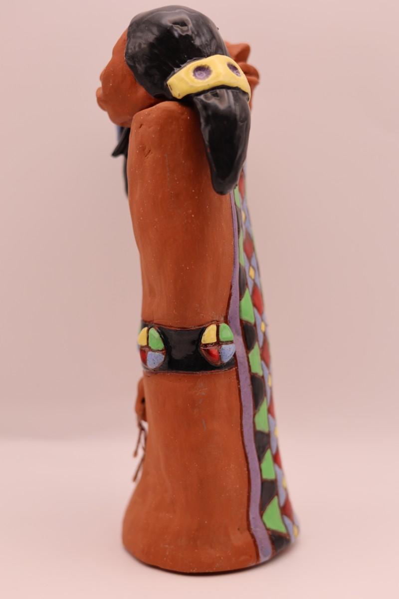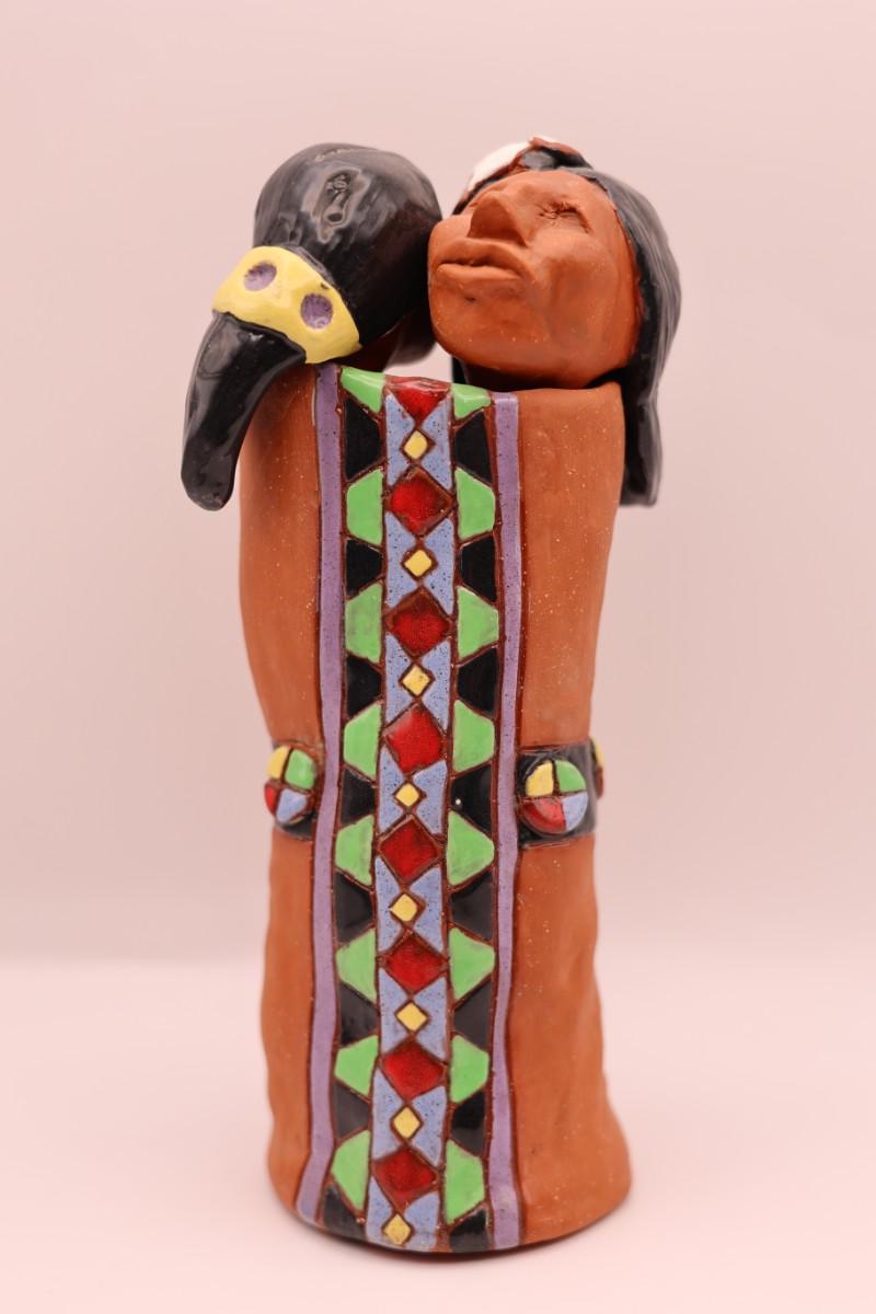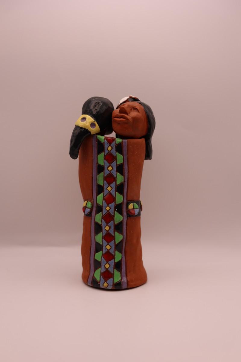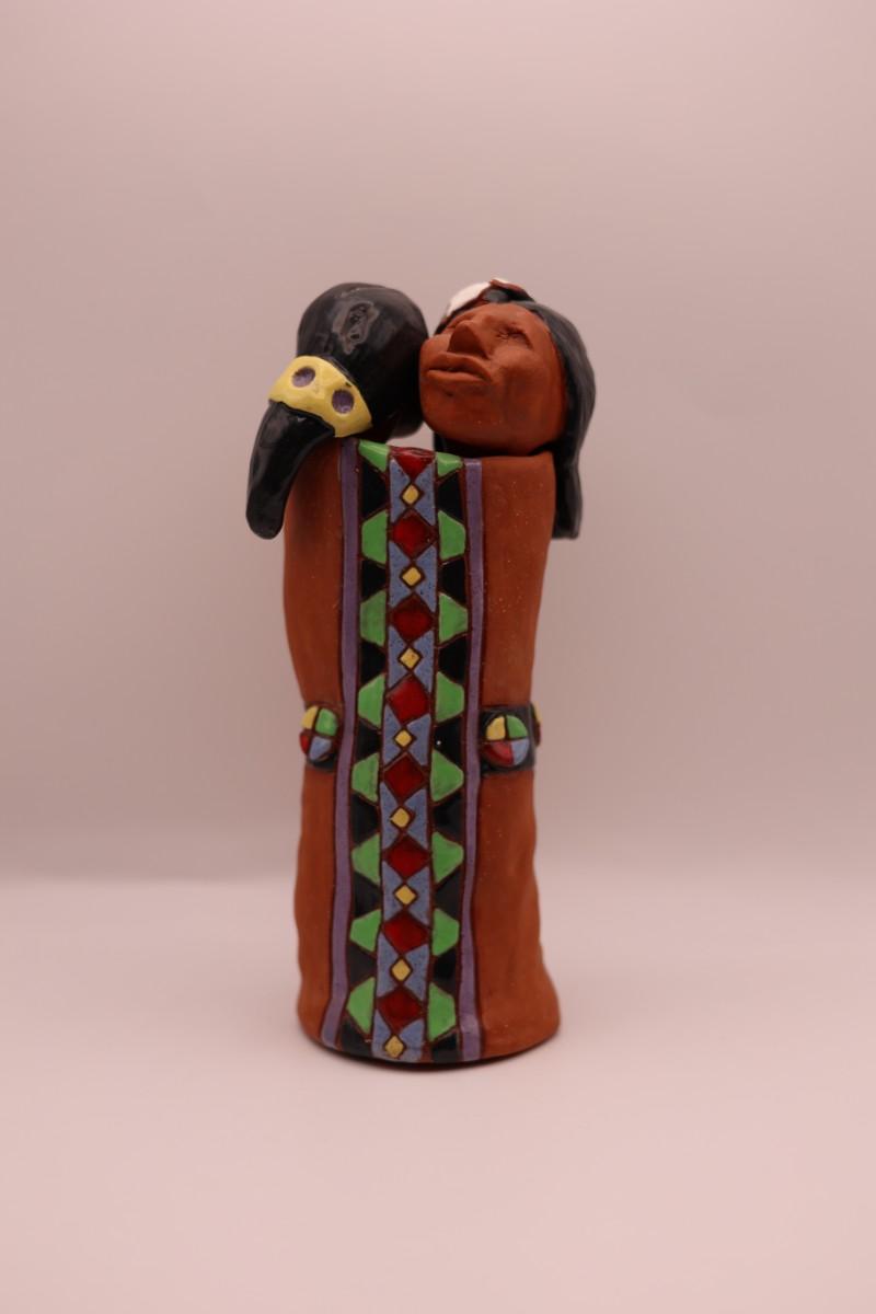 Figural ceramic decanter depicting a person with a bird on the shoulder, designed with bottom pour opening for dispensing liquid. Stands upright on flat base with felt pads.