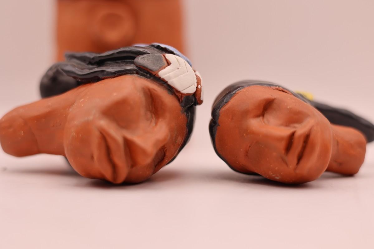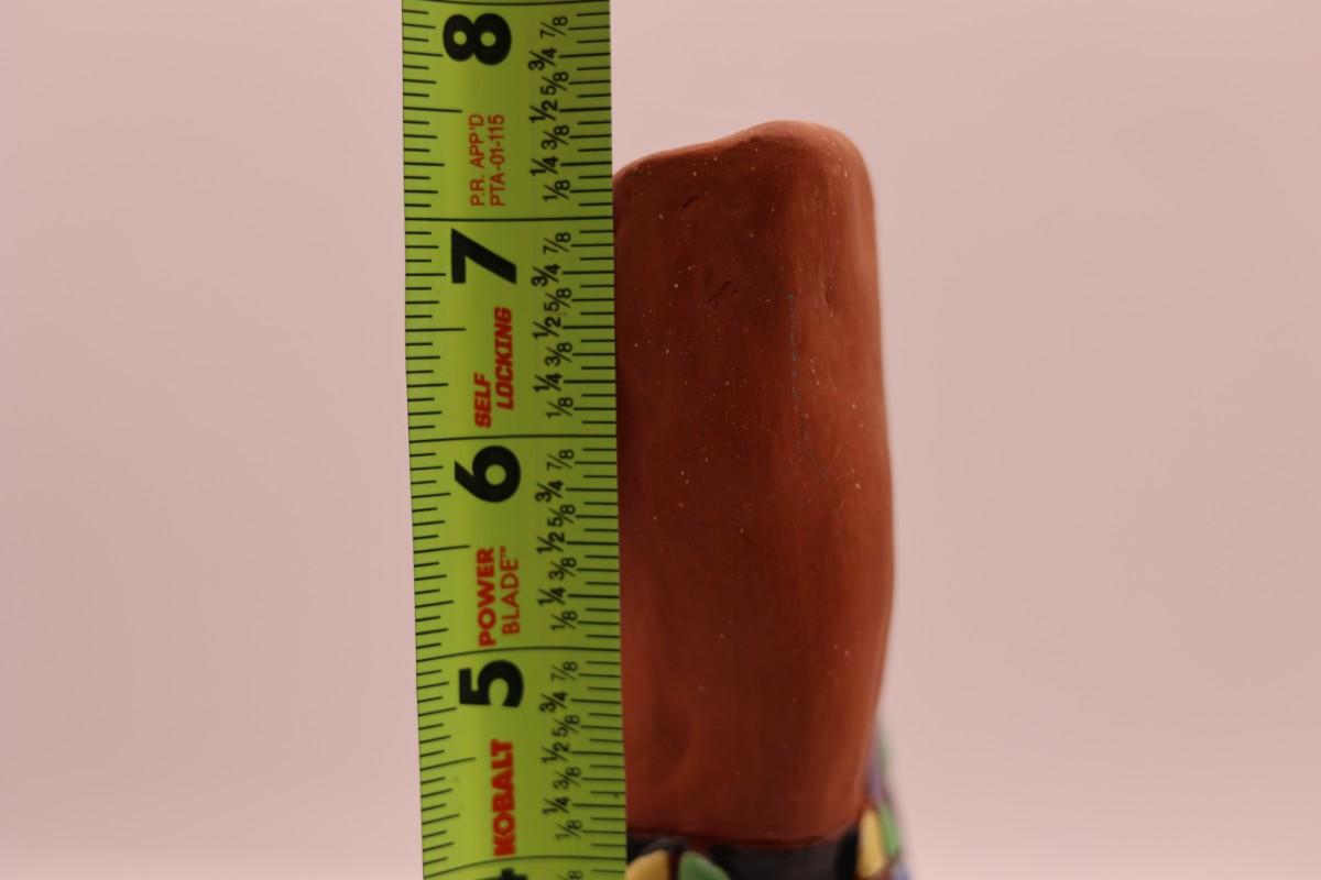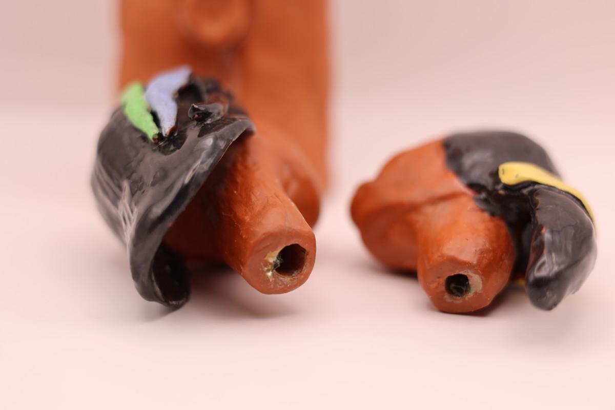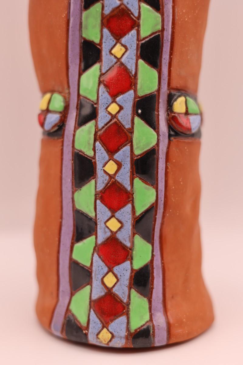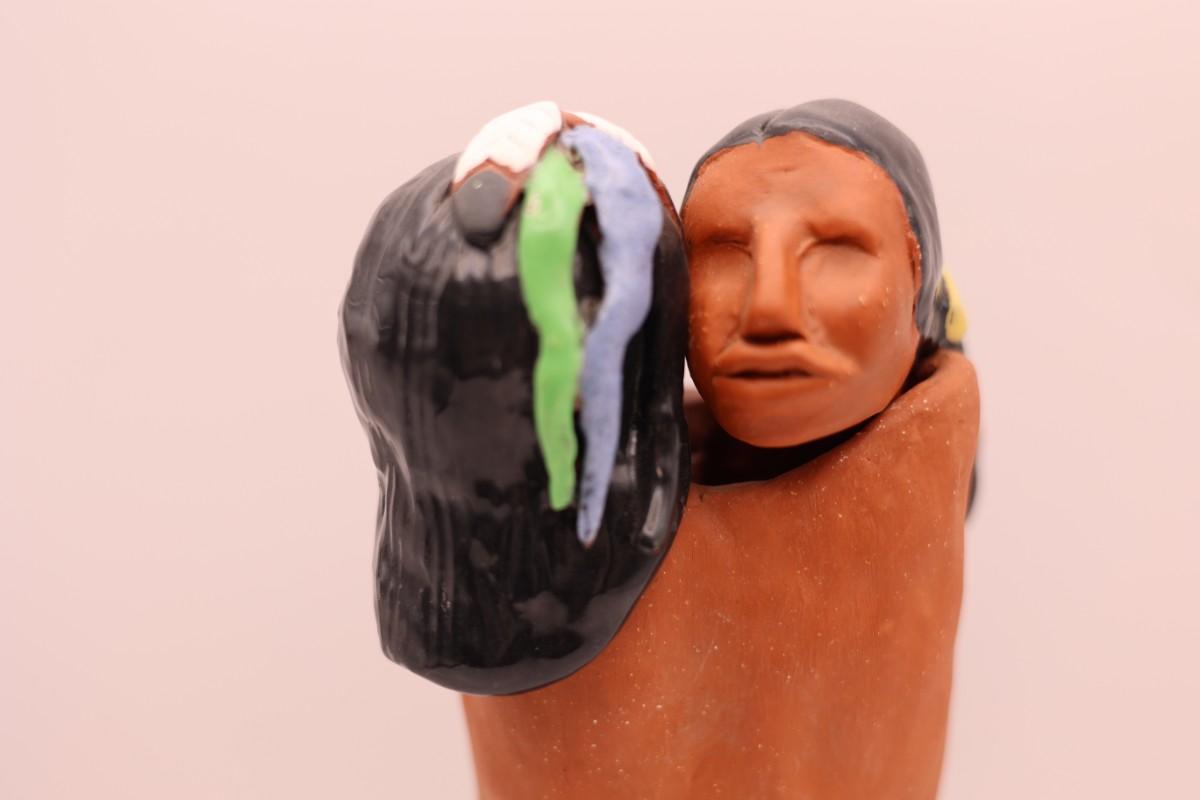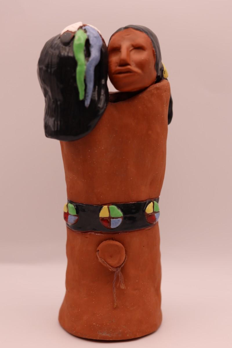 Figural ceramic decanter depicting a person with a bird on the shoulder, designed with bottom pour opening for dispensing liquid. Stands upright on flat base with felt pads.