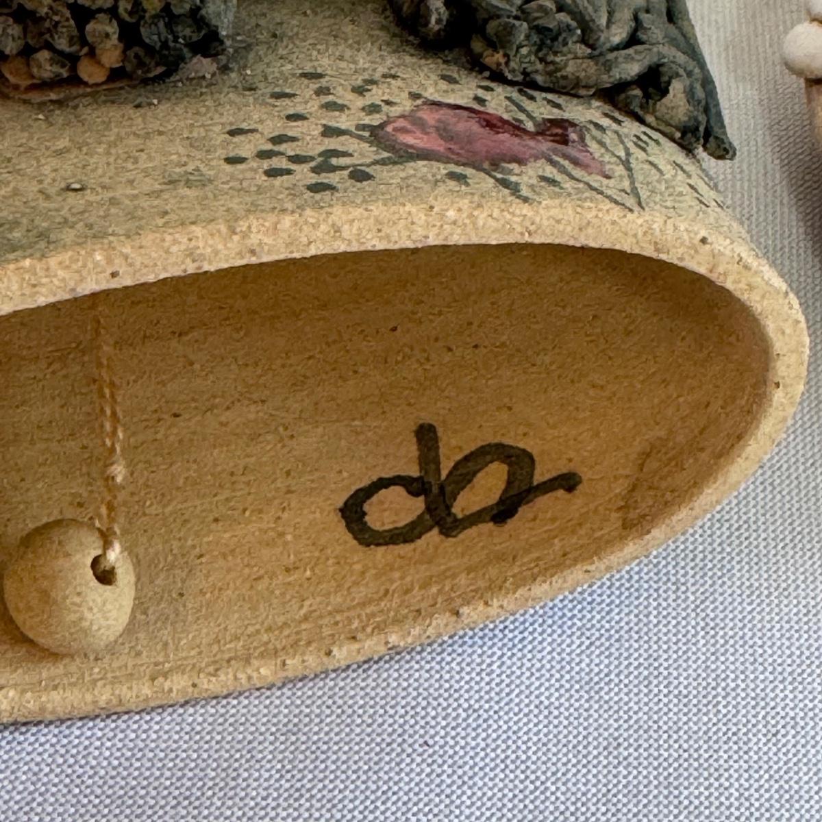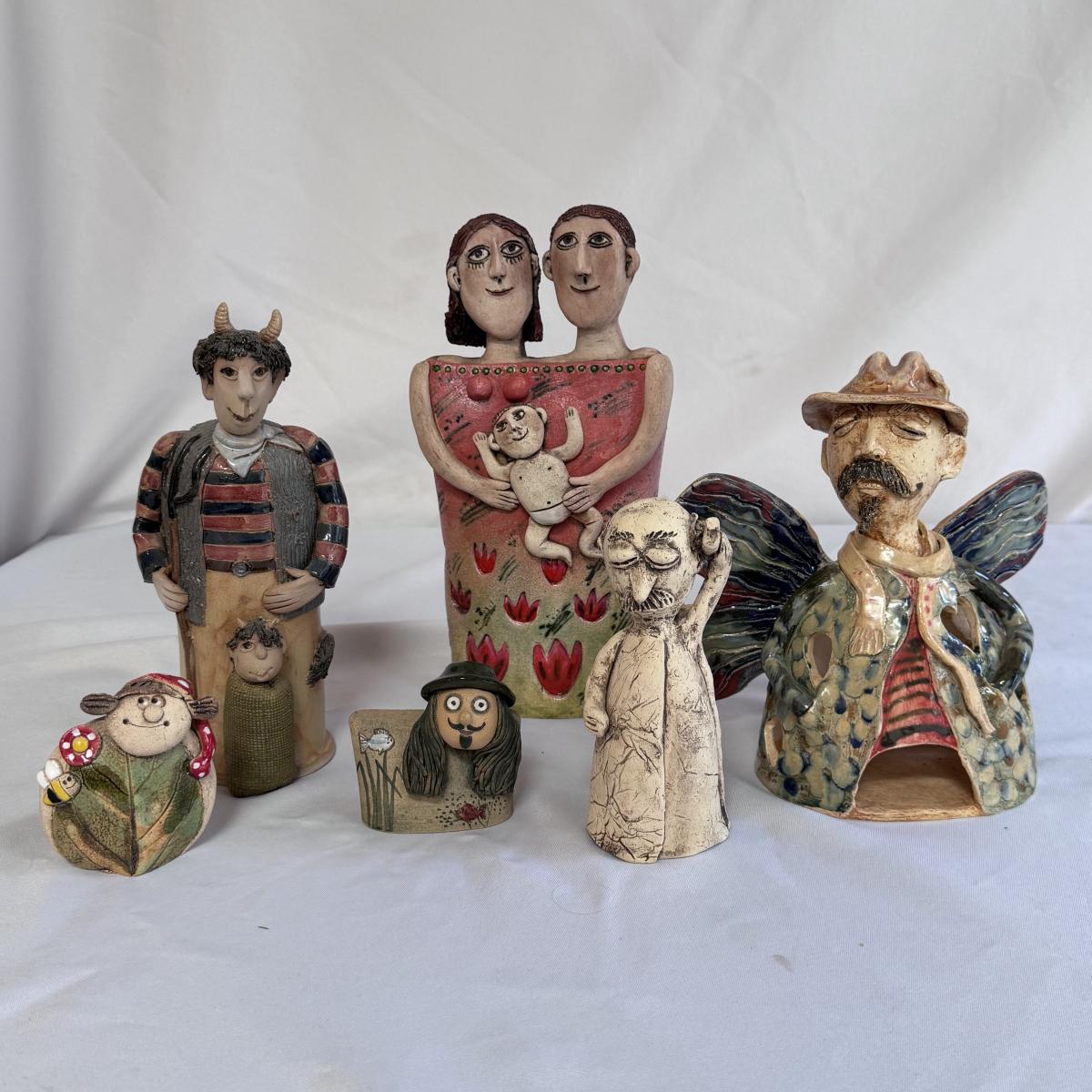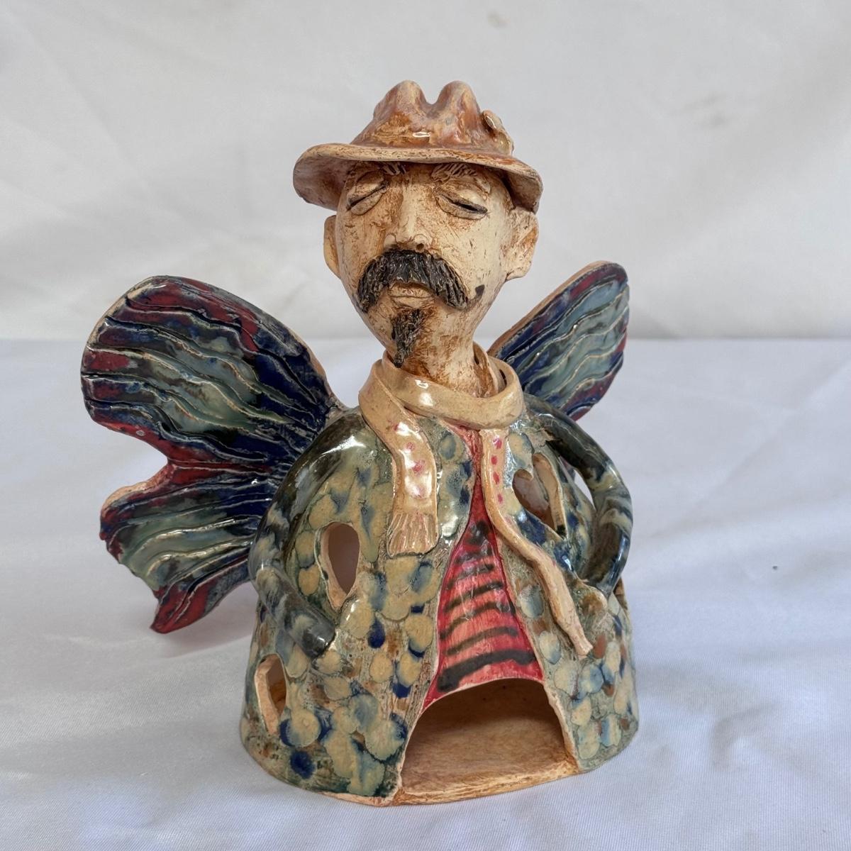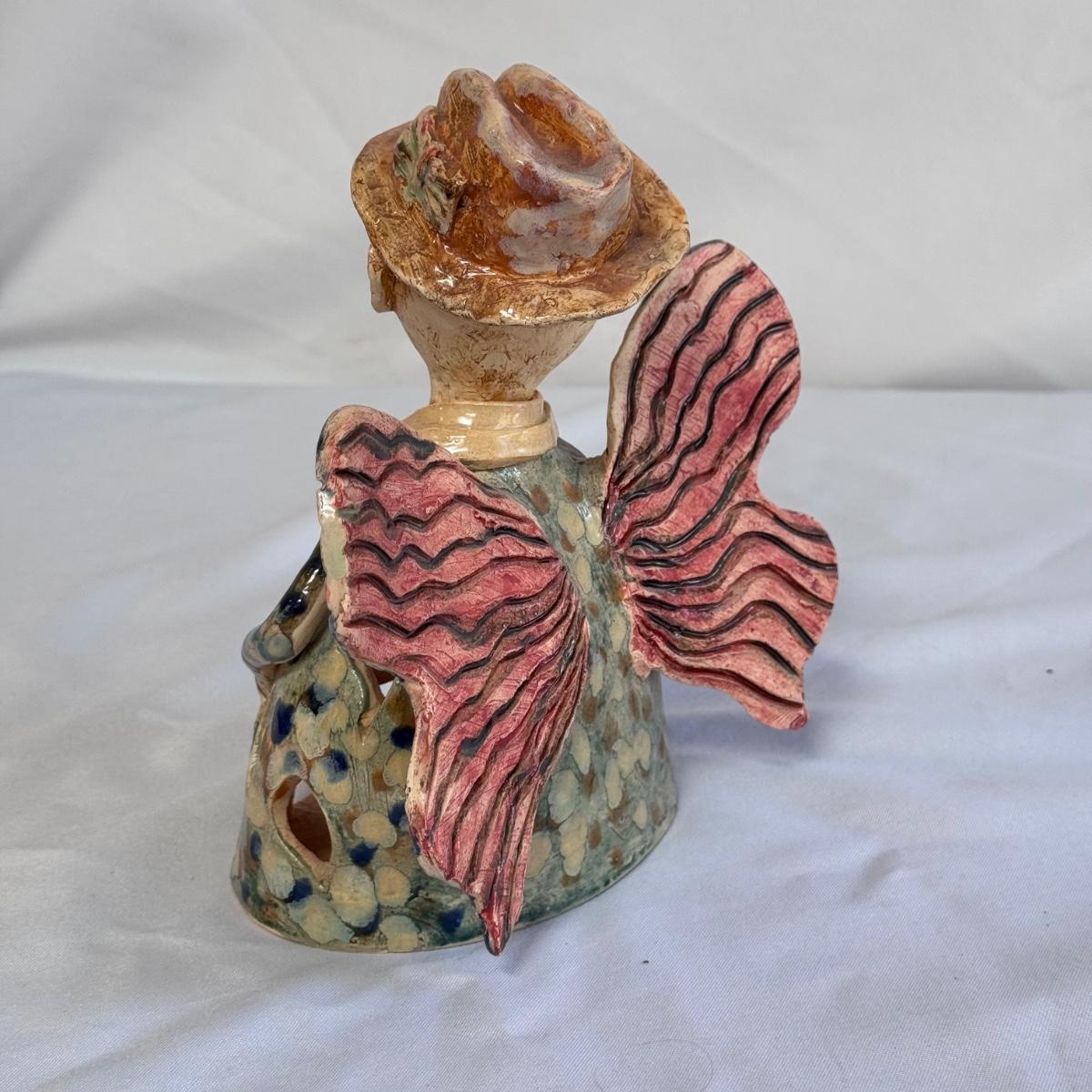 This lot includes four ceramic figurines with bells, along with two figurines without bells. Each piece is unique its own way. The butterfly man is stamped on the bottom with, what appears to be, the name Jan Herak Lokee. The sculpture of the two people holding a baby is the largest piece that measures 5.5” x 3.5” x 10.5”H. Shipping available. Shipping can be costly. We suggest contacting our preferred local shipping provider, Postage Express, with dimensions and getting an estimate before bidding: (828) 255-9250 or shipping@postageexpressnc.com.