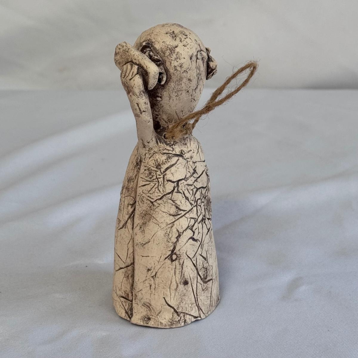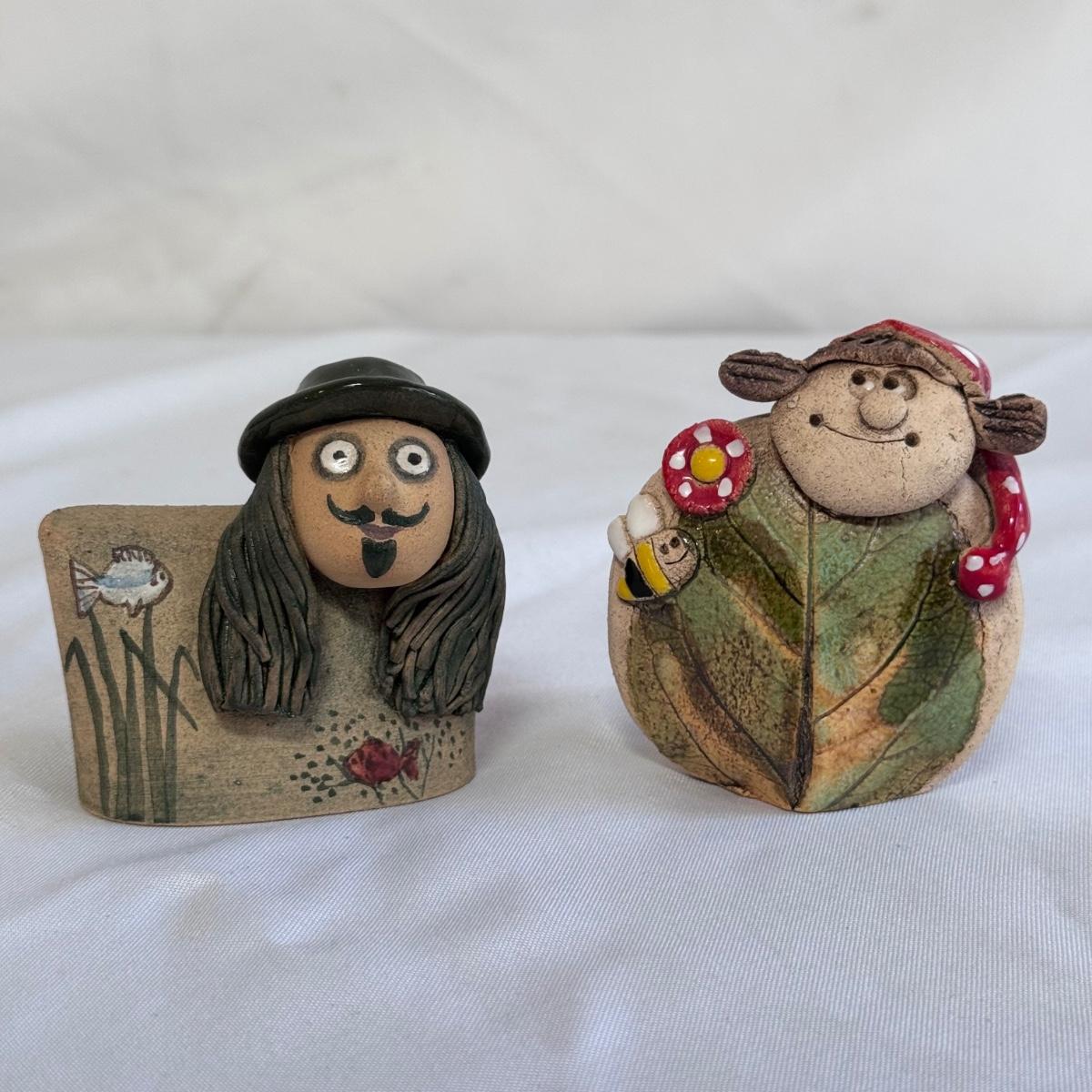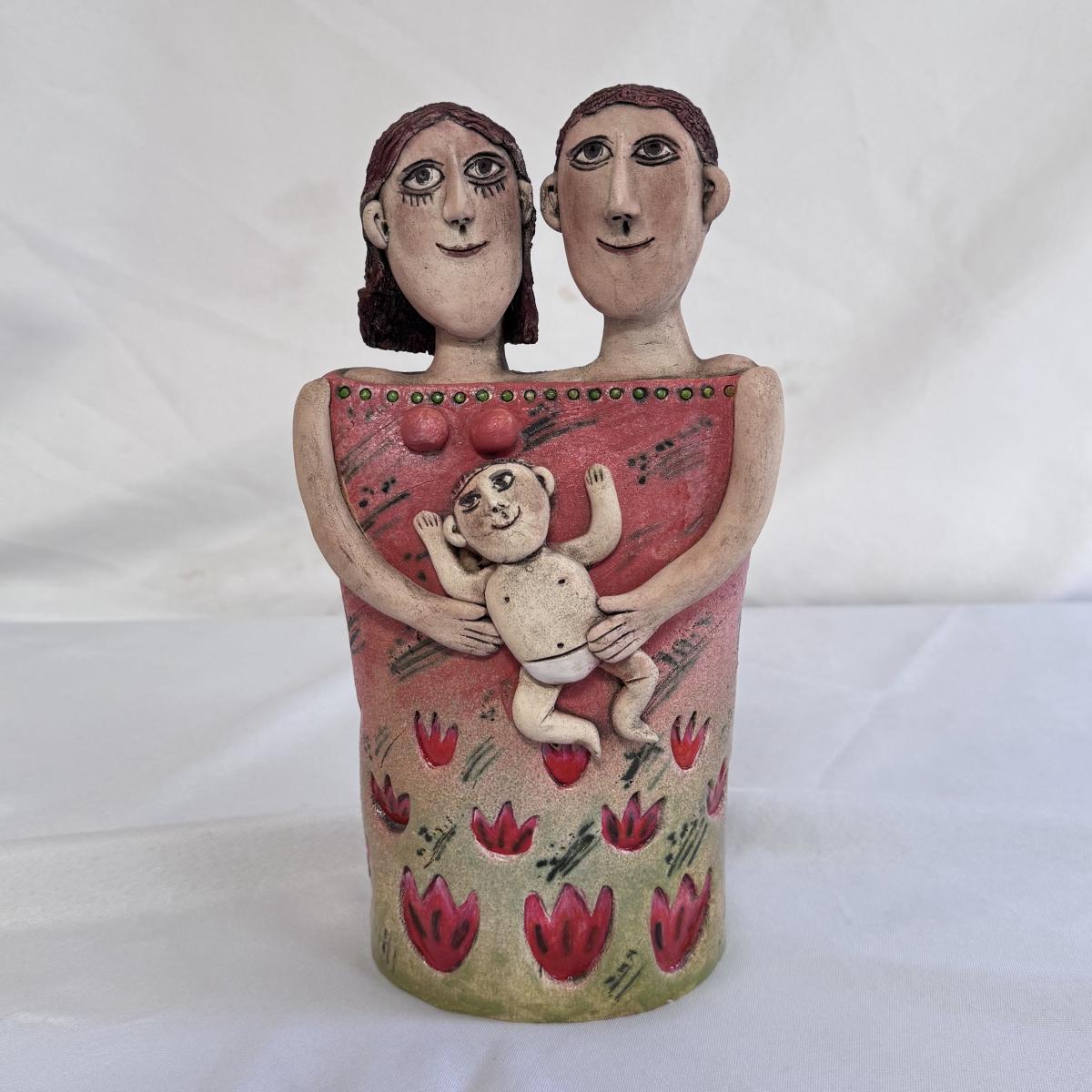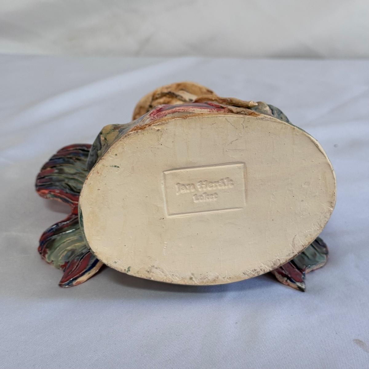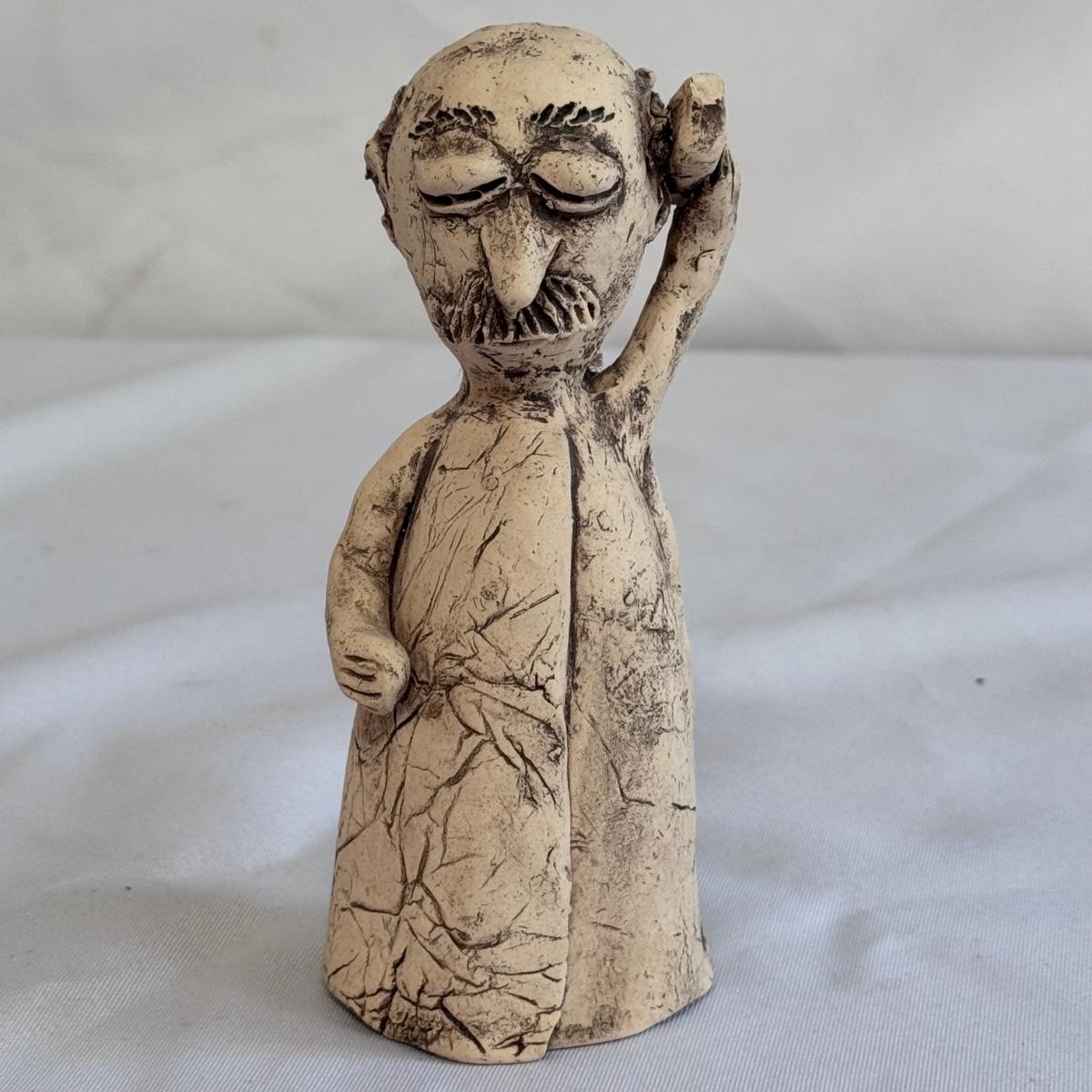 This lot includes four ceramic figurines with bells, along with two figurines without bells. Each piece is unique its own way. The butterfly man is stamped on the bottom with, what appears to be, the name Jan Herak Lokee. The sculpture of the two people holding a baby is the largest piece that measures 5.5” x 3.5” x 10.5”H. Shipping available. Shipping can be costly. We suggest contacting our preferred local shipping provider, Postage Express, with dimensions and getting an estimate before bidding: (828) 255-9250 or shipping@postageexpressnc.com.