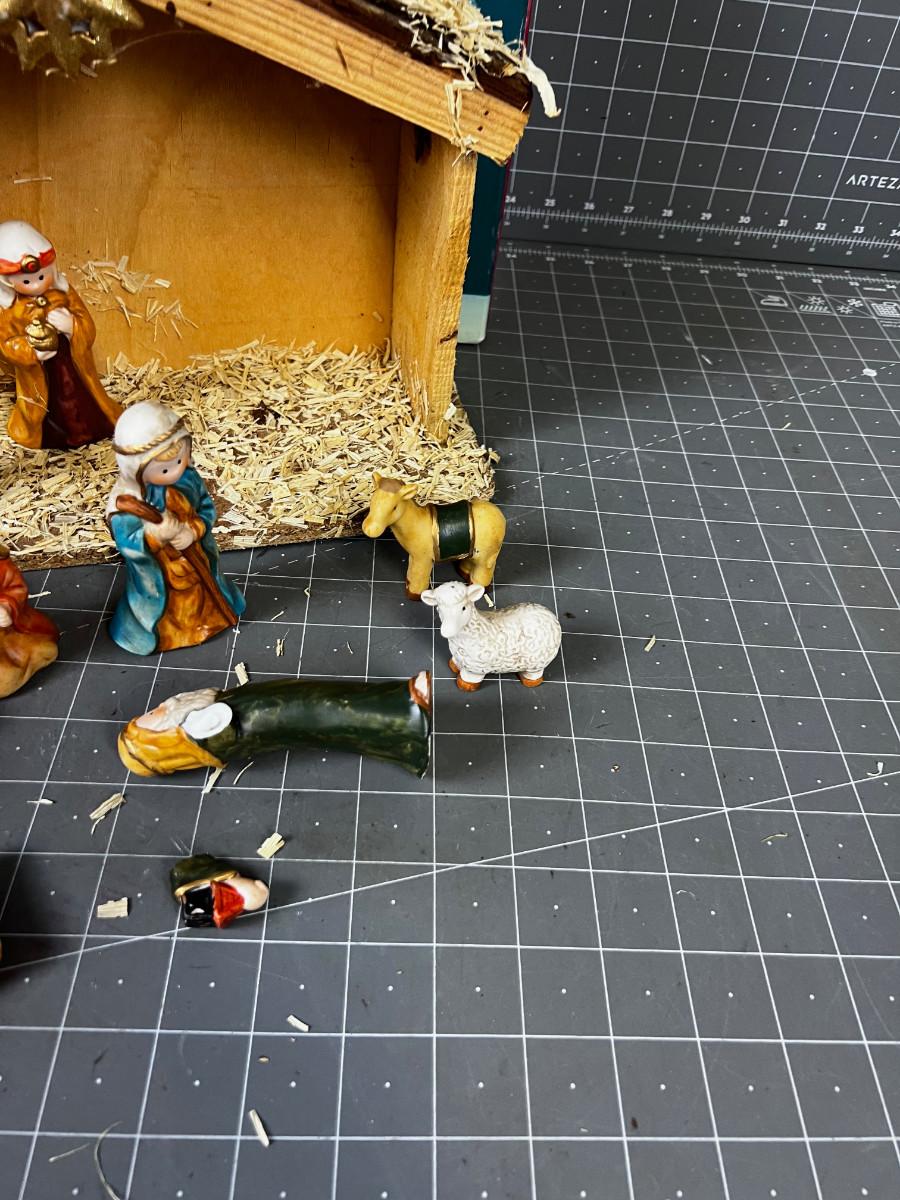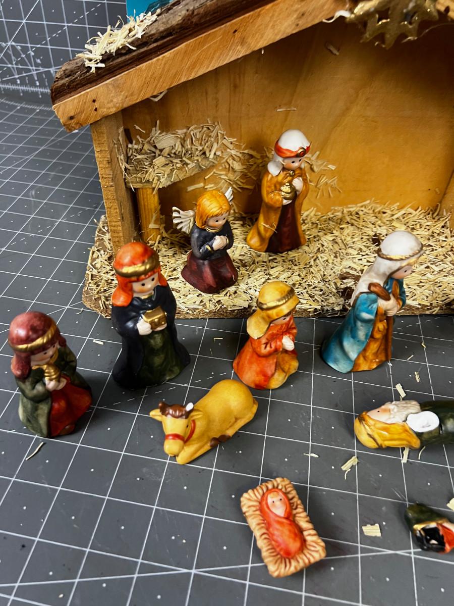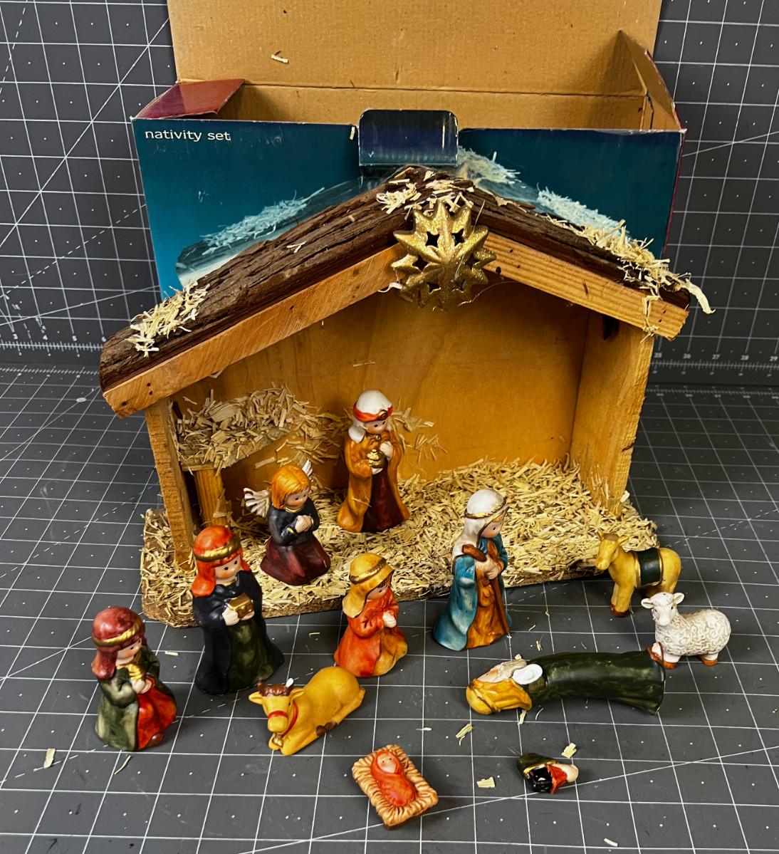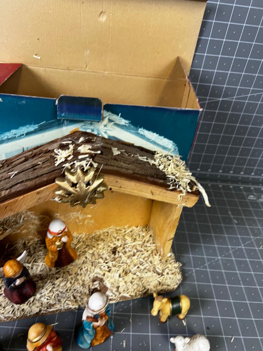 In Original Box. Used CUTE! Wiseman's arm is broken but can be repaired.
