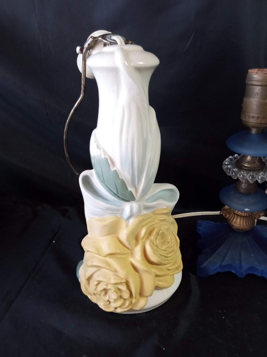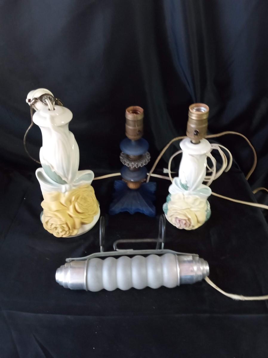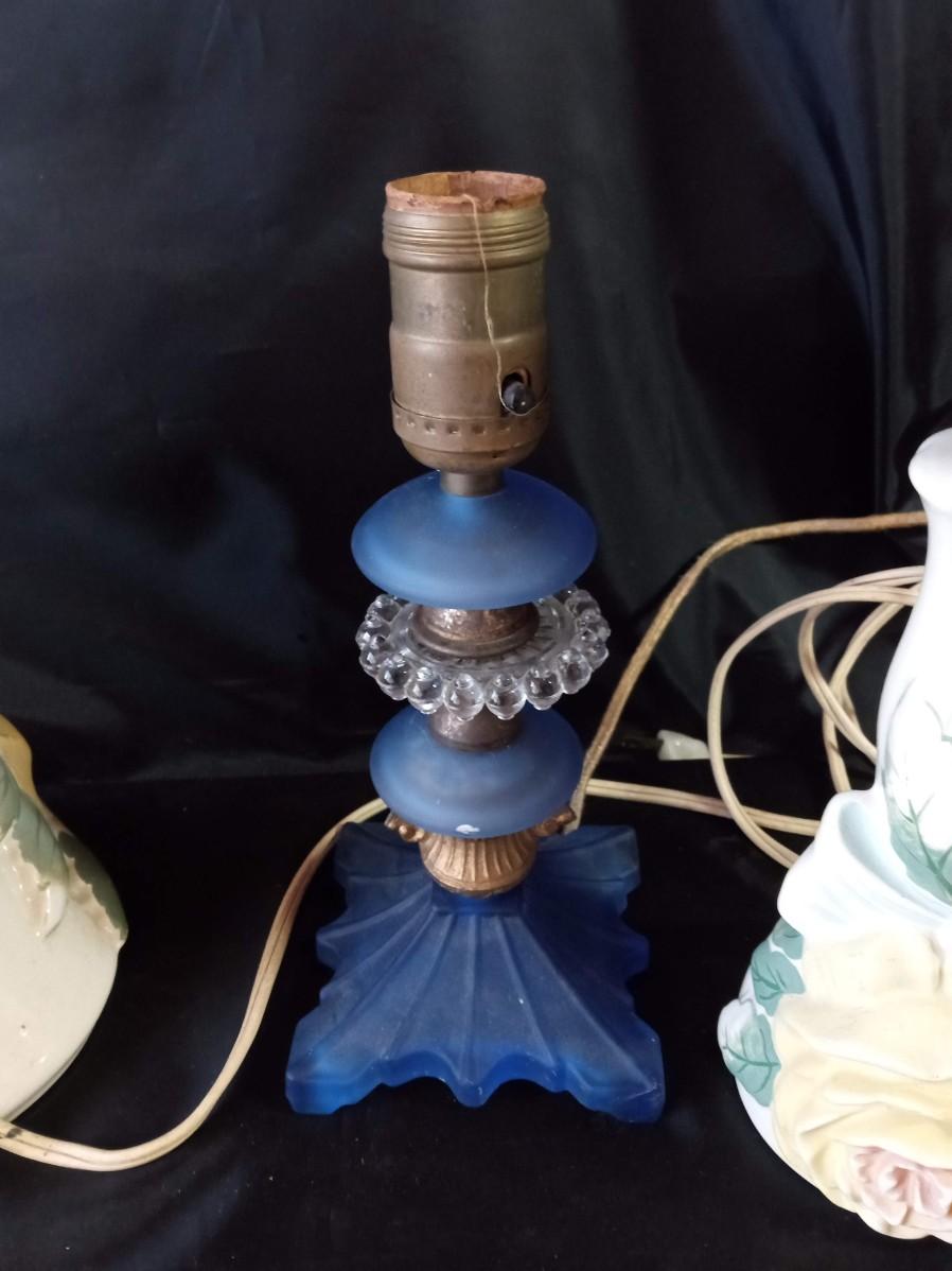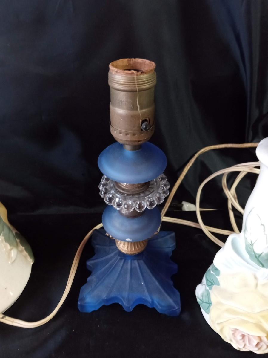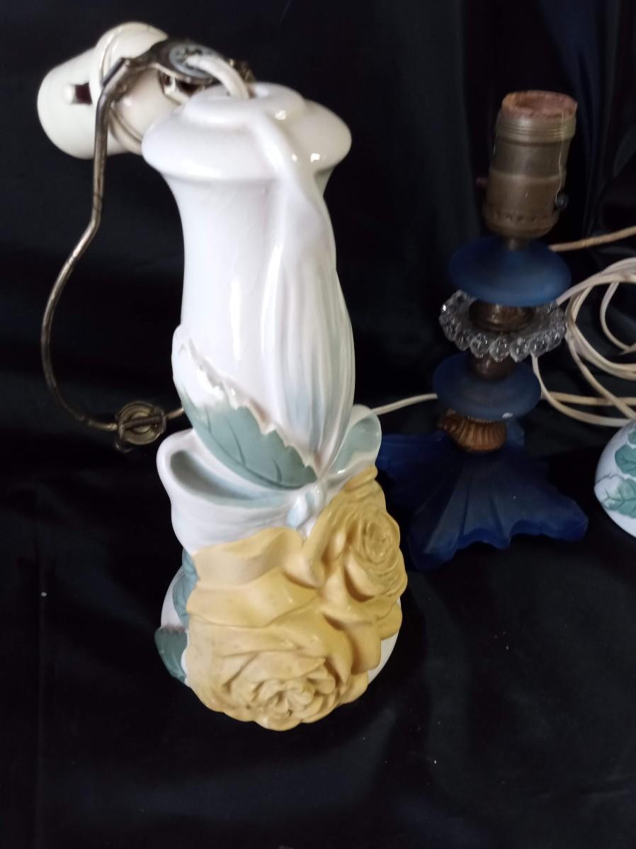 CERAMIC FLORAL LAMPS, BLUE GLASS LAMP AND HEADBOARD LIGHT