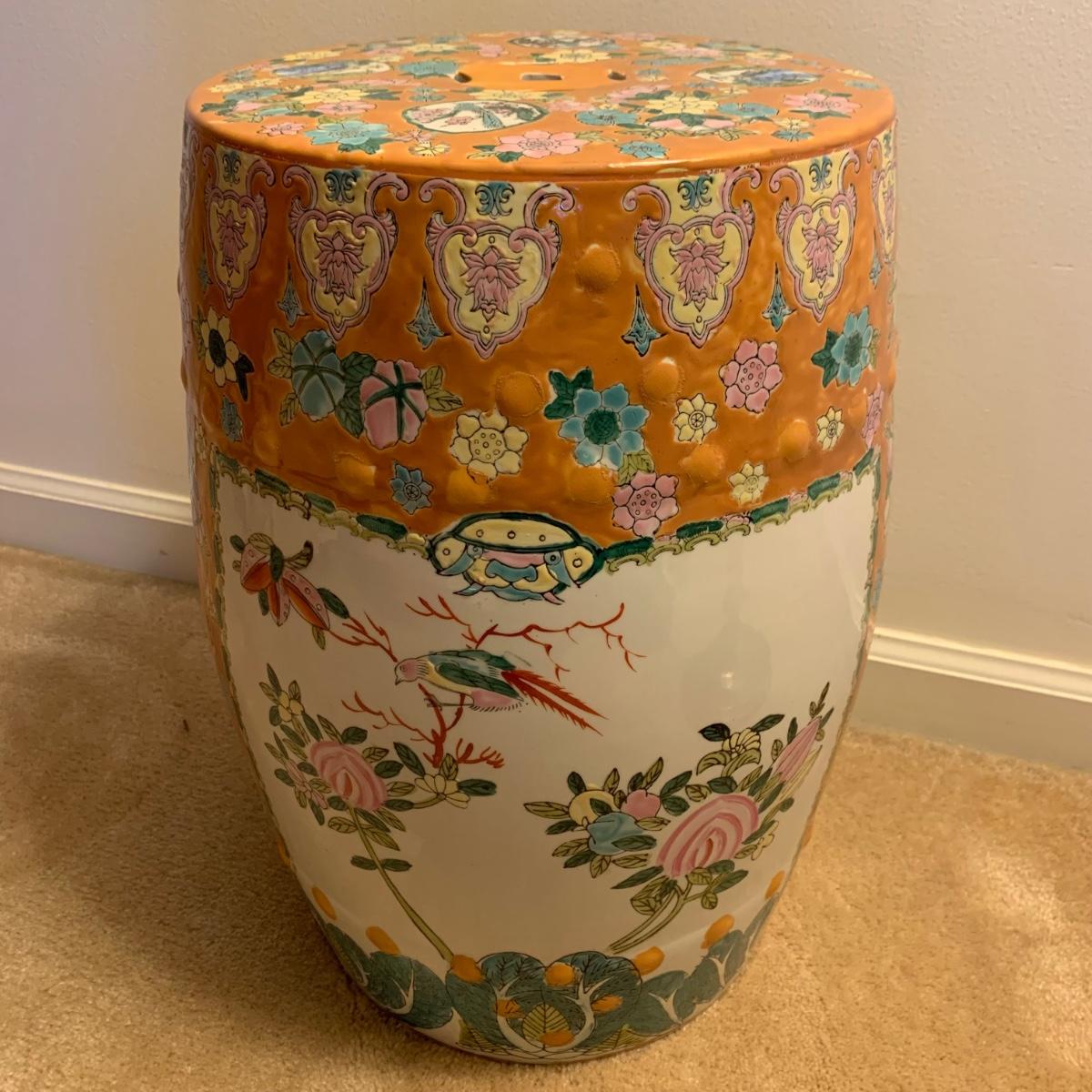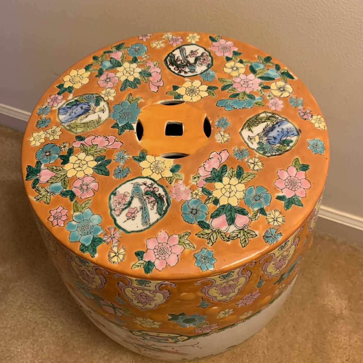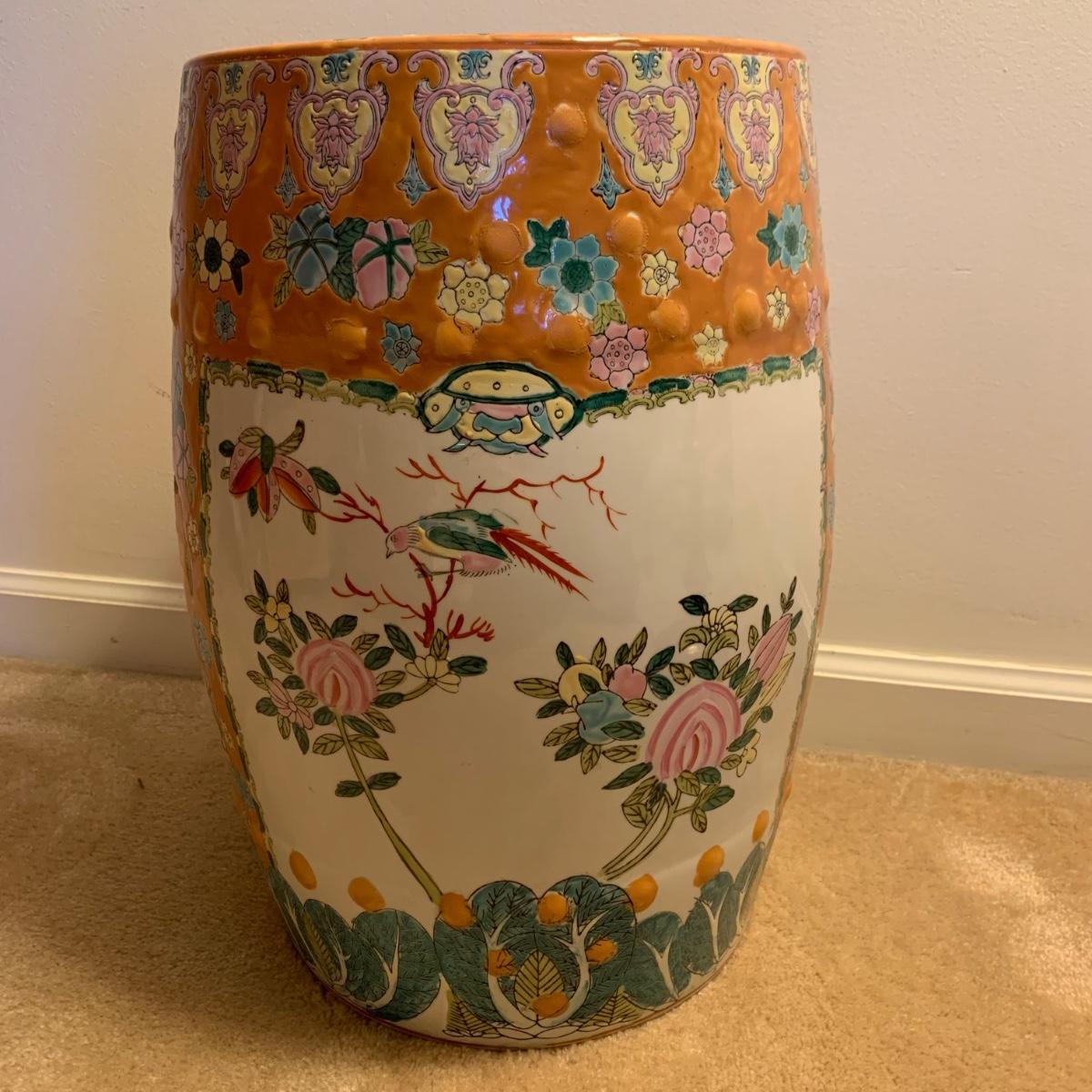Ceramic plant stand with a rust colored background and floral and bird design. It appears to be hand painted. Stand is approximately 12.5”D x 18.5”H.