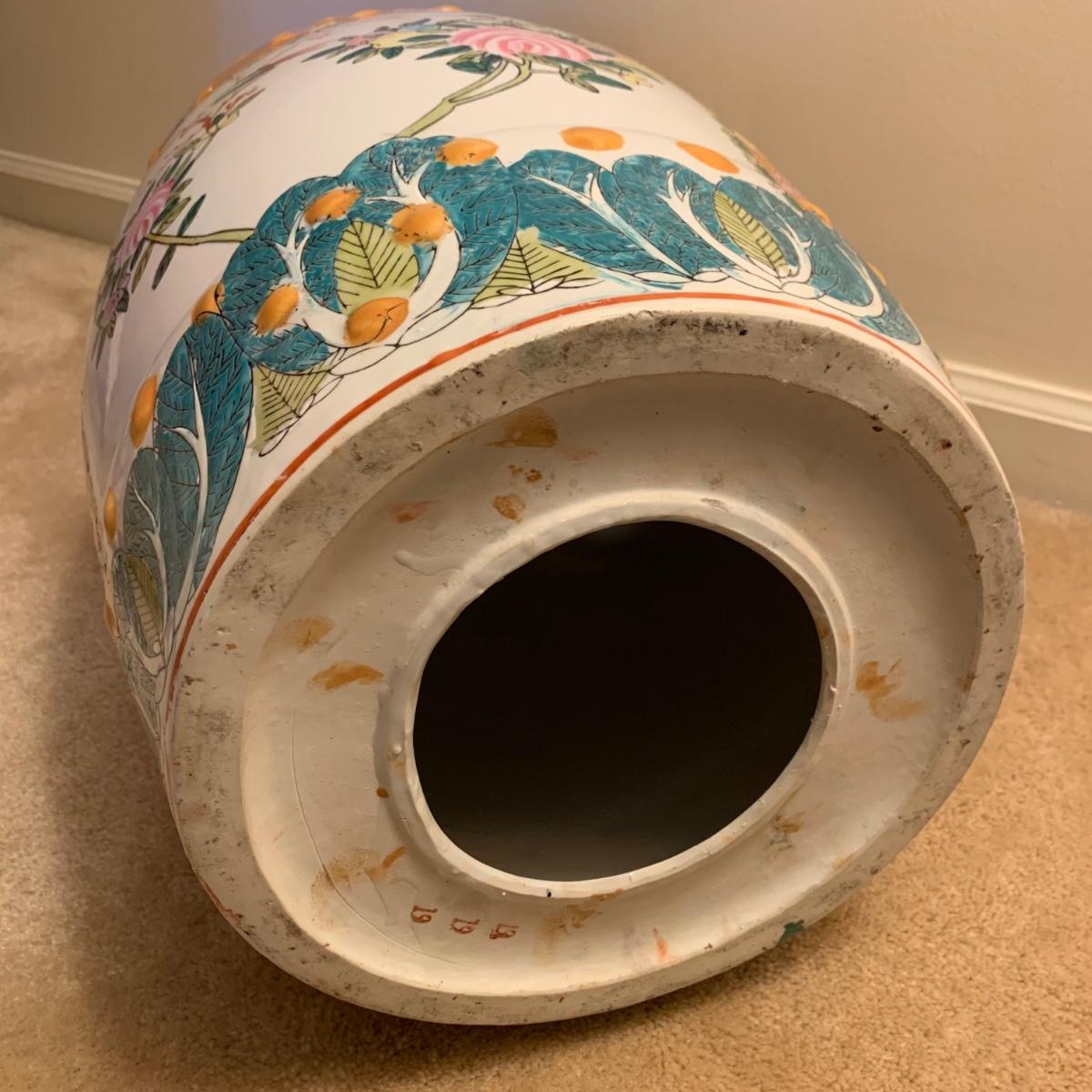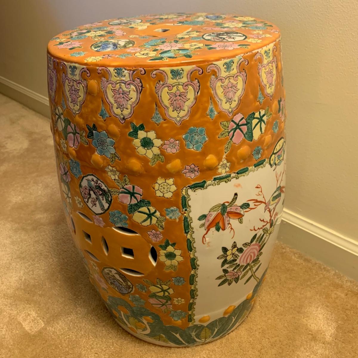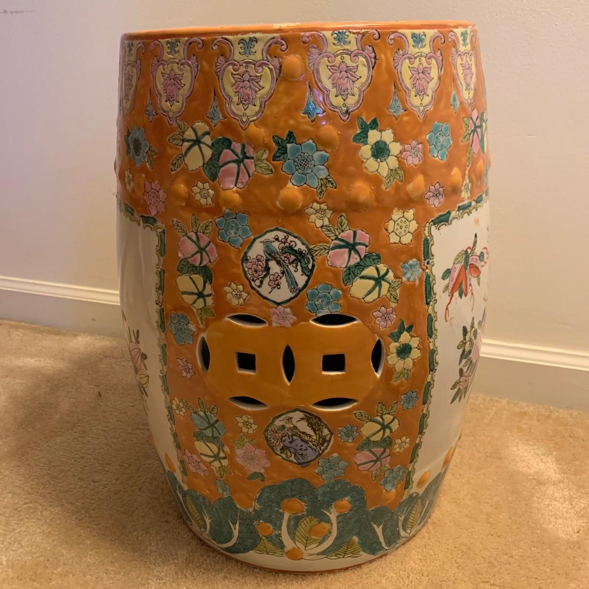 Ceramic plant stand with a rust colored background and floral and bird design. It appears to be hand painted. Stand is approximately 12.5”D x 18.5”H.