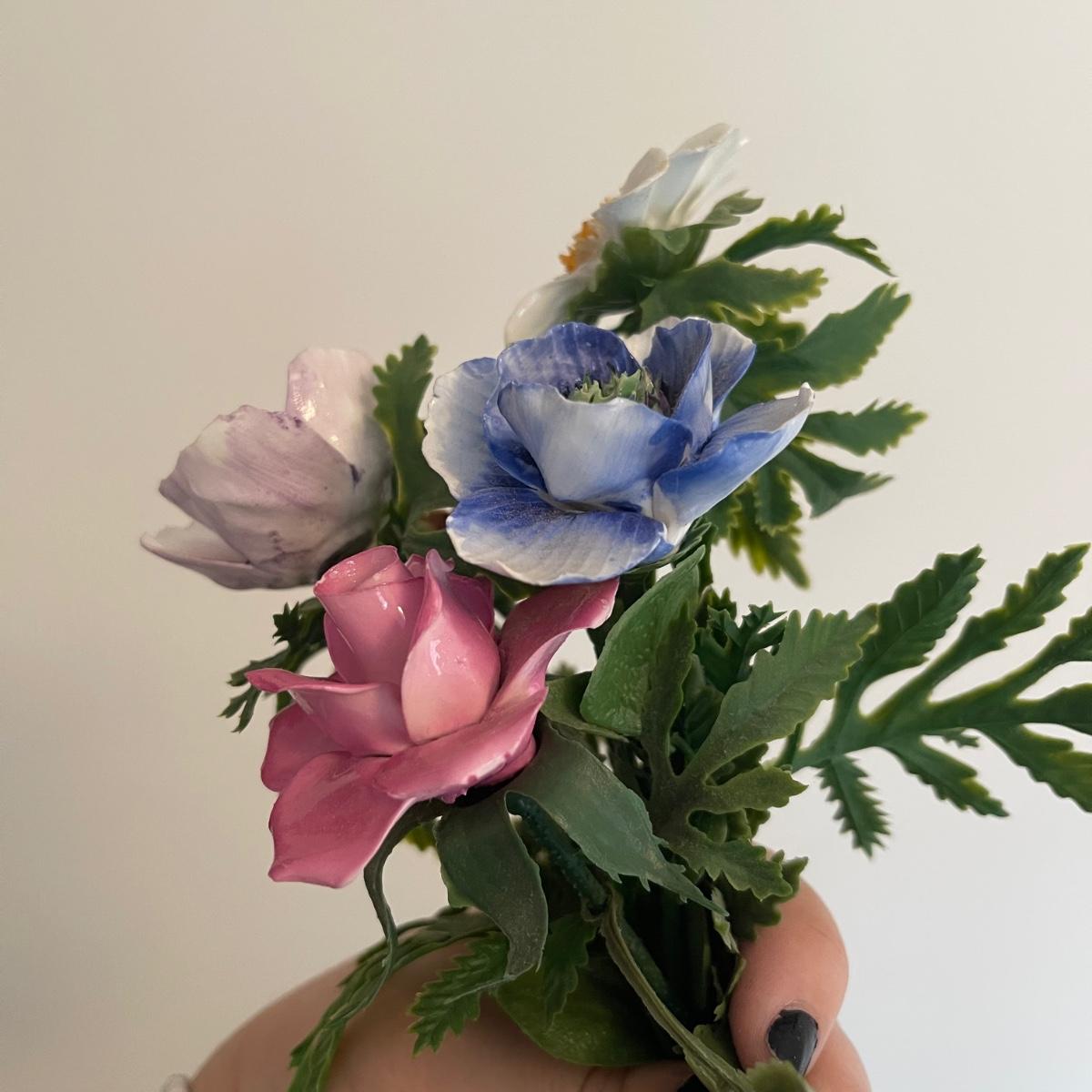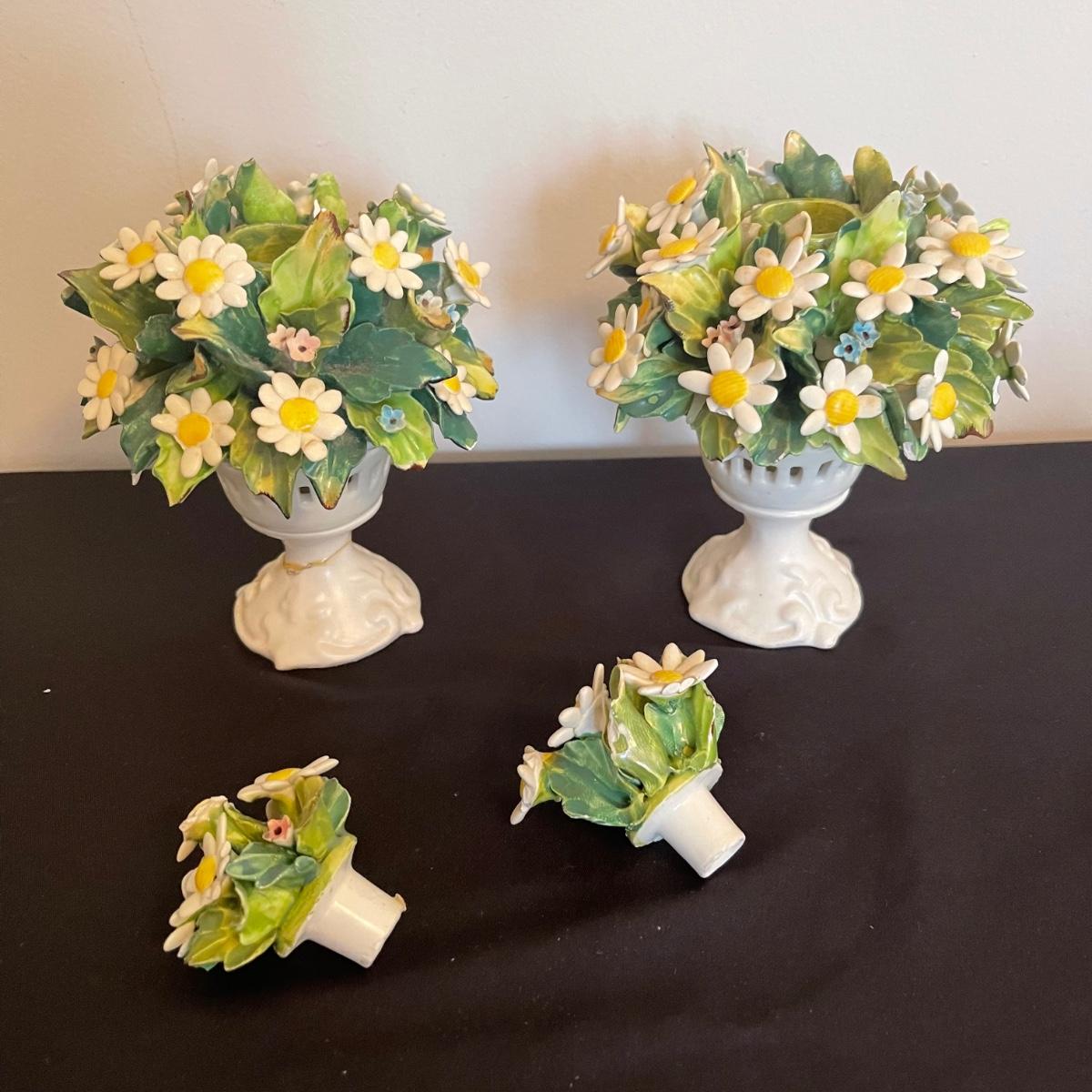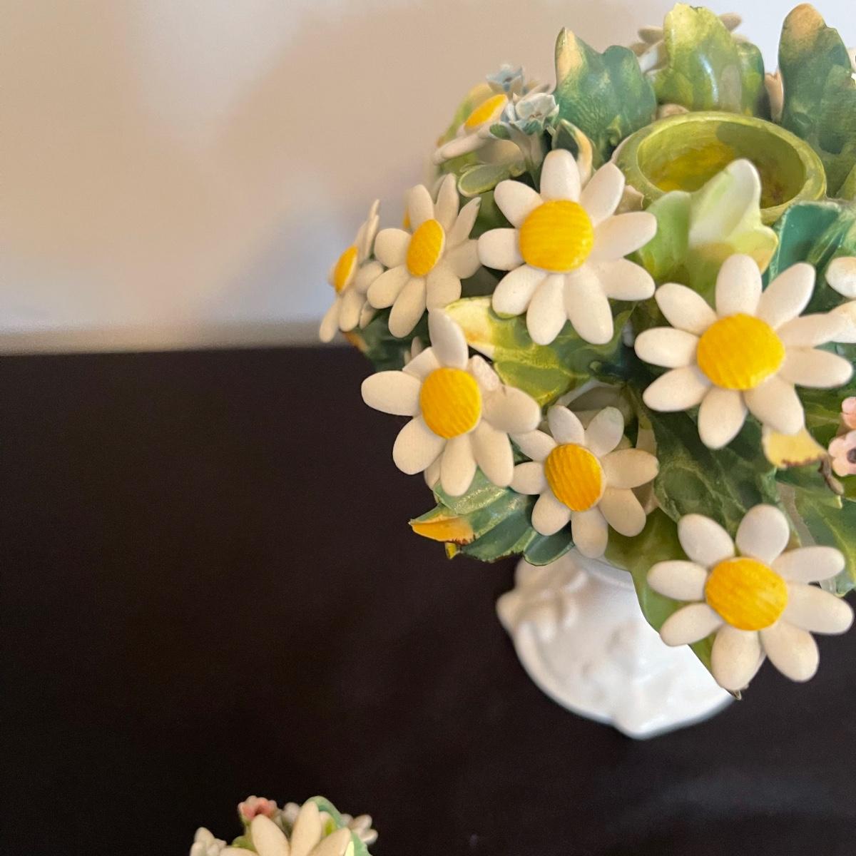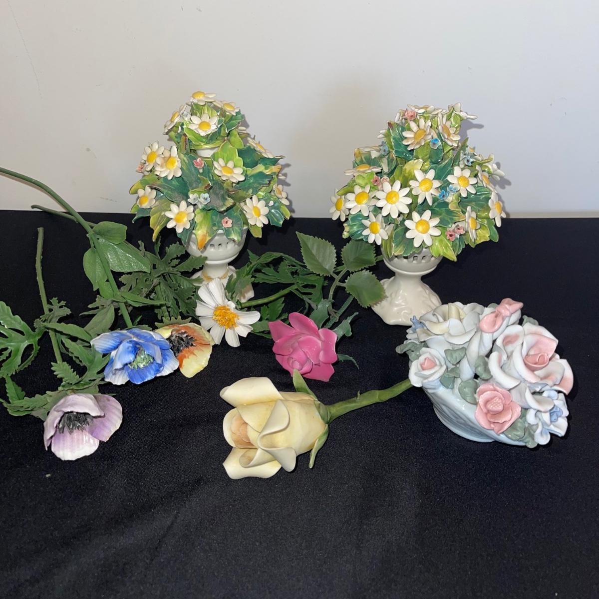 Starting this lot is a matching pair of ceramic candlestick holders. They’re made in Italy and look like flowers in a basket and the very top pieces remove for the candles. There are some chips and broken pieces due to the fragility of the porcelain. Next, a single ceramic tulip, also made in Italy. A small ceramic basket of flowers sculpture is included, it has no signature. Lastly, five plastic stemmed flowers with what appears to be dainty ceramic flower heads.