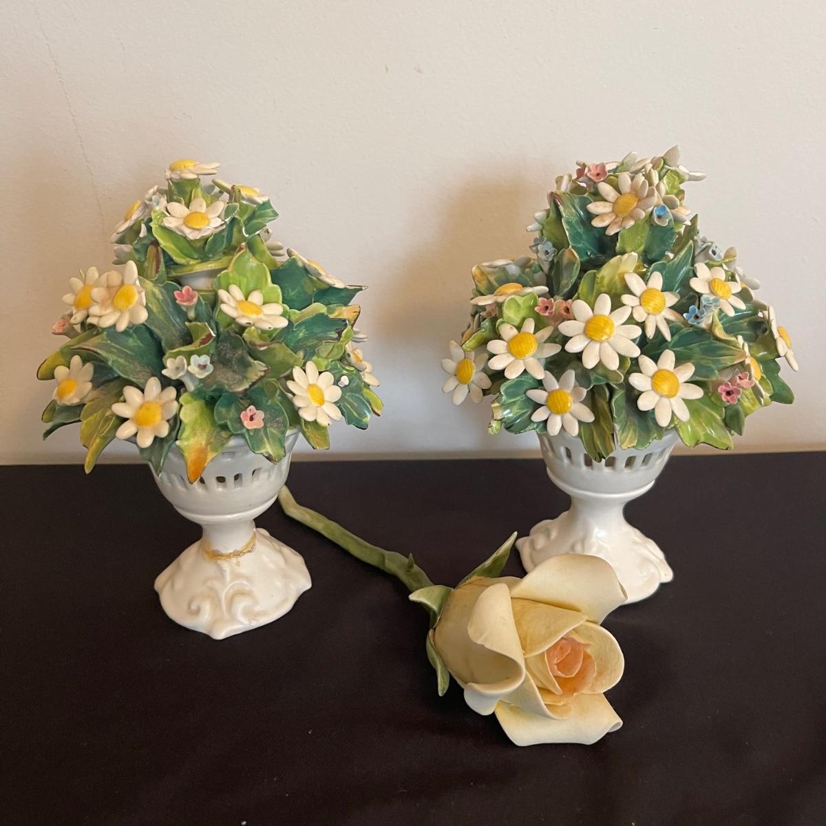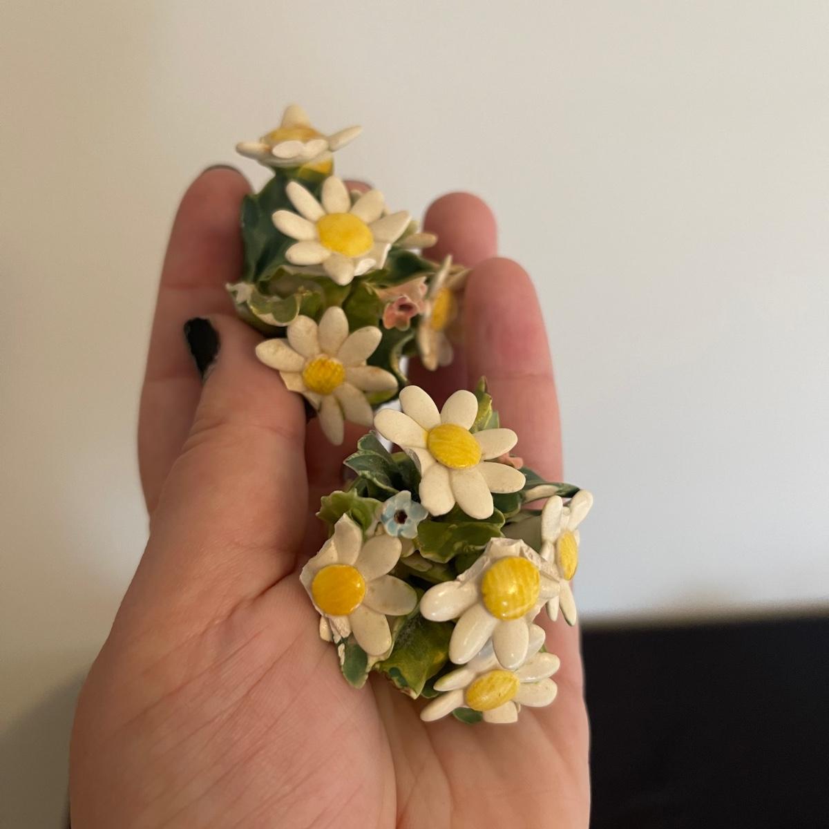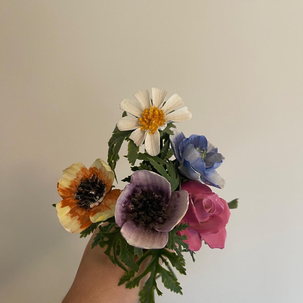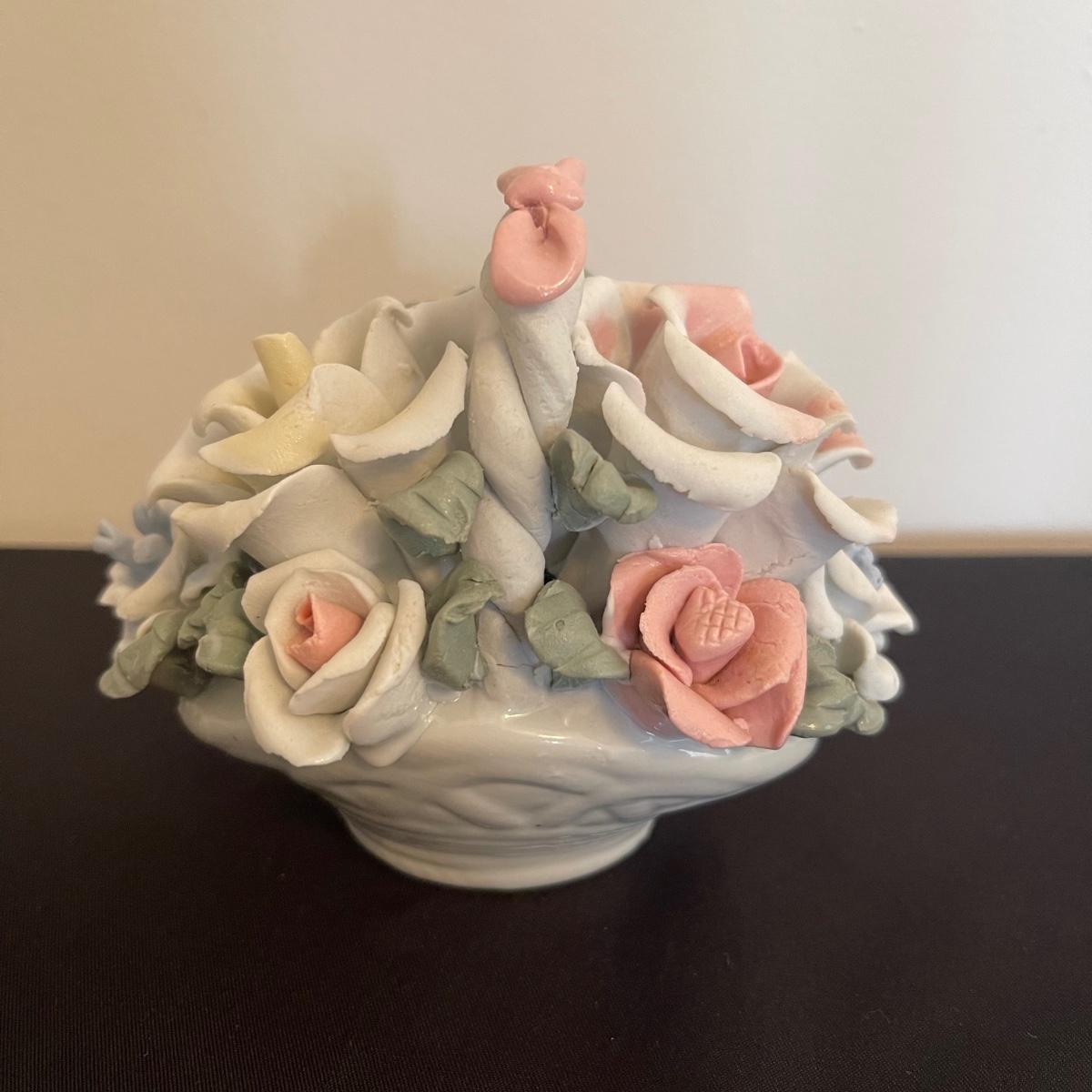 Starting this lot is a matching pair of ceramic candlestick holders. They’re made in Italy and look like flowers in a basket and the very top pieces remove for the candles. There are some chips and broken pieces due to the fragility of the porcelain. Next, a single ceramic tulip, also made in Italy. A small ceramic basket of flowers sculpture is included, it has no signature. Lastly, five plastic stemmed flowers with what appears to be dainty ceramic flower heads.