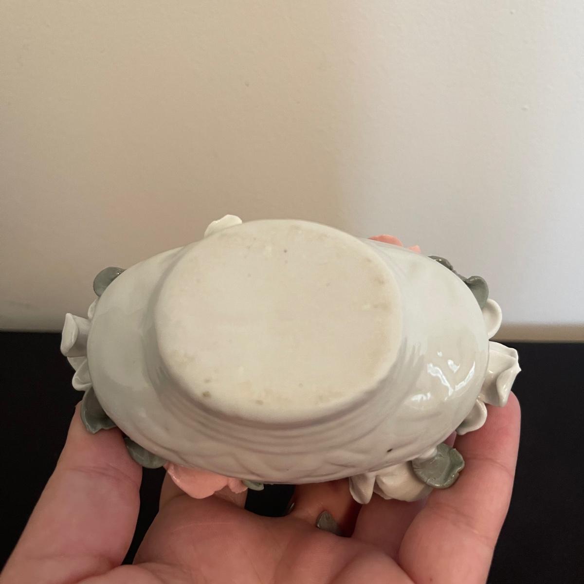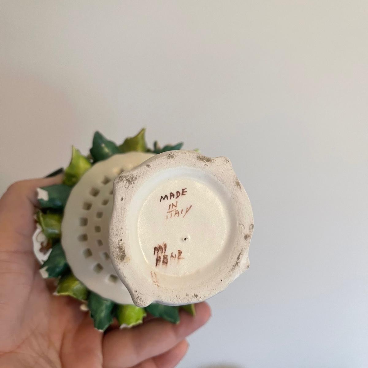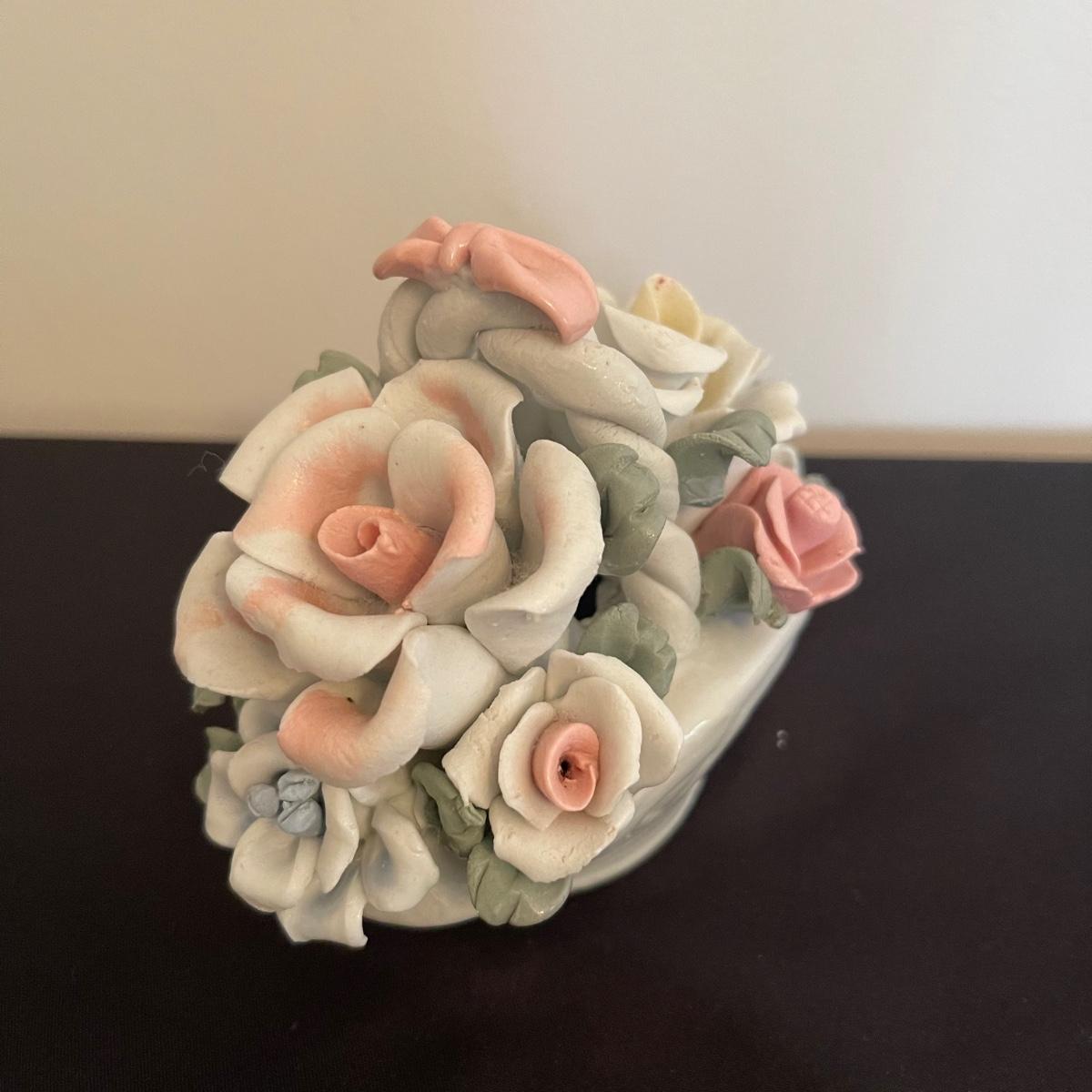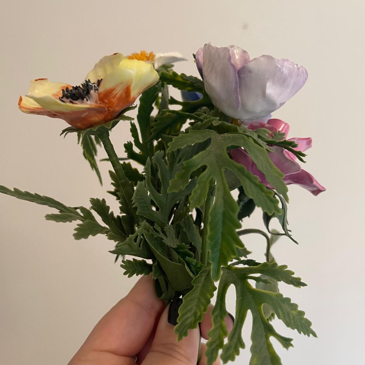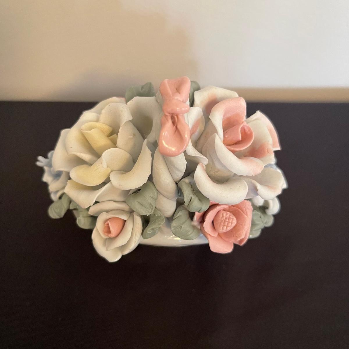 Starting this lot is a matching pair of ceramic candlestick holders. They’re made in Italy and look like flowers in a basket and the very top pieces remove for the candles. There are some chips and broken pieces due to the fragility of the porcelain. Next, a single ceramic tulip, also made in Italy. A small ceramic basket of flowers sculpture is included, it has no signature. Lastly, five plastic stemmed flowers with what appears to be dainty ceramic flower heads.