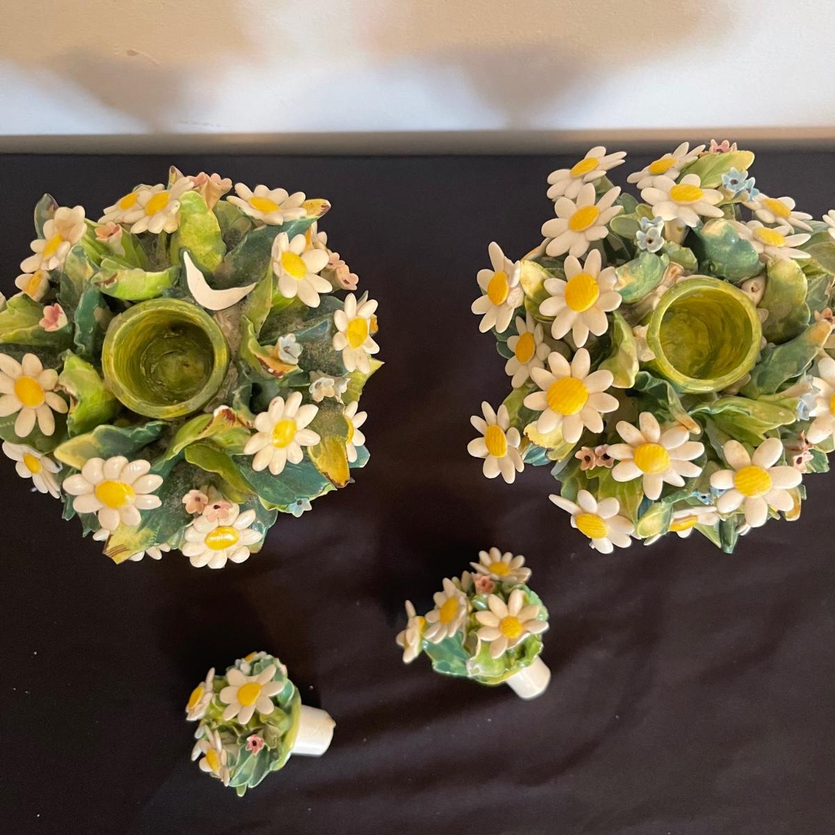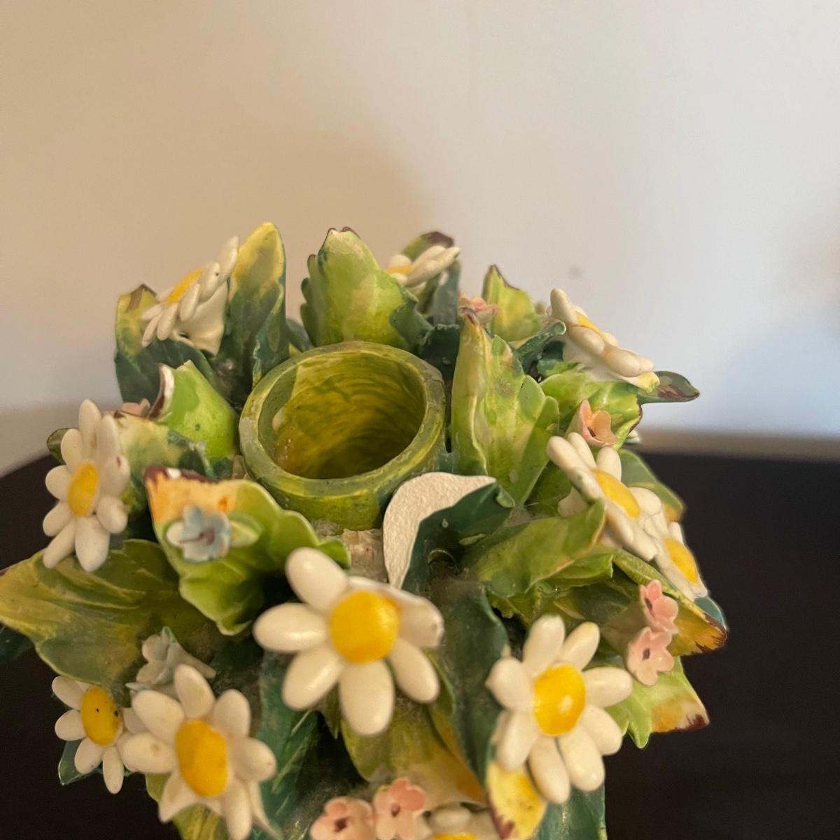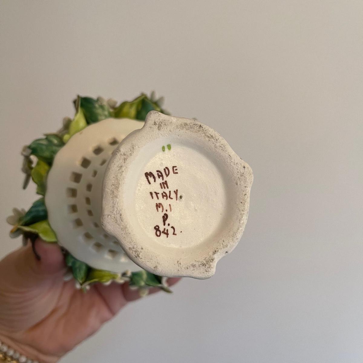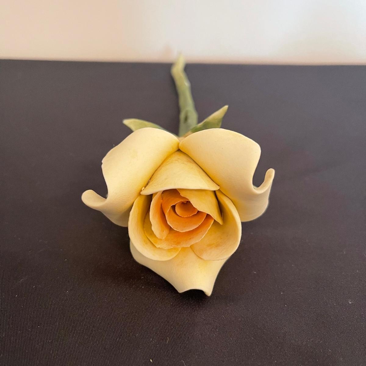 Starting this lot is a matching pair of ceramic candlestick holders. They’re made in Italy and look like flowers in a basket and the very top pieces remove for the candles. There are some chips and broken pieces due to the fragility of the porcelain. Next, a single ceramic tulip, also made in Italy. A small ceramic basket of flowers sculpture is included, it has no signature. Lastly, five plastic stemmed flowers with what appears to be dainty ceramic flower heads.