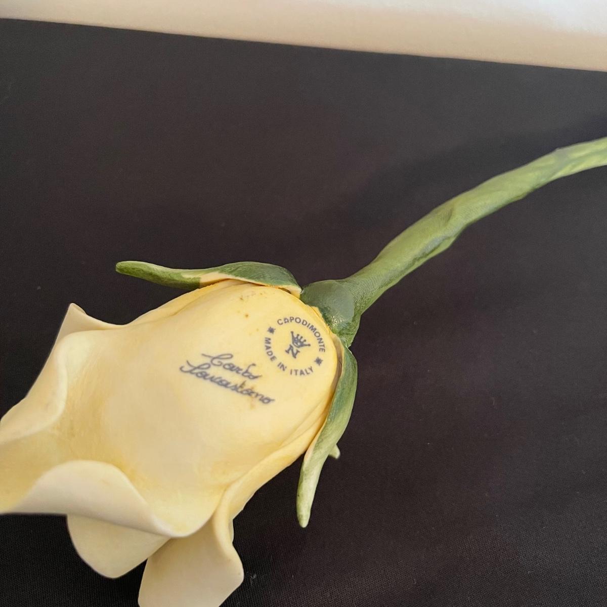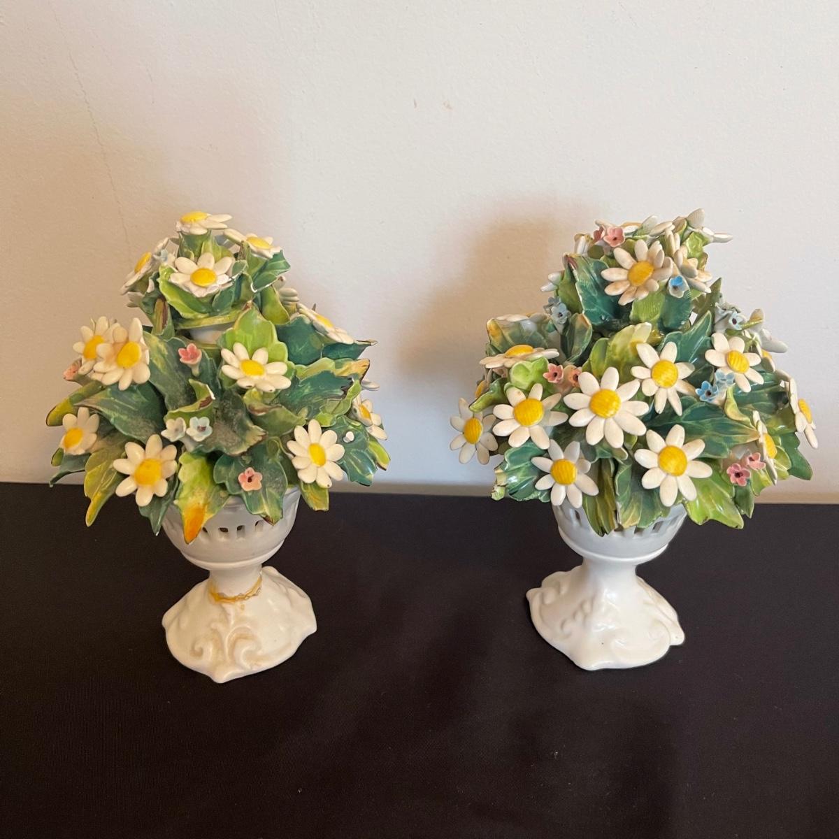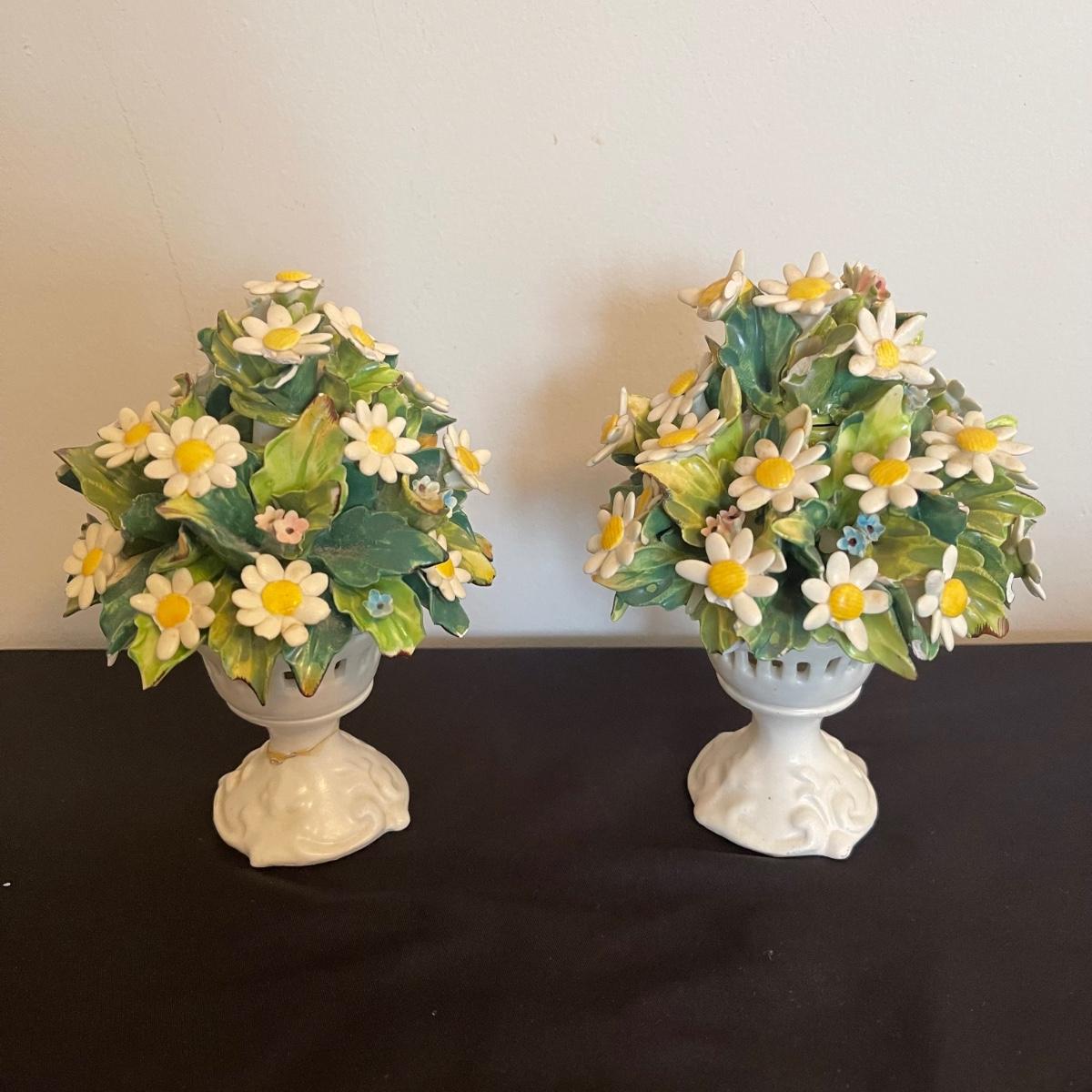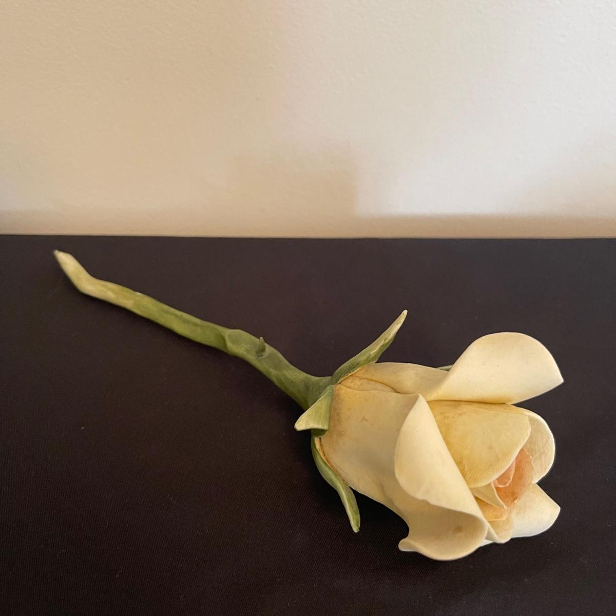 Starting this lot is a matching pair of ceramic candlestick holders. They’re made in Italy and look like flowers in a basket and the very top pieces remove for the candles. There are some chips and broken pieces due to the fragility of the porcelain. Next, a single ceramic tulip, also made in Italy. A small ceramic basket of flowers sculpture is included, it has no signature. Lastly, five plastic stemmed flowers with what appears to be dainty ceramic flower heads.
