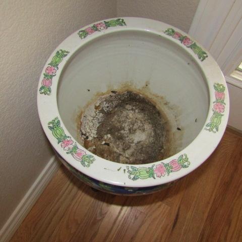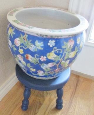 CERAMIC POT WITH FLORAL DESIGN ON WOODEN STAND