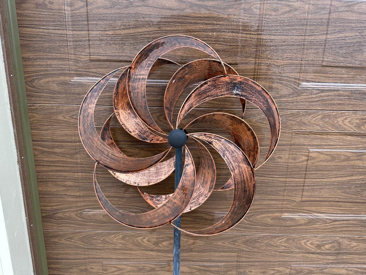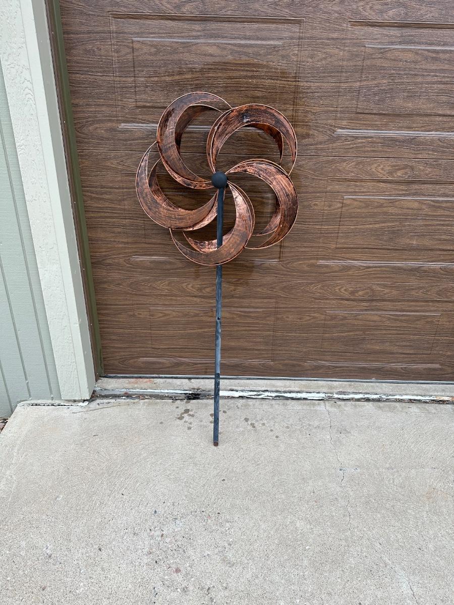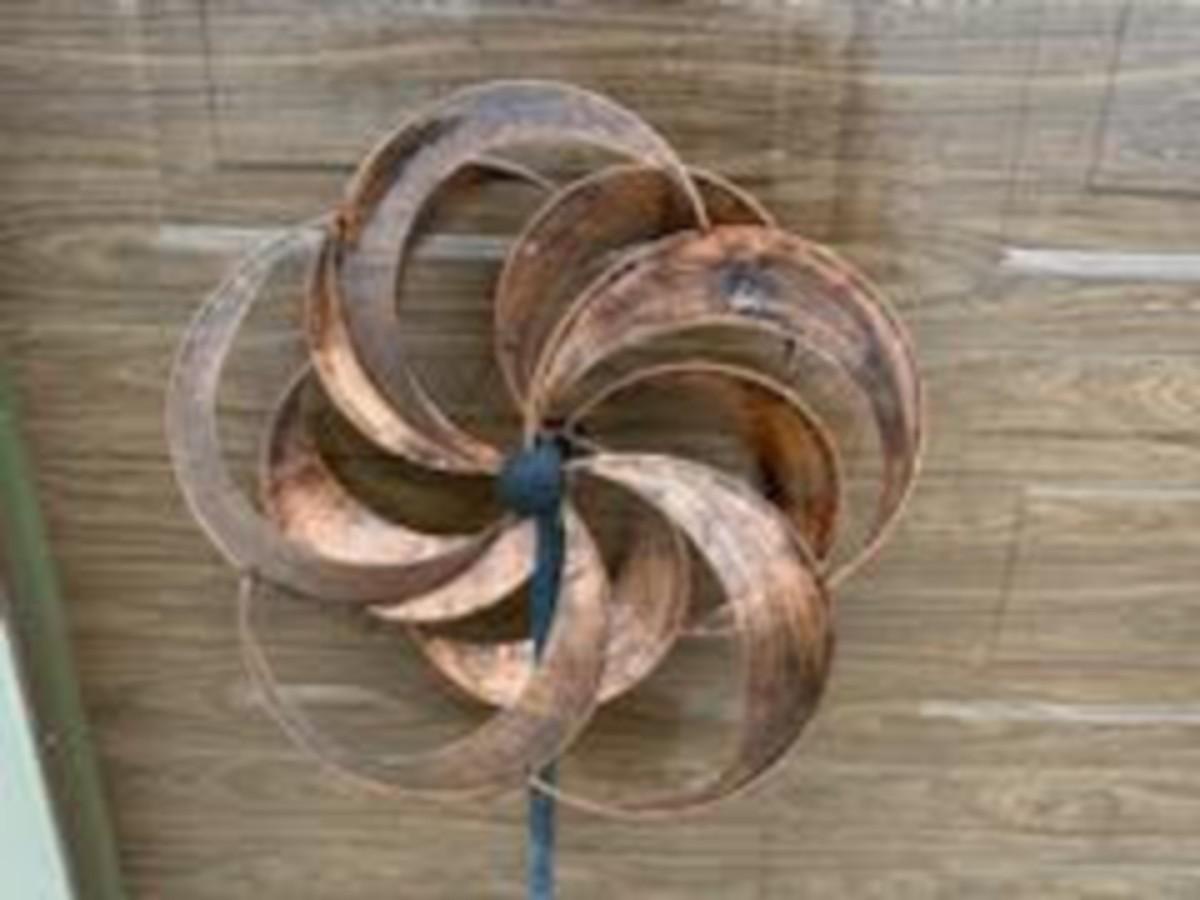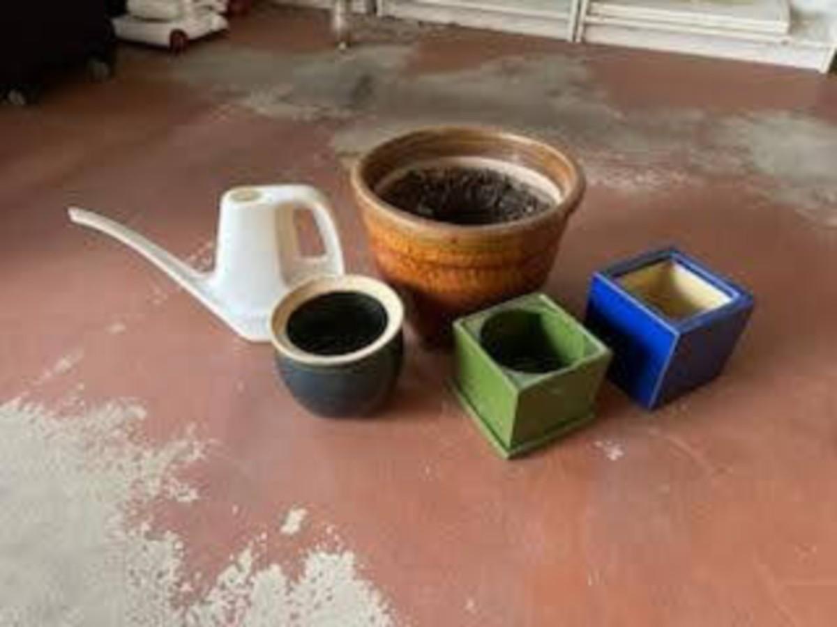 SPINNING YARD ART, CERAMIC FLOWER POTS AND WATERING CAN