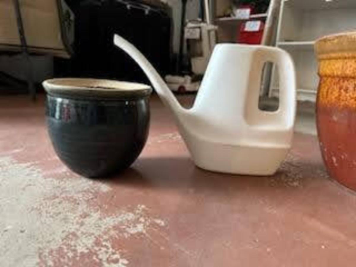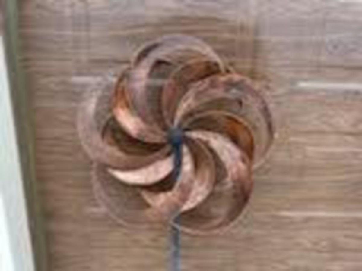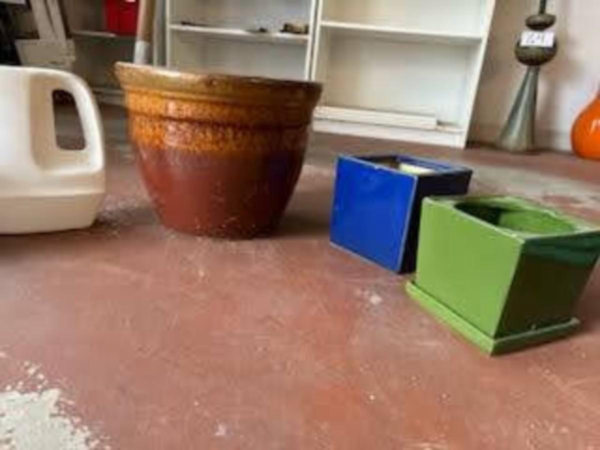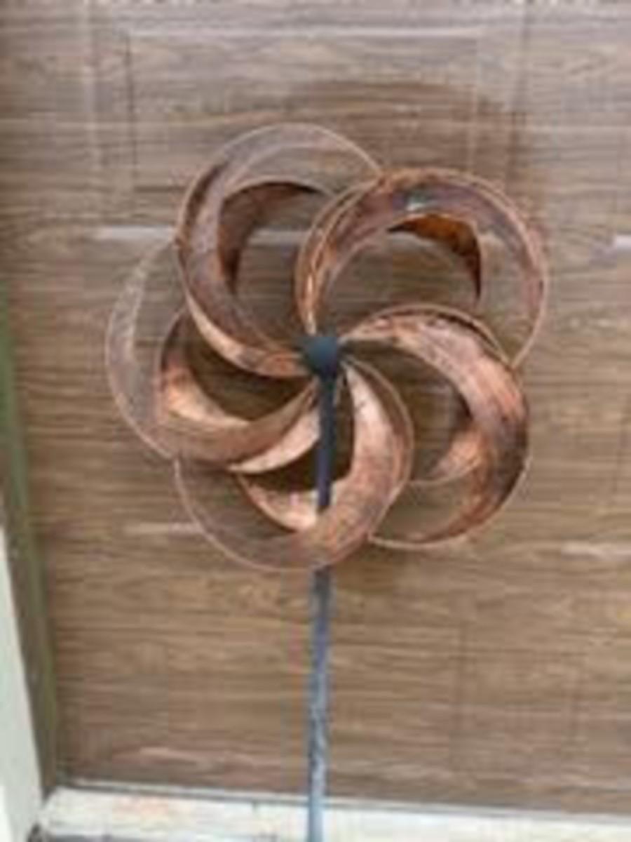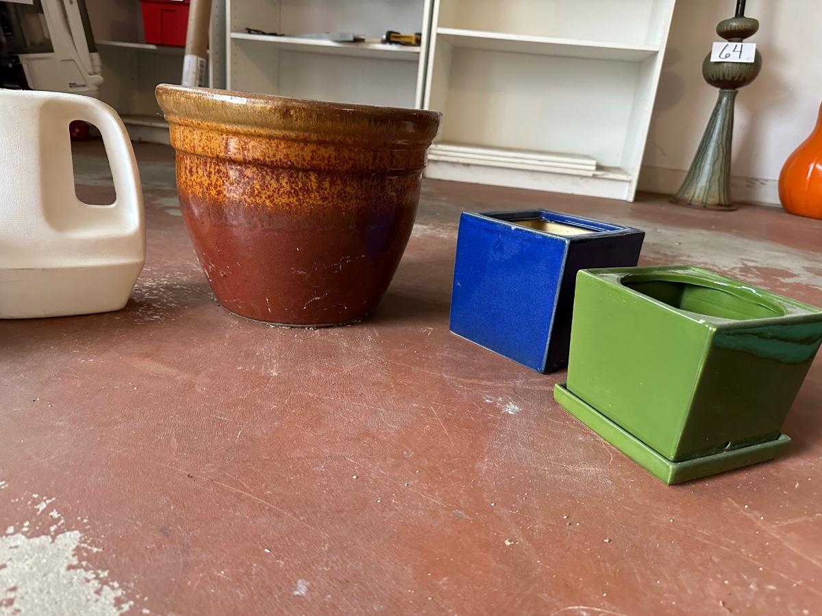 SPINNING YARD ART, CERAMIC FLOWER POTS AND WATERING CAN